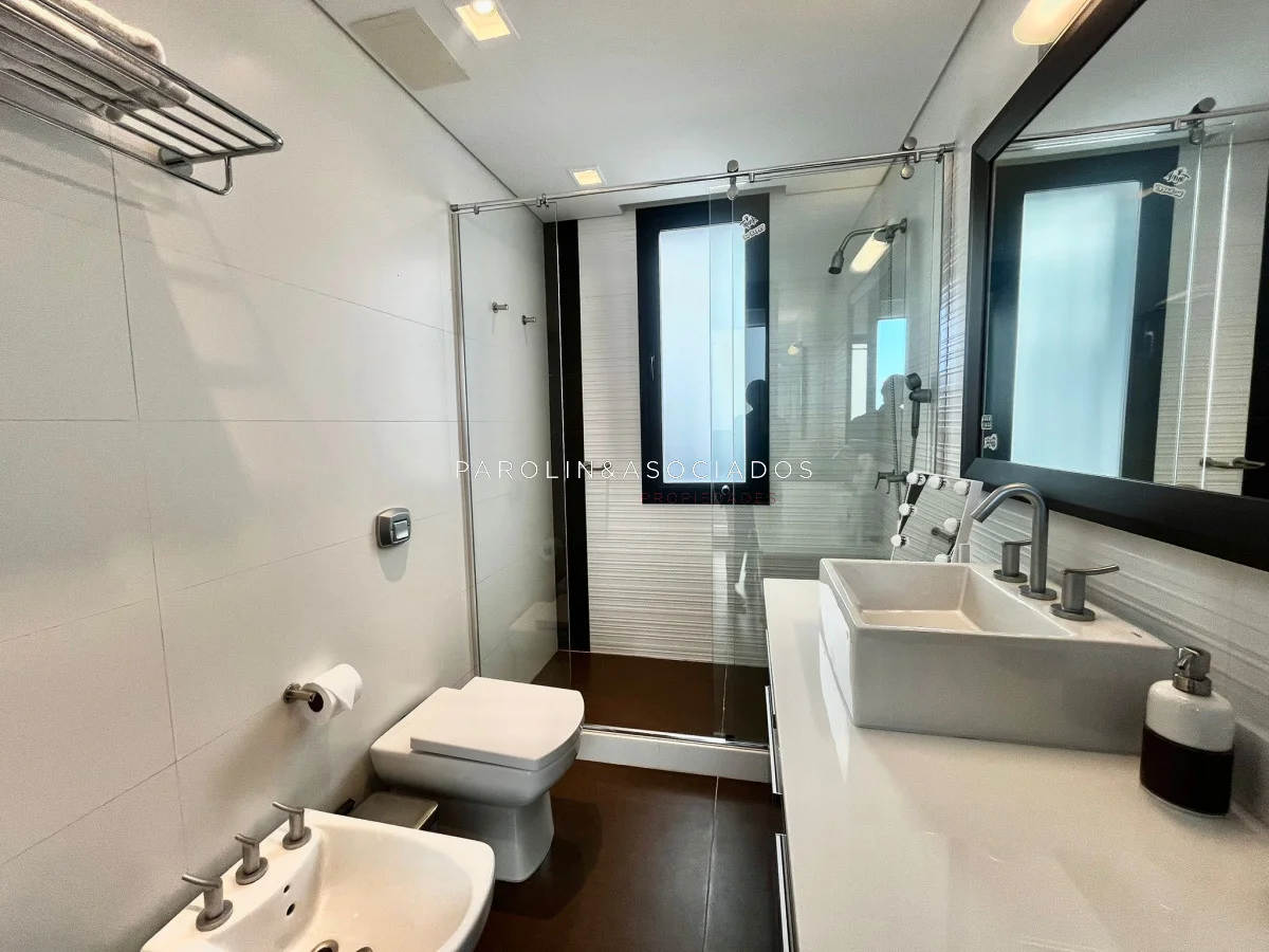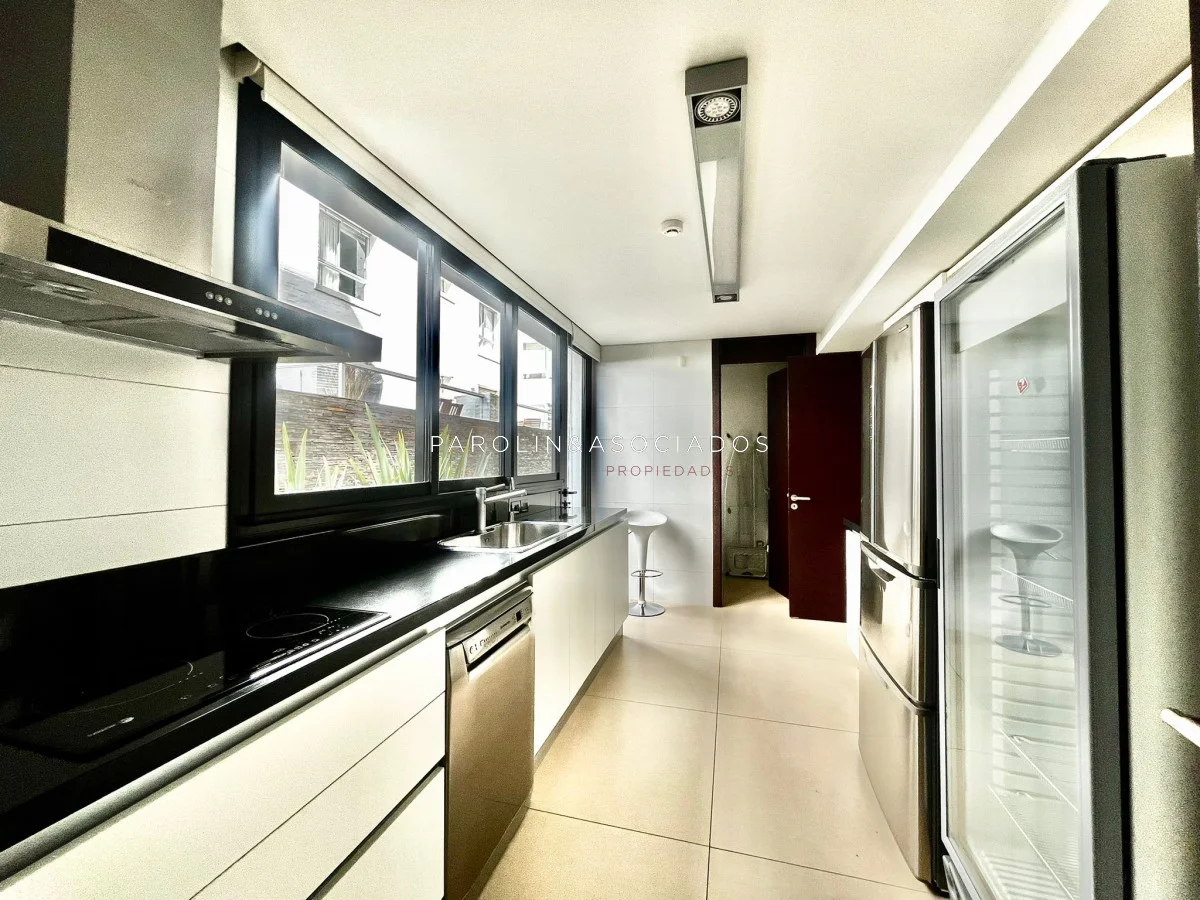 SI recorremos la unidad hacia el contra-frente disponemos de tres dormitorios en suite. La cocina es definida y con entrada de servicio, lavadero y dependencia con baño. Toda la unidad esta finamente equipada. Para acceder a la misma se hace desde recepción en un ascensor privado que directamente para en el living. Además, cuenta con triple cochera para sus vehículos.