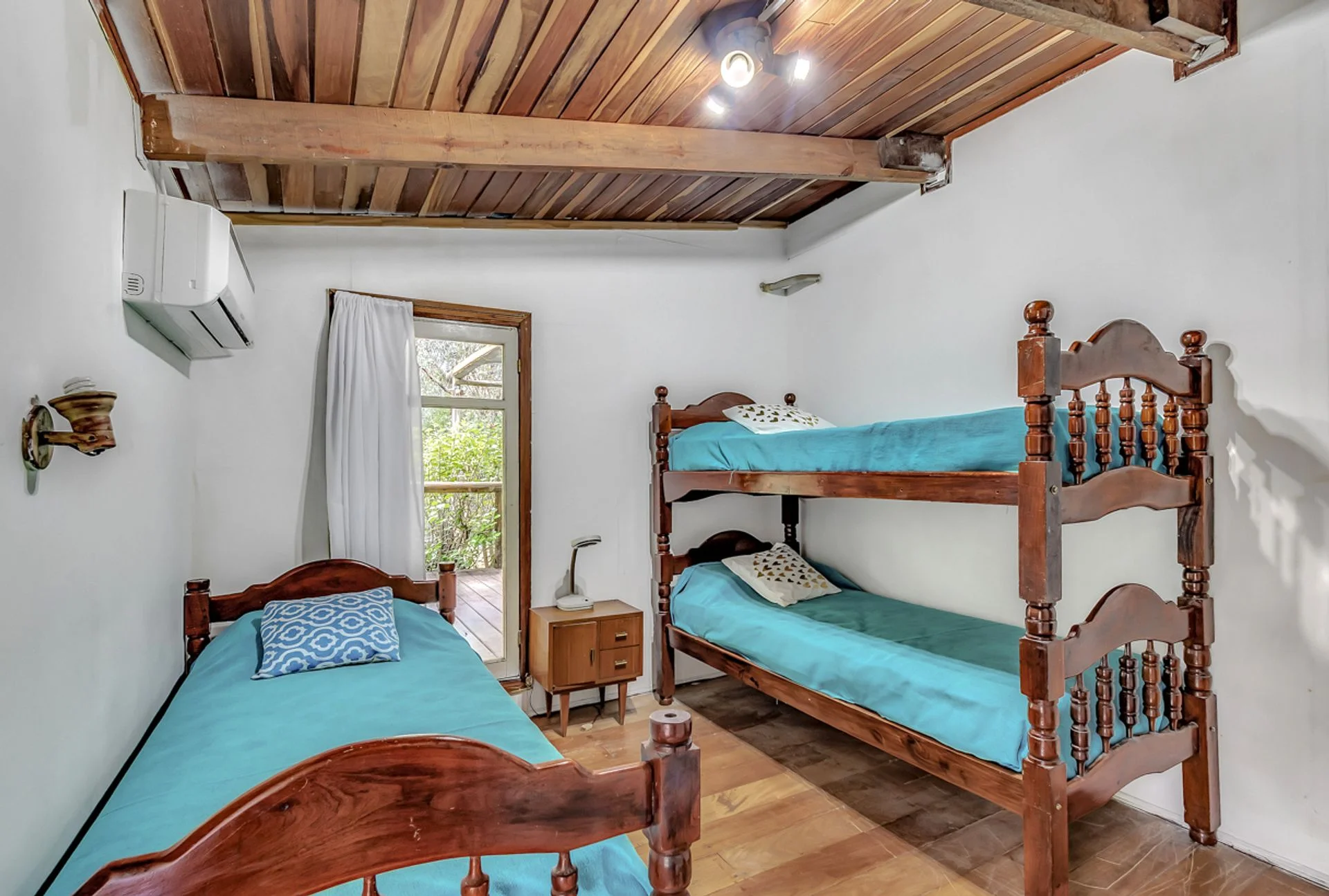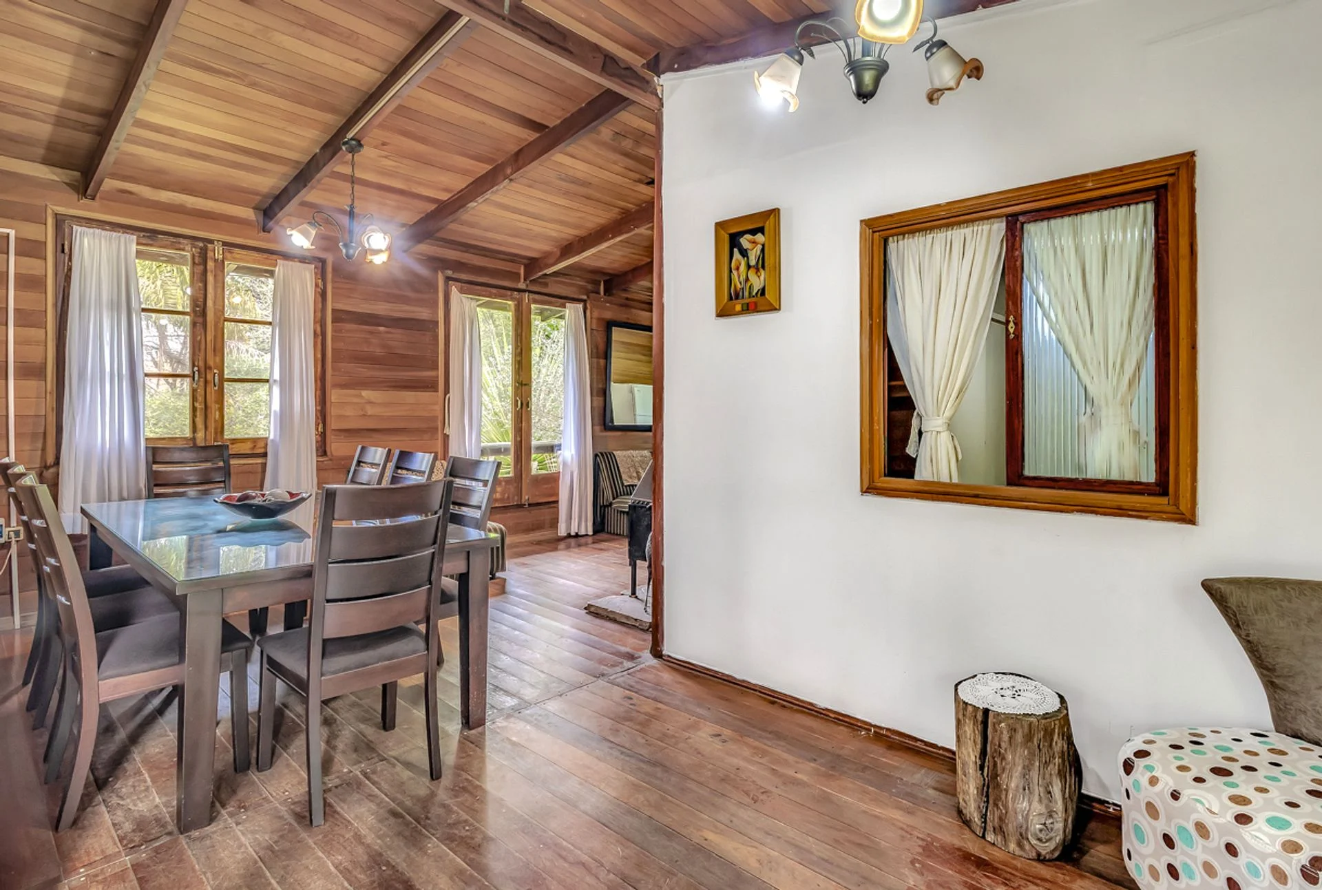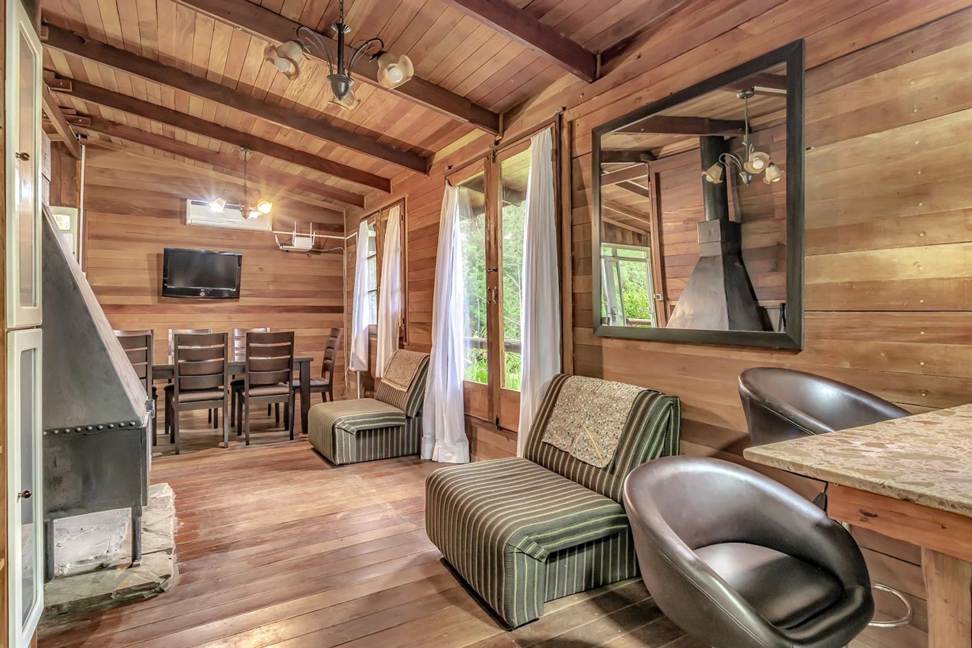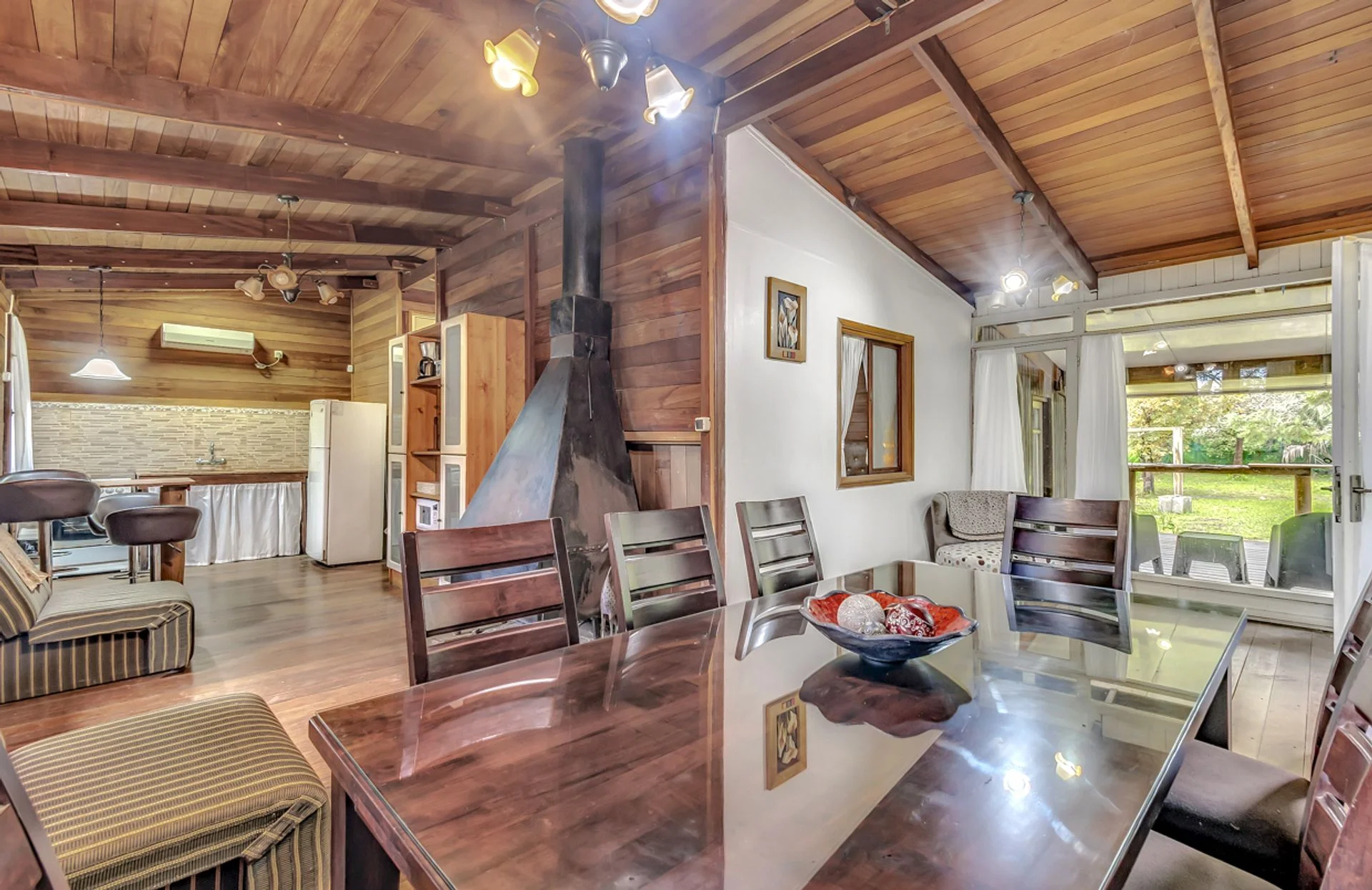 El living-comedor, con amplios ventanales, se integra a una cocina equipada con desayunador. La propiedad cuenta además con calefacción por chimenea y aire acondicionado en todos los ambientes, brindando confort durante todo el año.