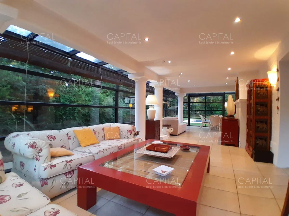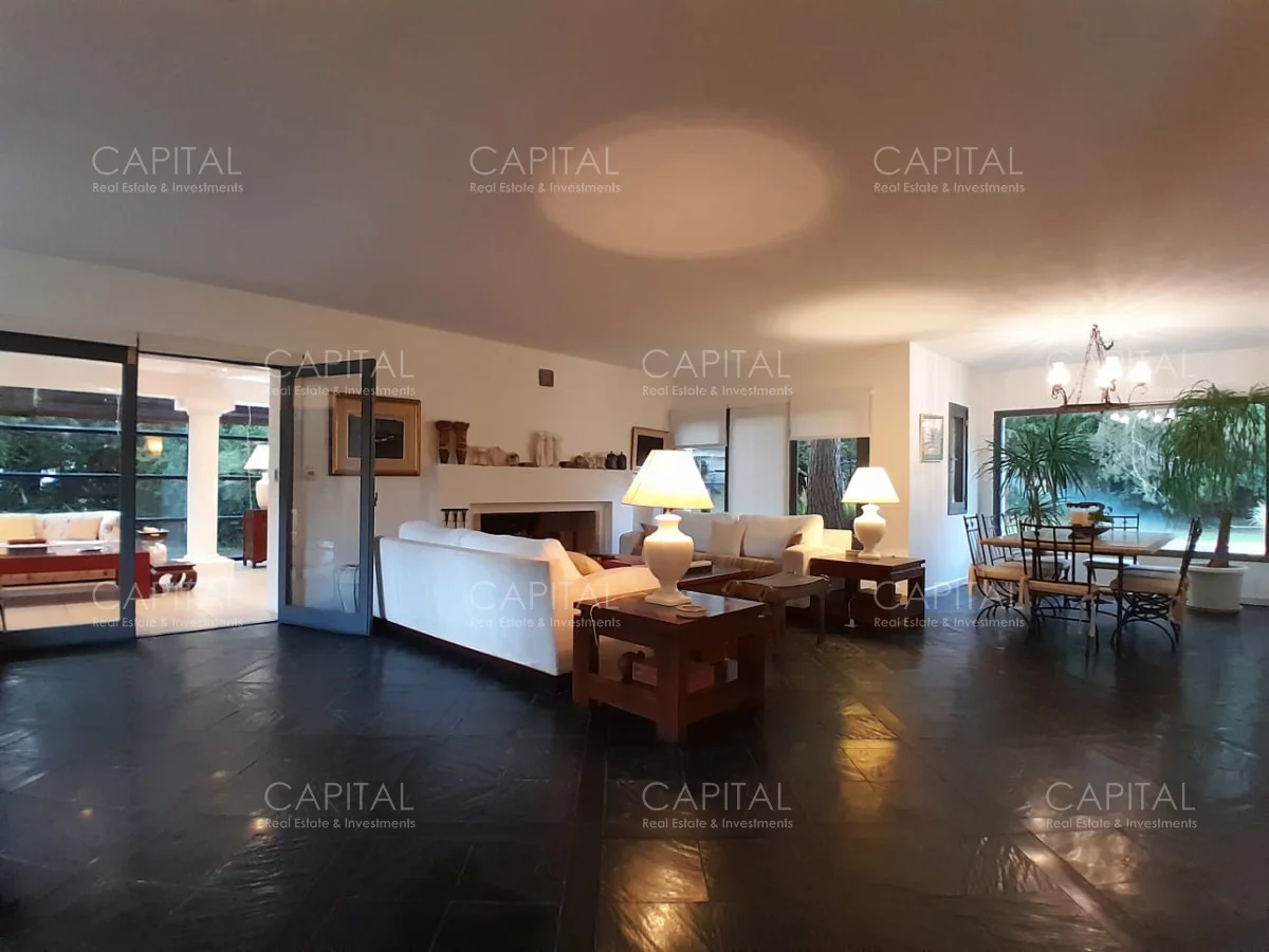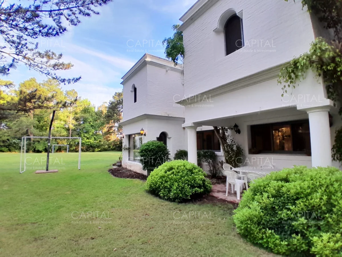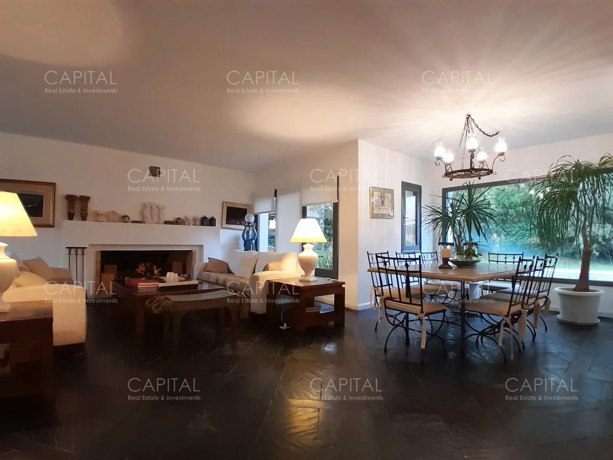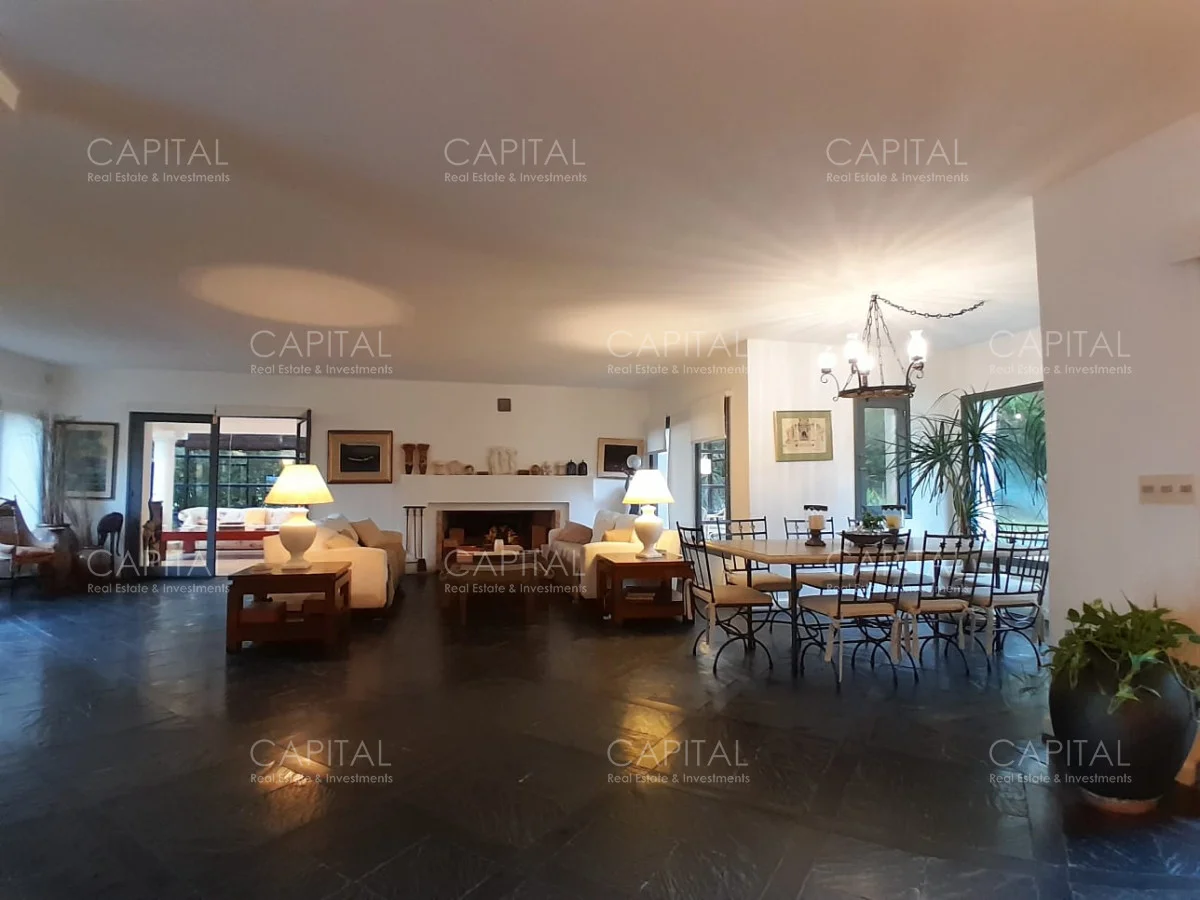 En un lote de 3400 m2 esta espléndida propiedad cuenta con un espacioso living con hogar a leña de alto rendimiento y grandes ventanales que permiten disfrutar el jardín desde el interior de la casa. Comedor diario y estar. Cinco dormitorios en suite, más toilette y escritorio. Amplia cocina definida, completamente equipada.