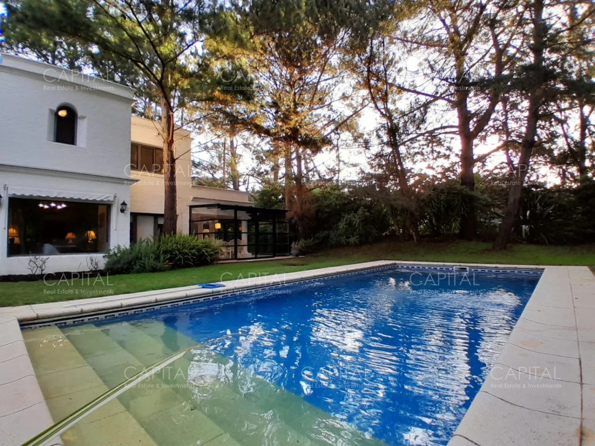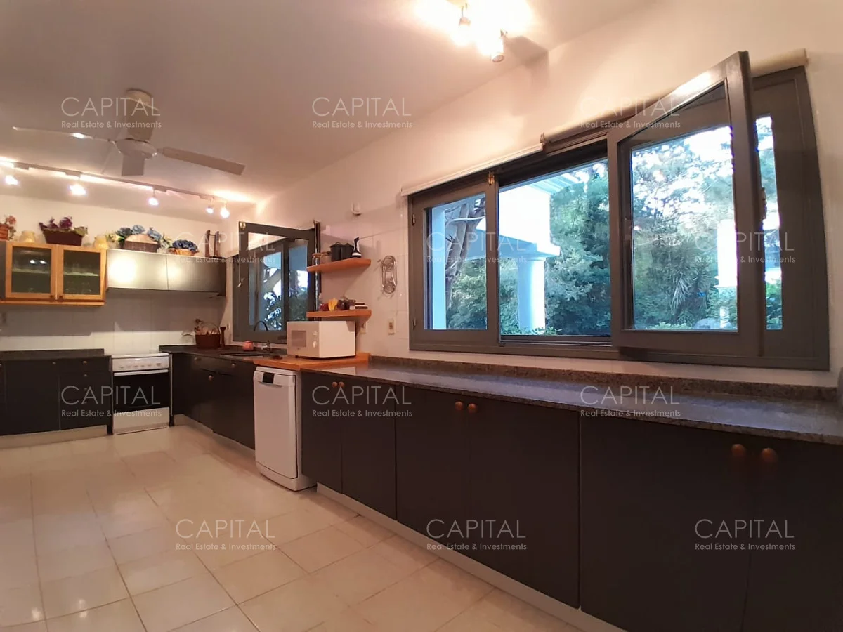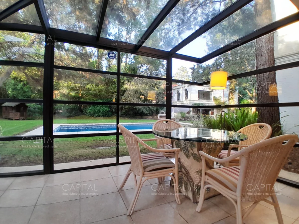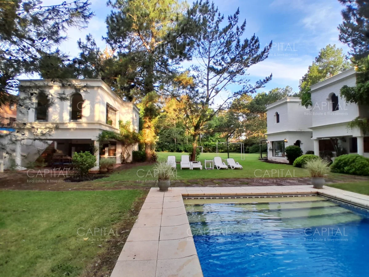 En un lote de 3400 m2 esta espléndida propiedad cuenta con un espacioso living con hogar a leña de alto rendimiento y grandes ventanales que permiten disfrutar el jardín desde el interior de la casa. Comedor diario y estar. Cinco dormitorios en suite, más toilette y escritorio. Amplia cocina definida, completamente equipada.