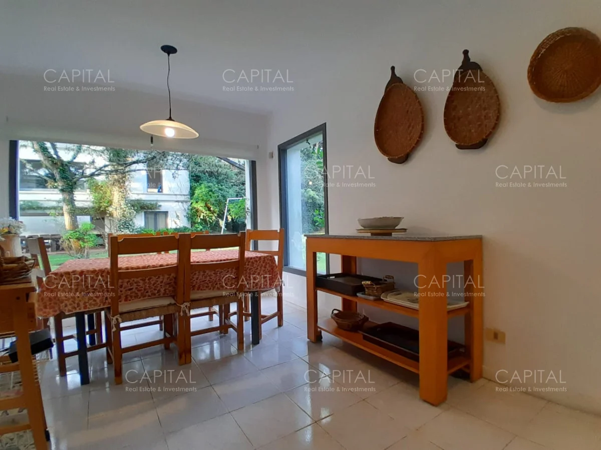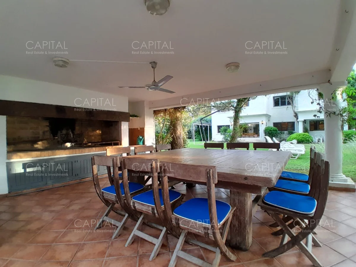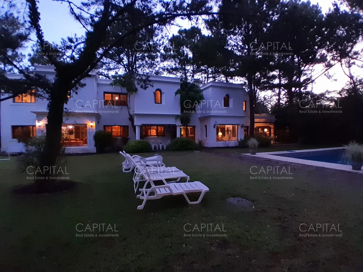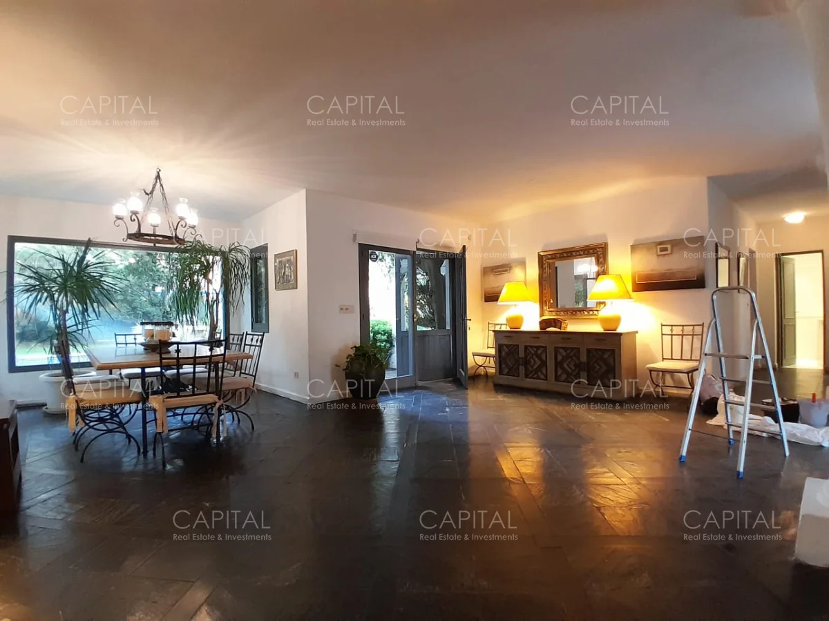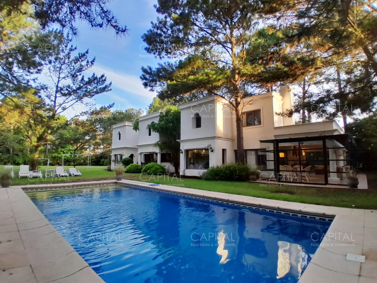 En un lote de 3400 m2 esta espléndida propiedad cuenta con un espacioso living con hogar a leña de alto rendimiento y grandes ventanales que permiten disfrutar el jardín desde el interior de la casa. Comedor diario y estar. Cinco dormitorios en suite, más toilette y escritorio. Amplia cocina definida, completamente equipada.