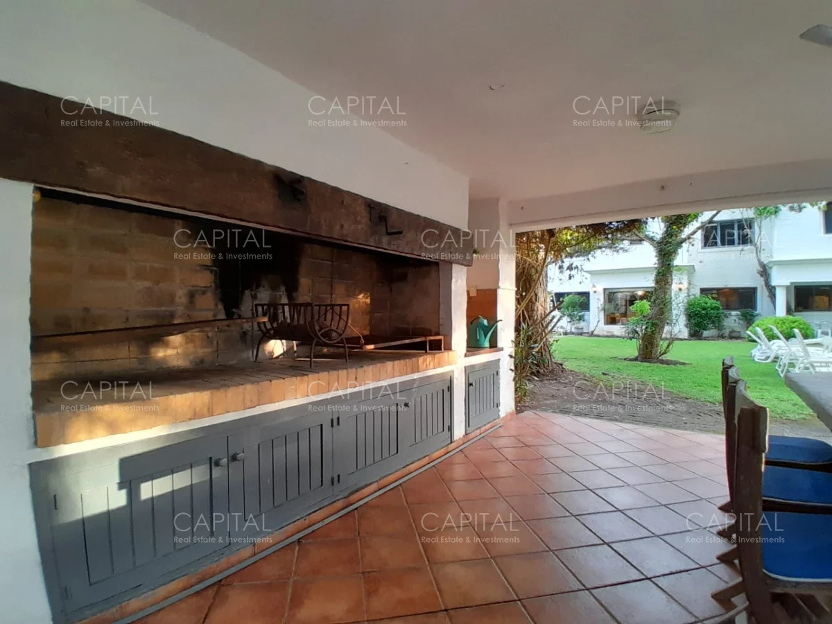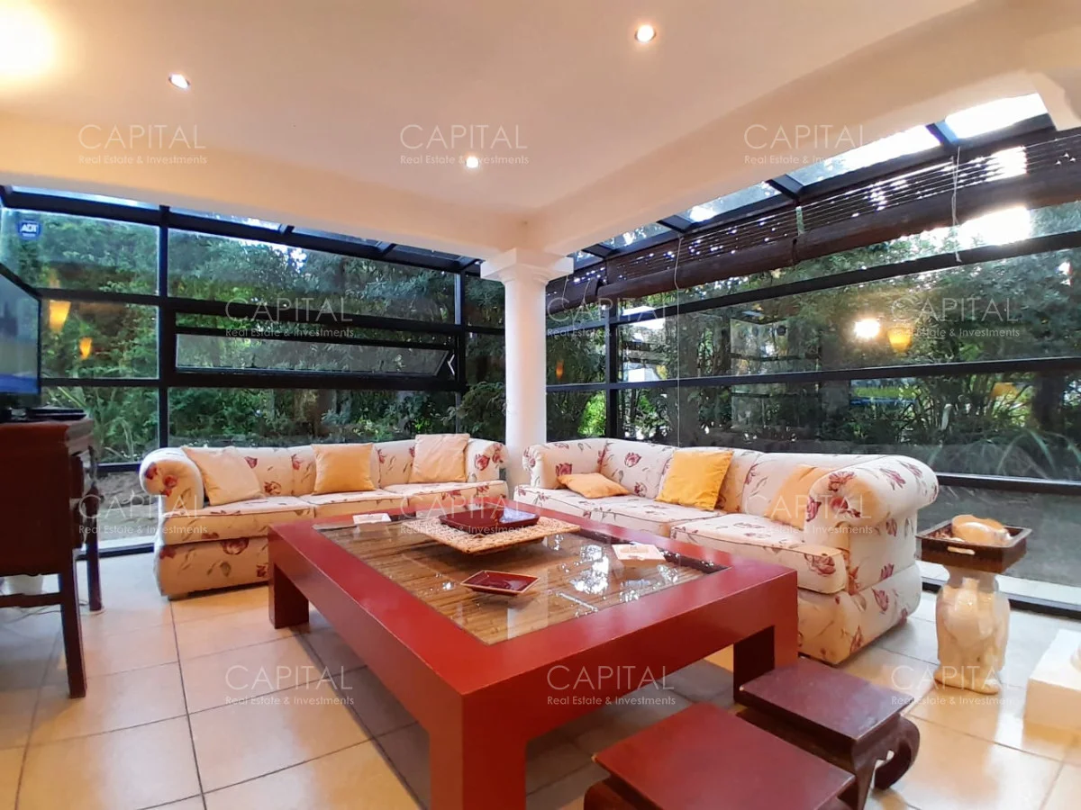 Jardín que rodea toda la casa, con cerramiento de cerco vivo, ofreciendo una vista despejada y verde desde cualquier rincón. Aquí se ubica el parrillero techado con living exterior y excepcional piscina climatizada.