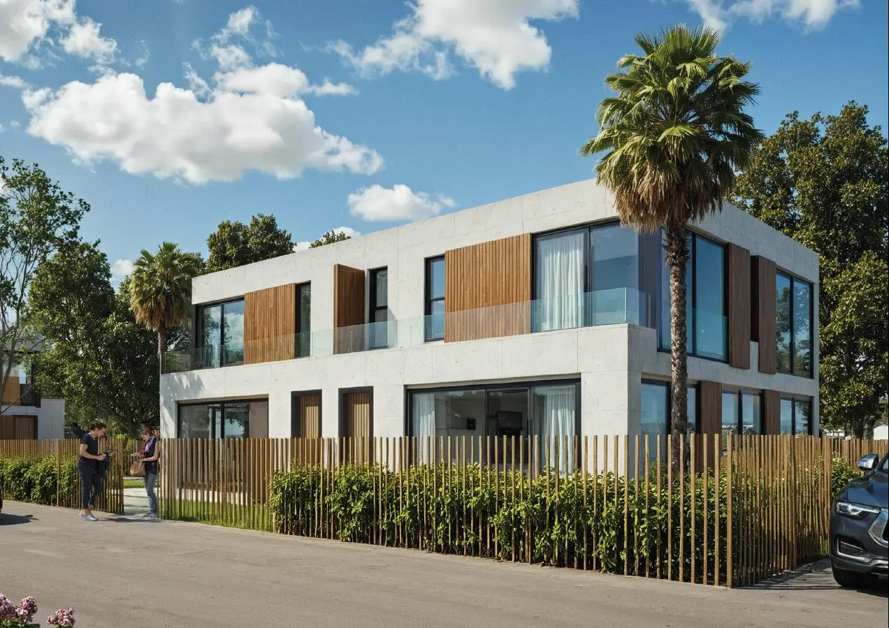 El conjunto presenta una estructura portante de hormigón armado, con muros exteriores realizados en mampostería tradicional y terminaciones que combinan revestimientos y pinturas de alta durabilidad, lo que garantiza solidez constructiva y bajo mantenimiento a lo largo del tiempo.
