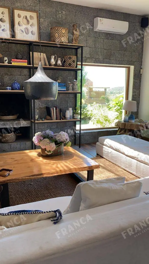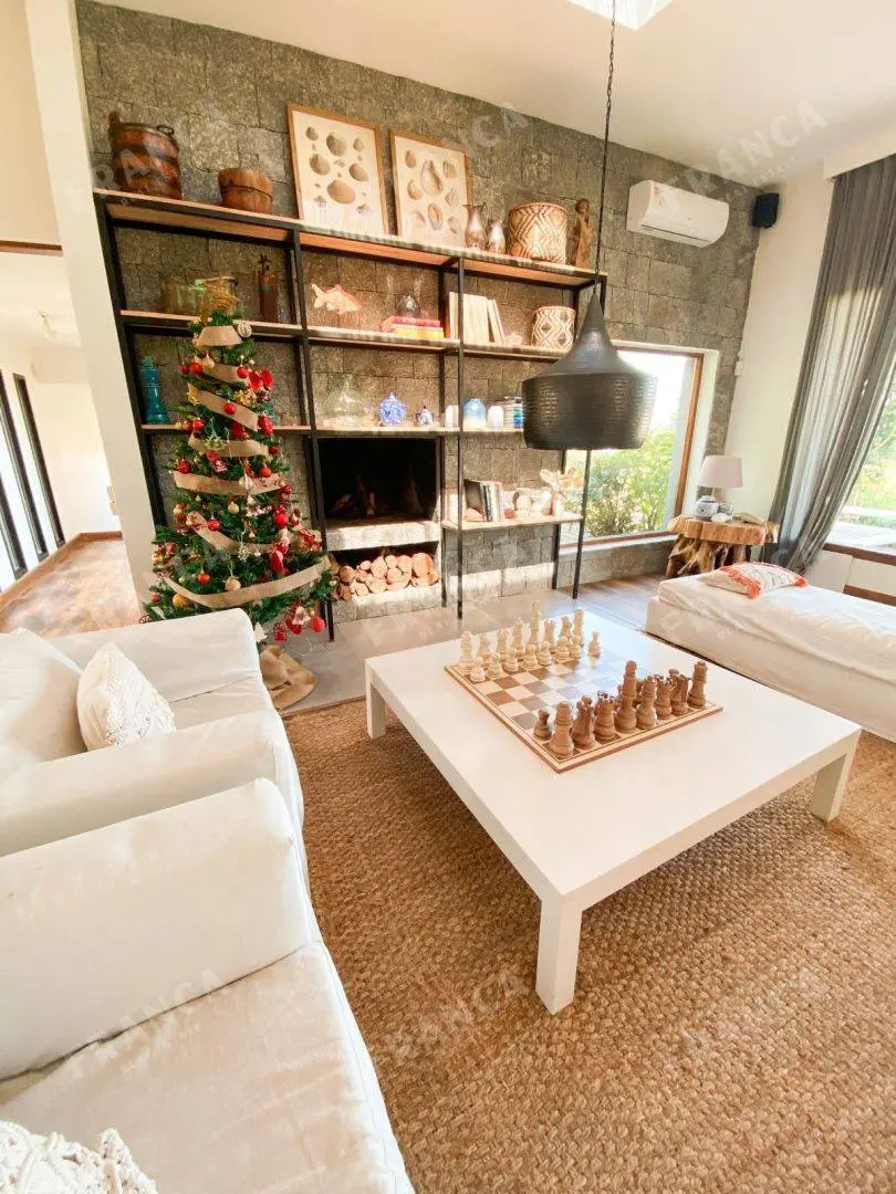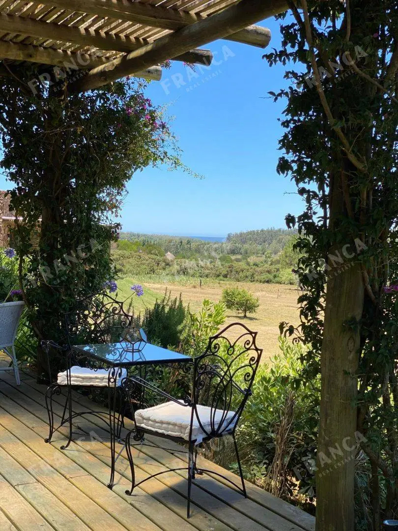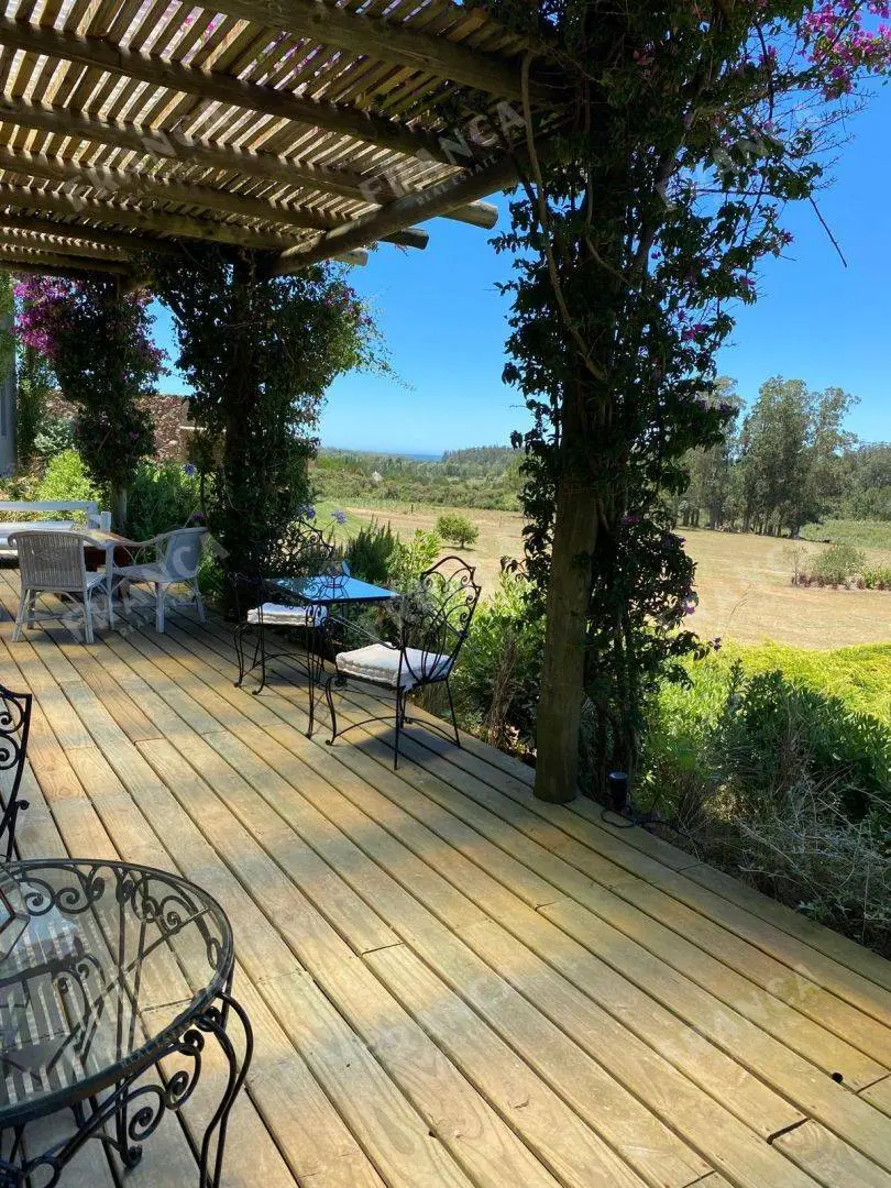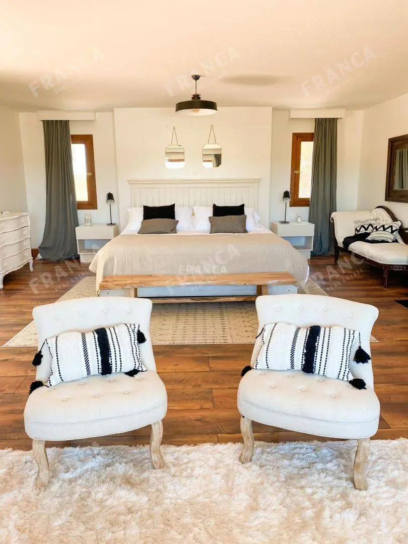 La propiedad, de gran belleza y elegancia, consta de diversas construcciones que albergan siete dormitorios en suite. El espacioso salón y comedor se destacan por sus generosos ventanales, que permiten disfrutar de vistas panorámicas, complementados por una acogedora estufa a leña.