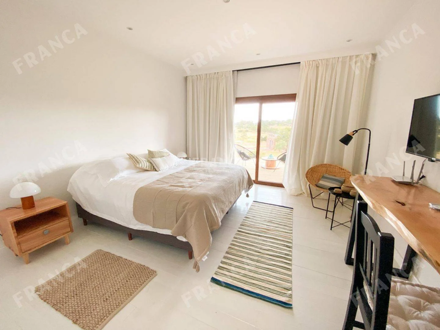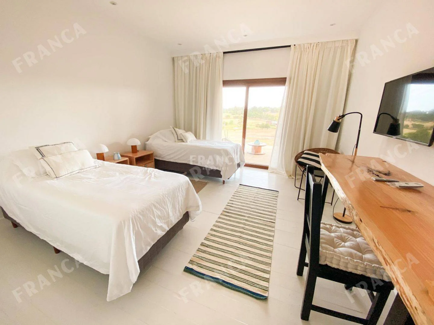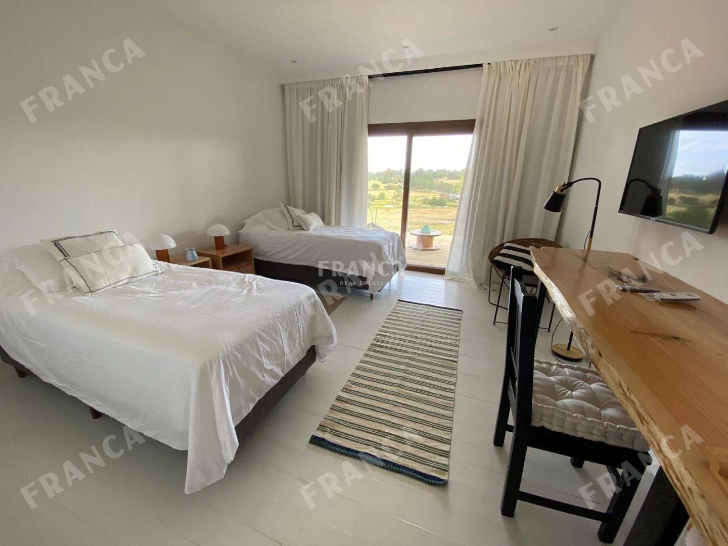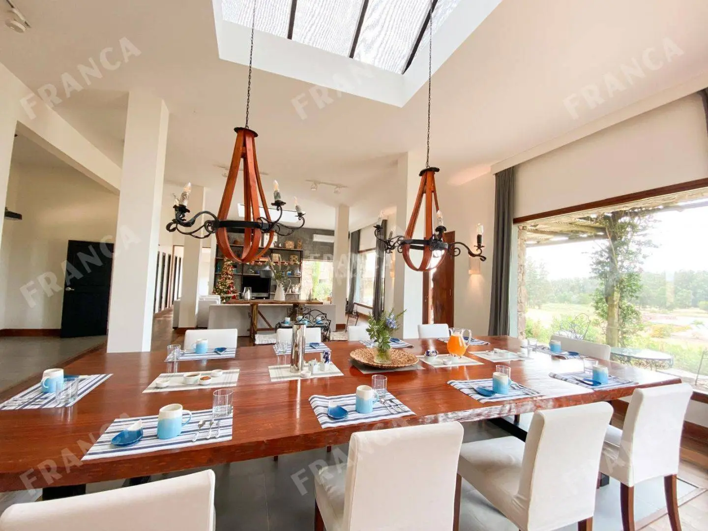 La propiedad, de gran belleza y elegancia, consta de diversas construcciones que albergan siete dormitorios en suite. El espacioso salón y comedor se destacan por sus generosos ventanales, que permiten disfrutar de vistas panorámicas, complementados por una acogedora estufa a leña.