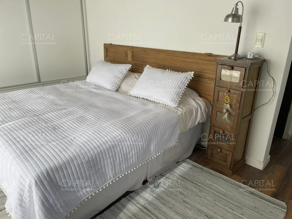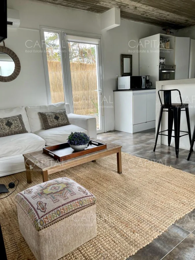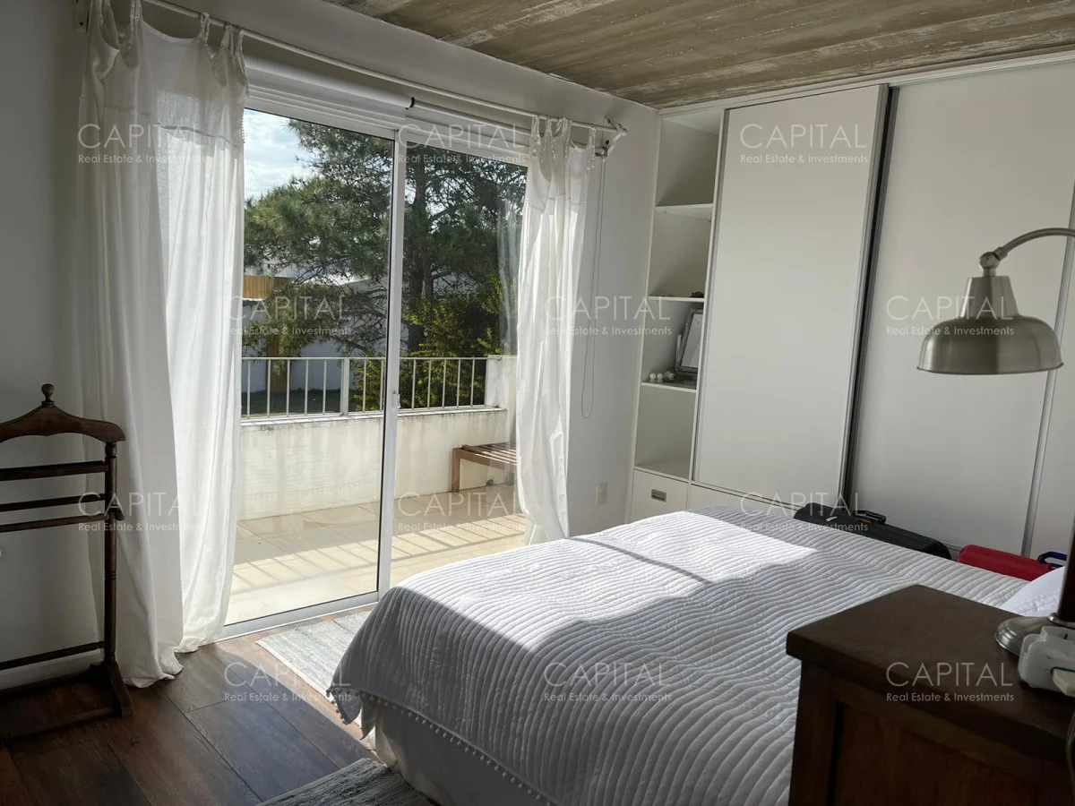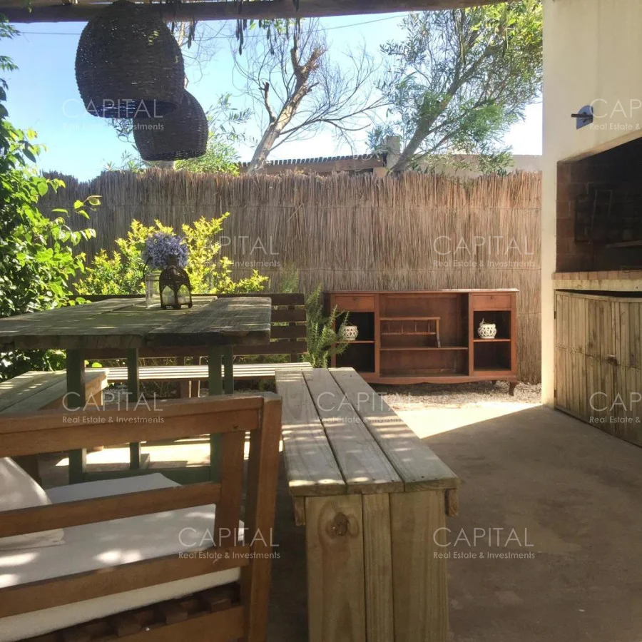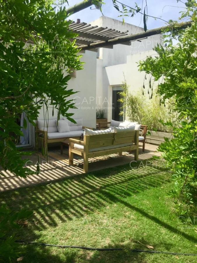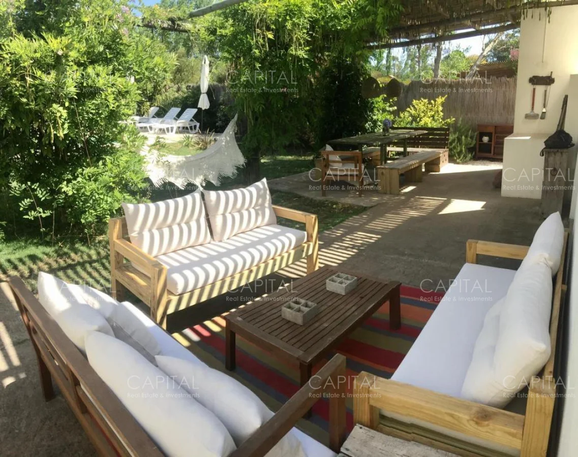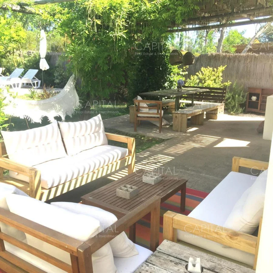 Salida a terraza exterior pergolada con lounge y parrillero con mesa