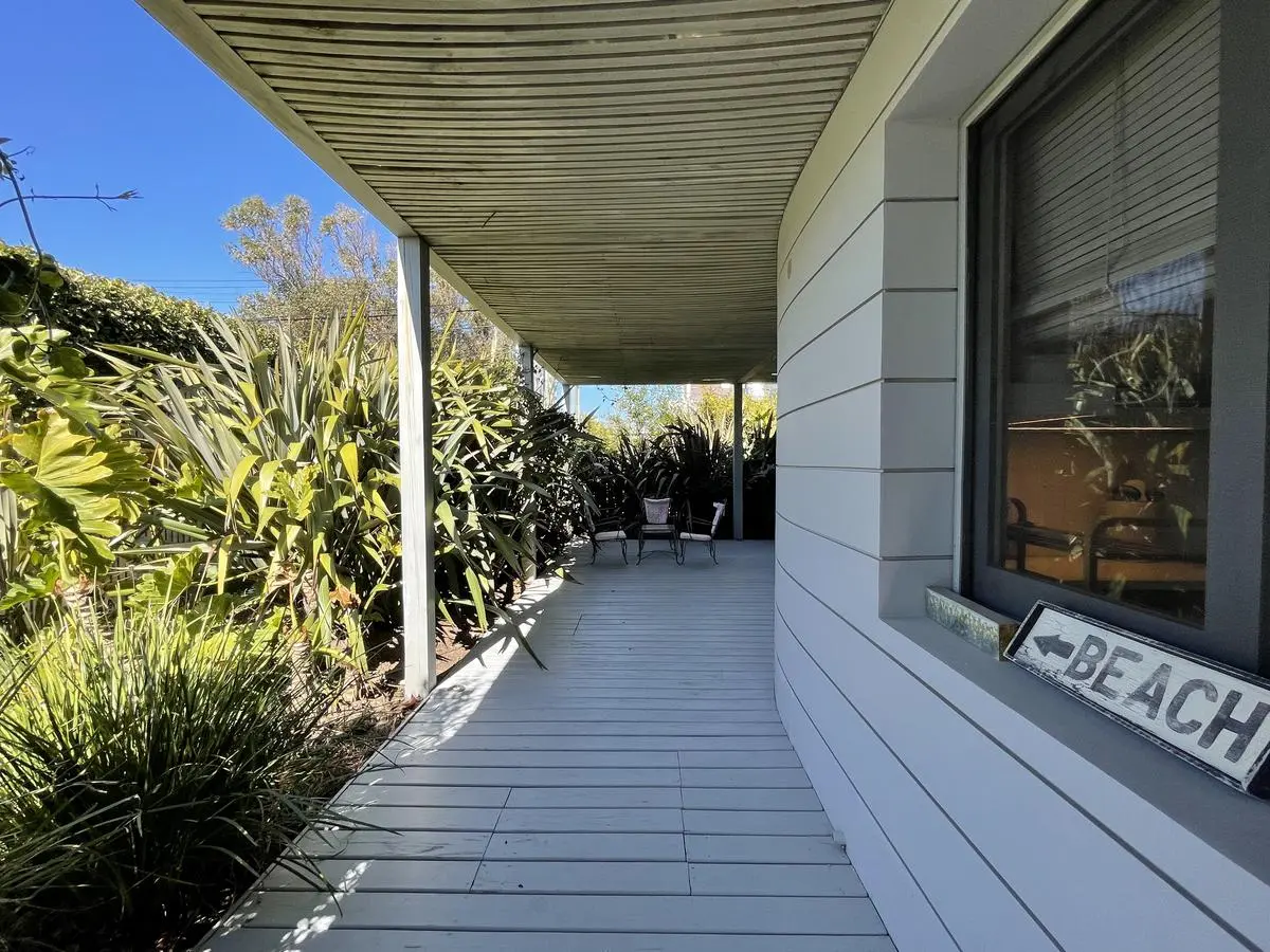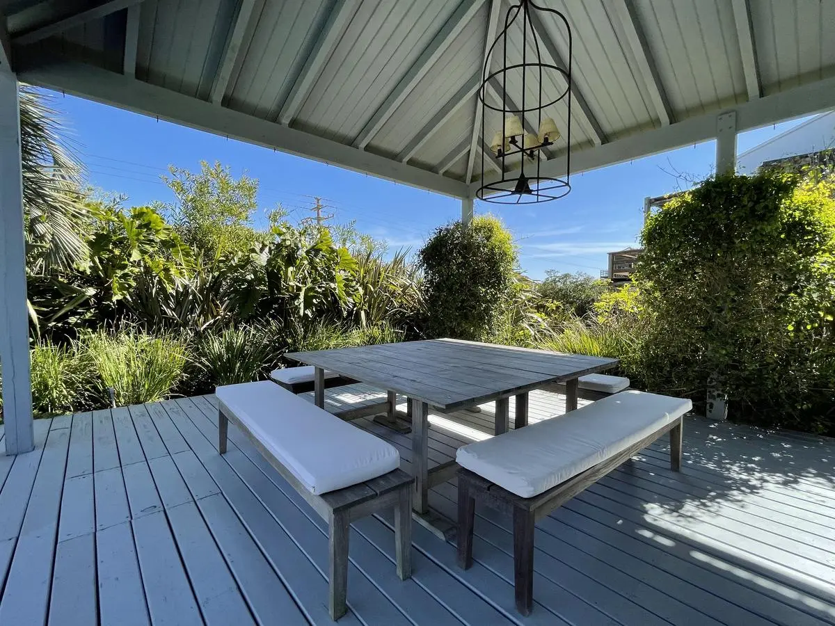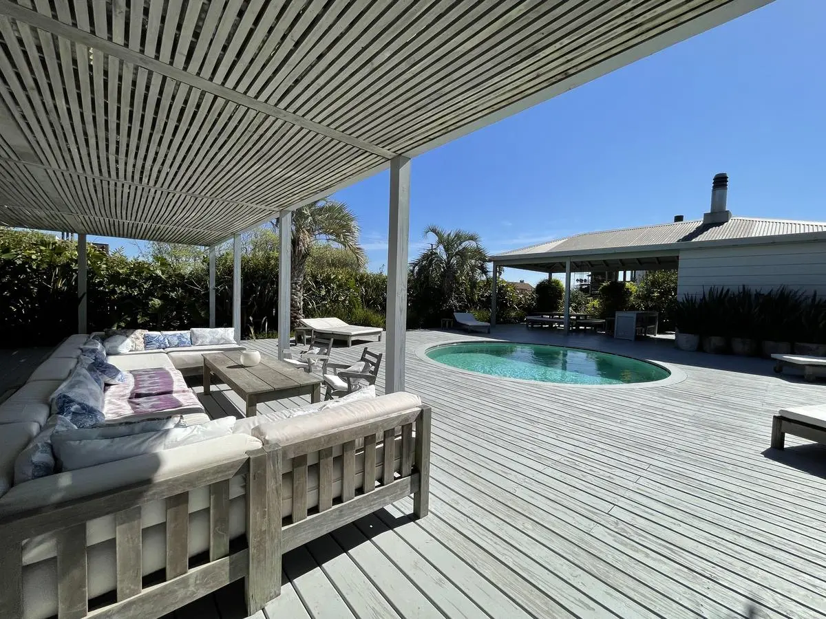 Deck with swimming pooland barbecue.