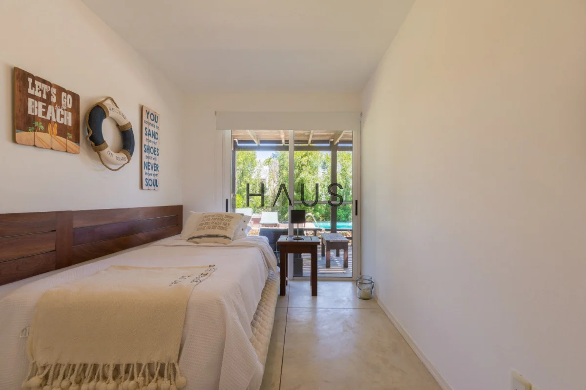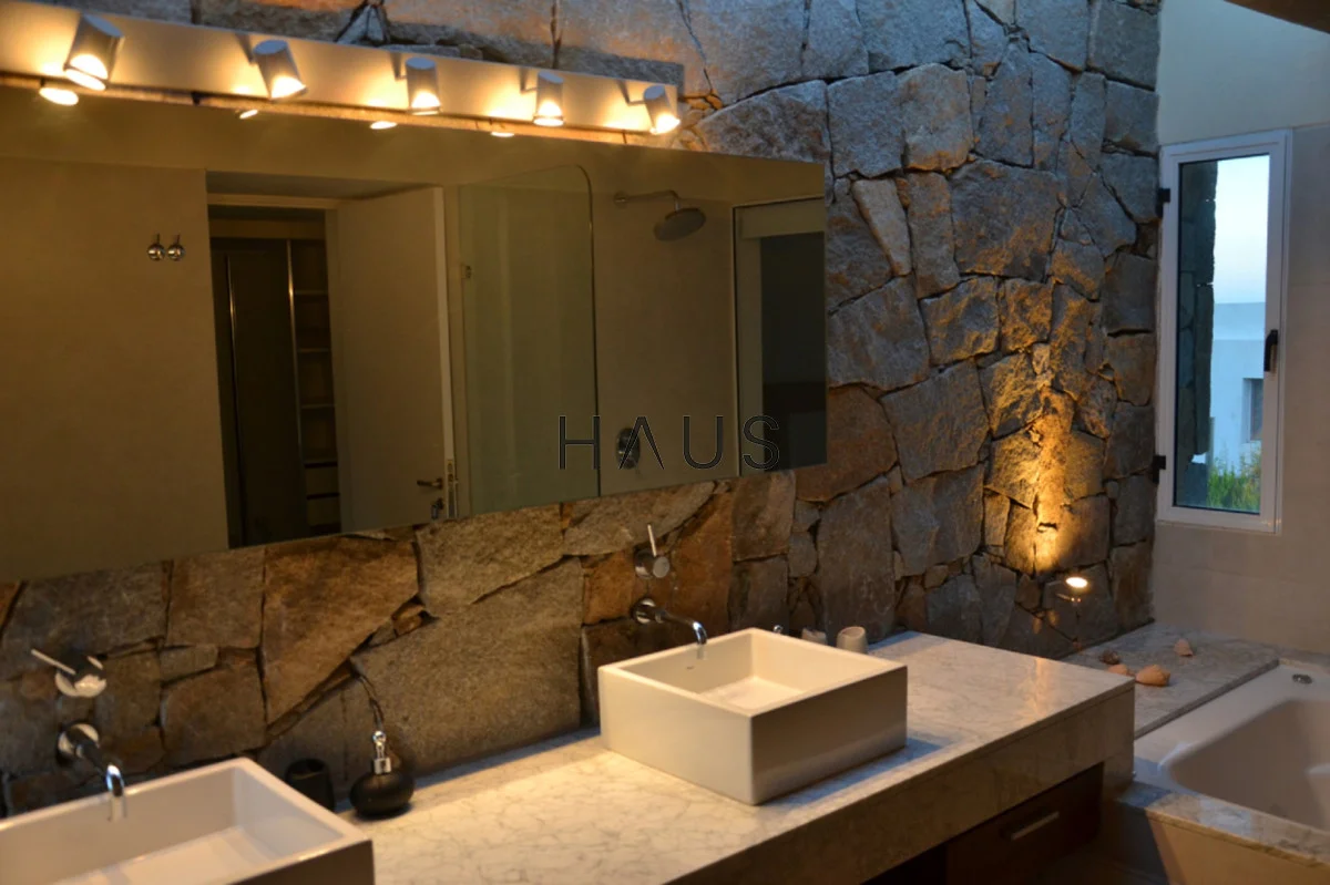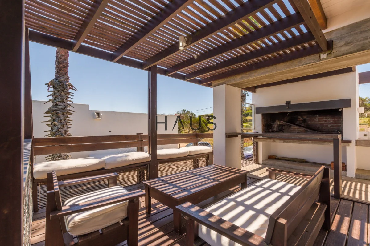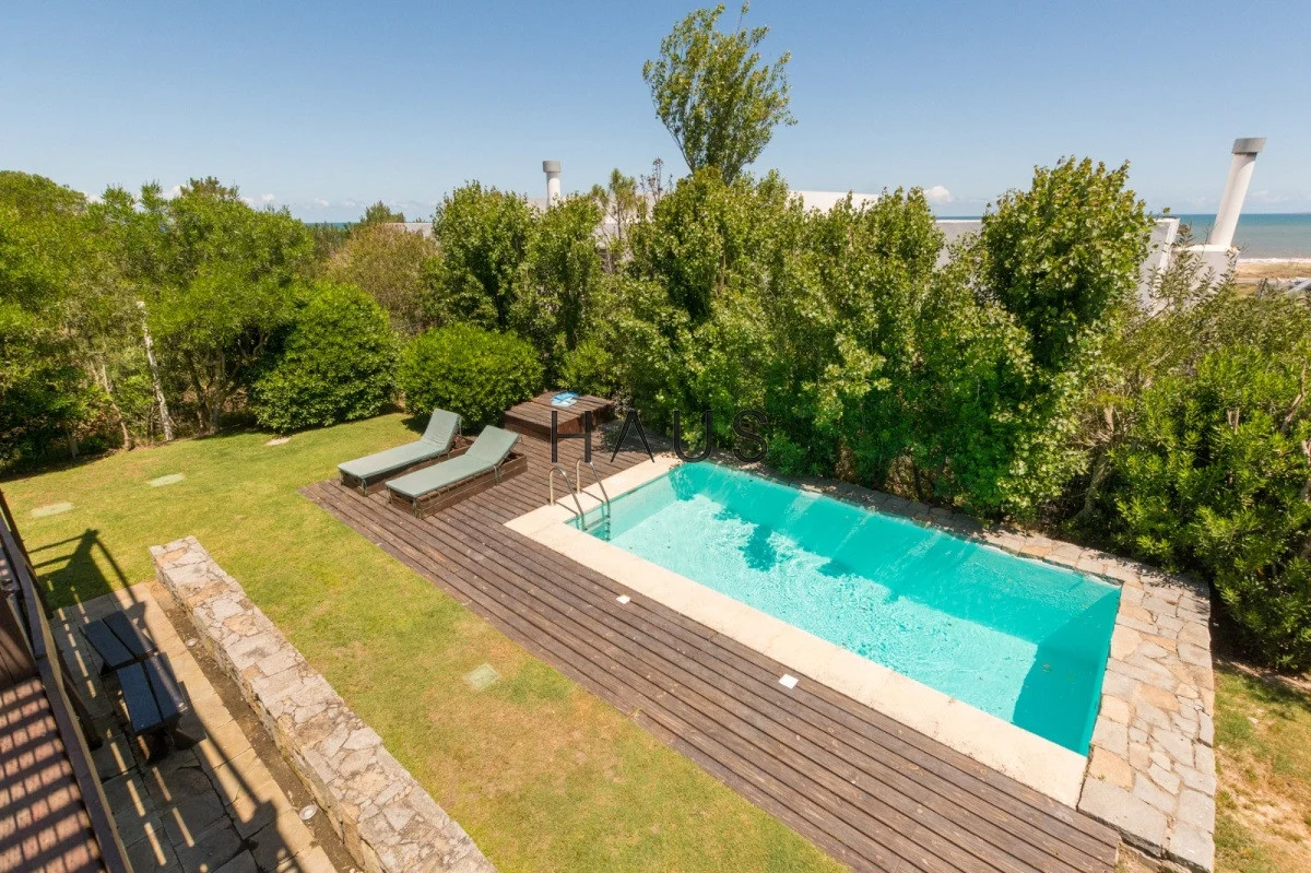 Cuenta con living-comedor con estufa a leña, cocina americana, 4 dormitorios (2 en suite), 3 baños, dependencia de servicio con baño (opción a 5º dormitorio), lavadero, terrazas, parrillero, piscina y cochera.