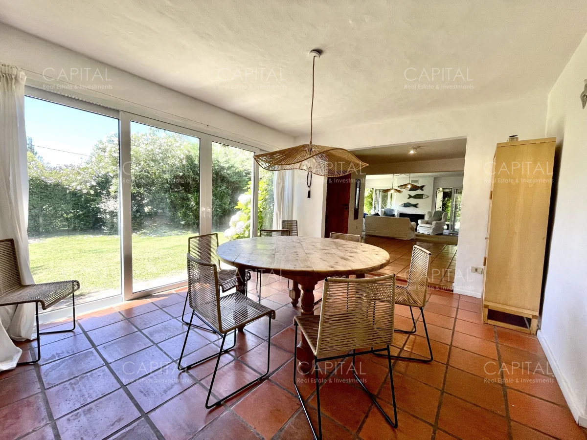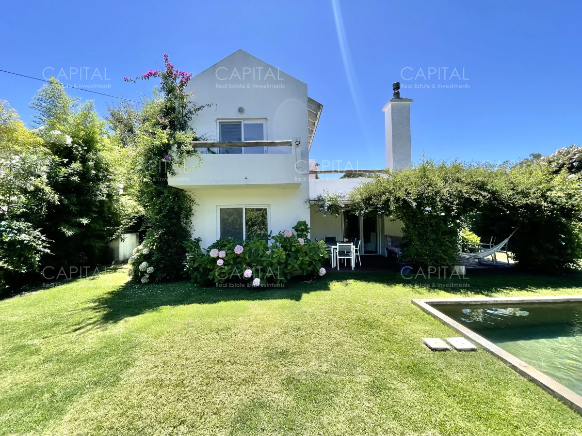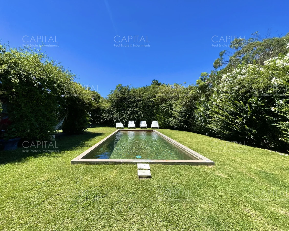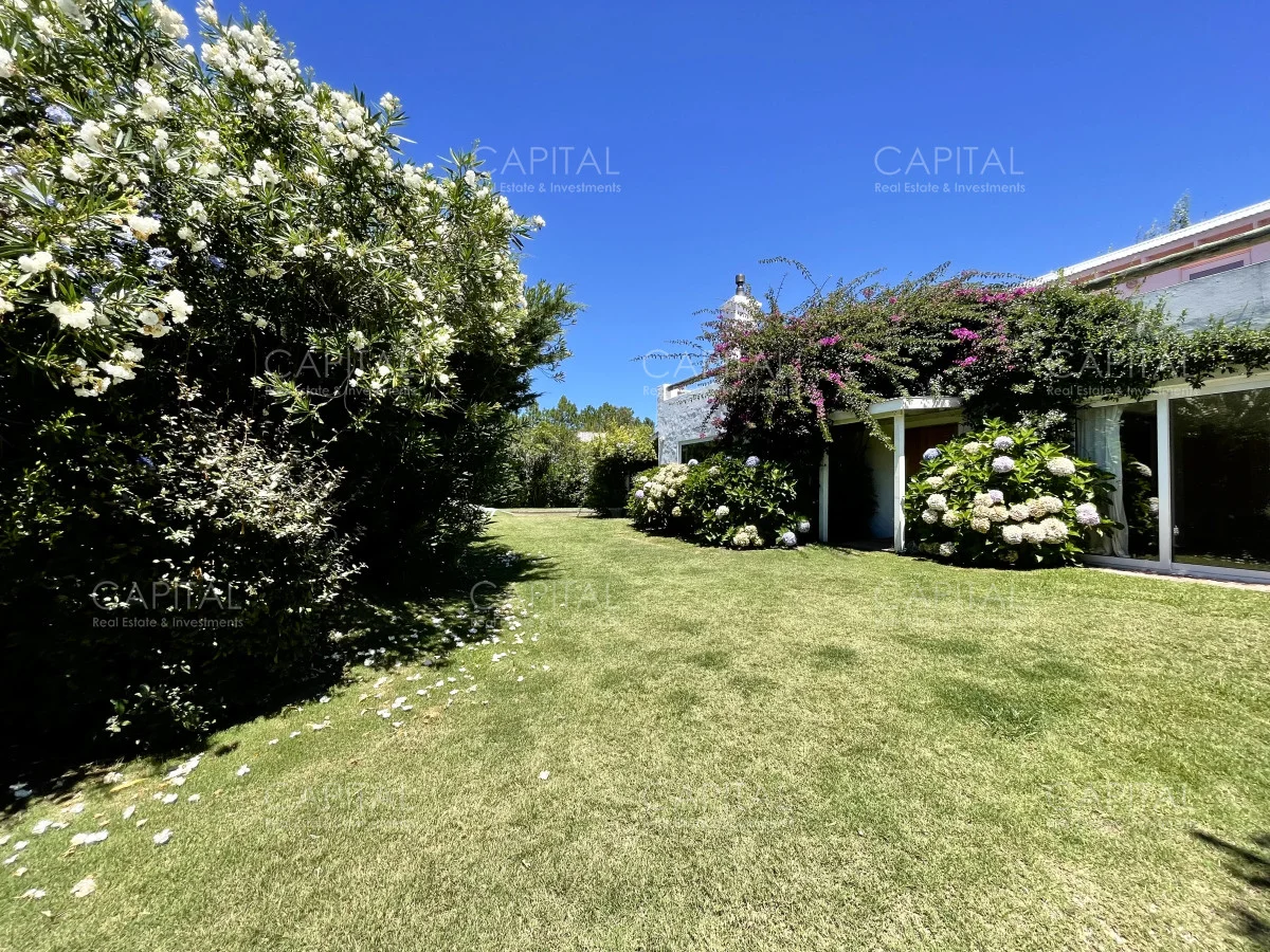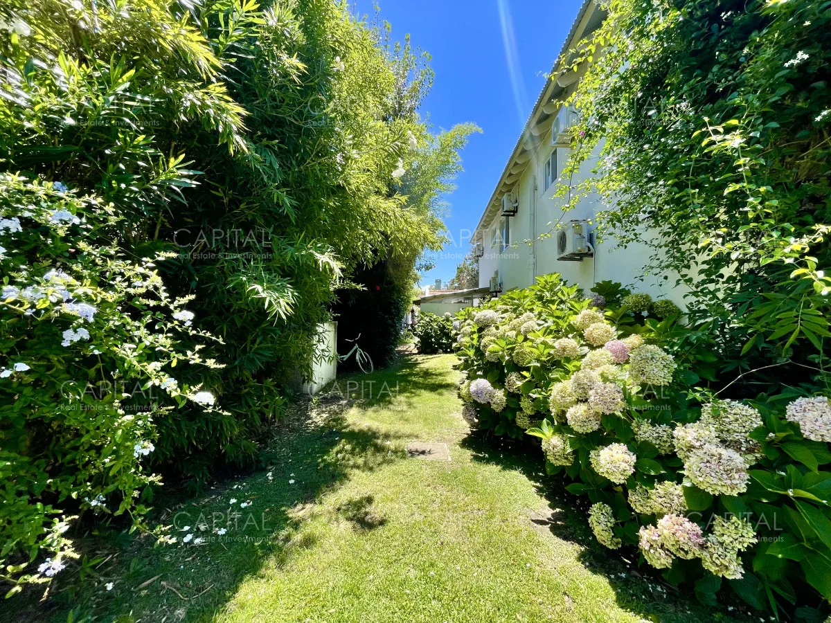 Jardín de 485 m2 . La casa tiene cerco en todo el perímetro, con estacionamiento, Parrillero, Piscina con cerco para niños, 5 (cinco) Habitaciones con aire acondicionado split frío-calor (una de ellas con baño en suite), 3 (tres) Baños completos (uno de ellos en suite con la habitación principal). Dependencia de servicio con 2 camas y Baño de servicio