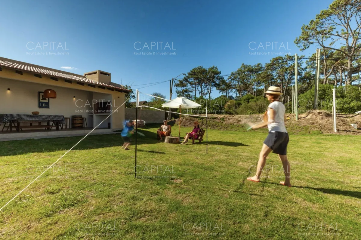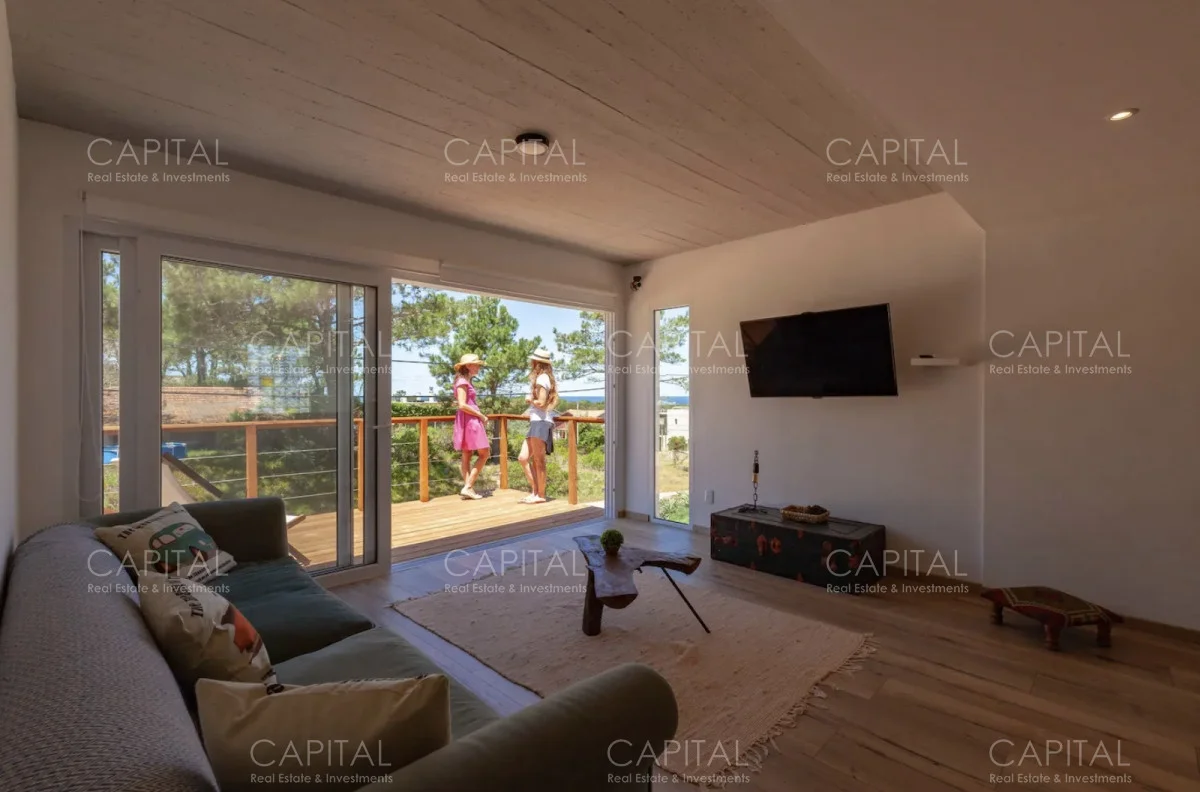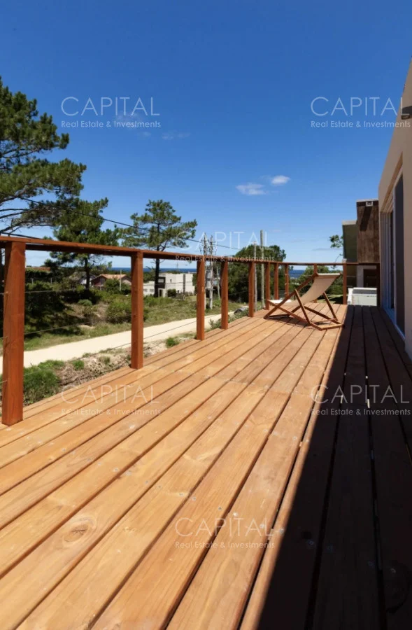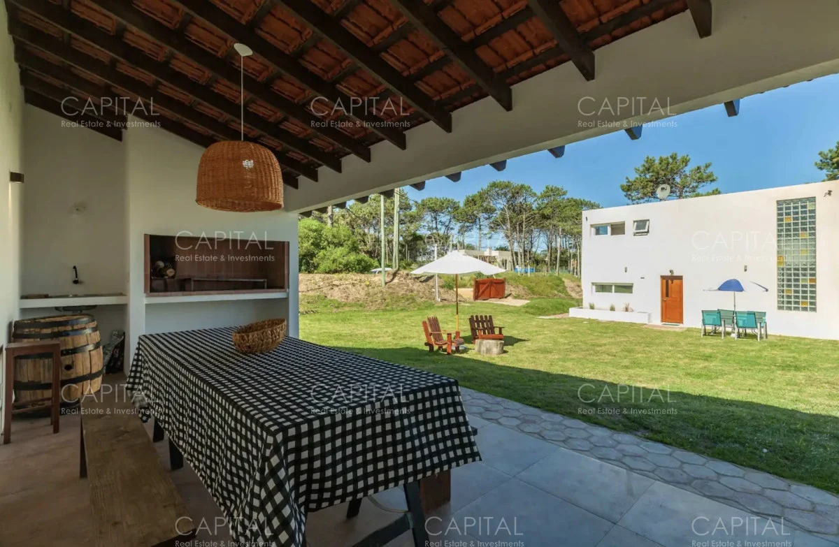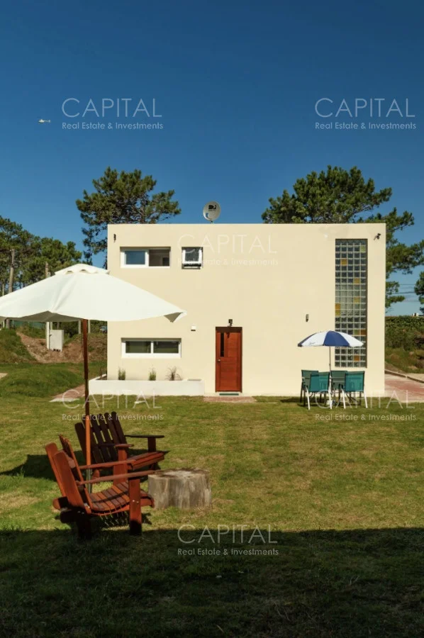 Muy linda casa en Mananatiales, cuenta con amplio jardín 700 mts, parrillero techado, 2 plantas. Planta baja living comedor luminoso, cocina integrada estilo americana muy bien equipada, 2 dormitorios que comparten baño ( uno con cama matrimonial y otro con cucheta) y en planta alta suite ppal con cama matrimonial, estar con salida a terraza con muy linda vista al mar. Lindo entorno arbolado. Ideal para disfrutar de las vacaciones.