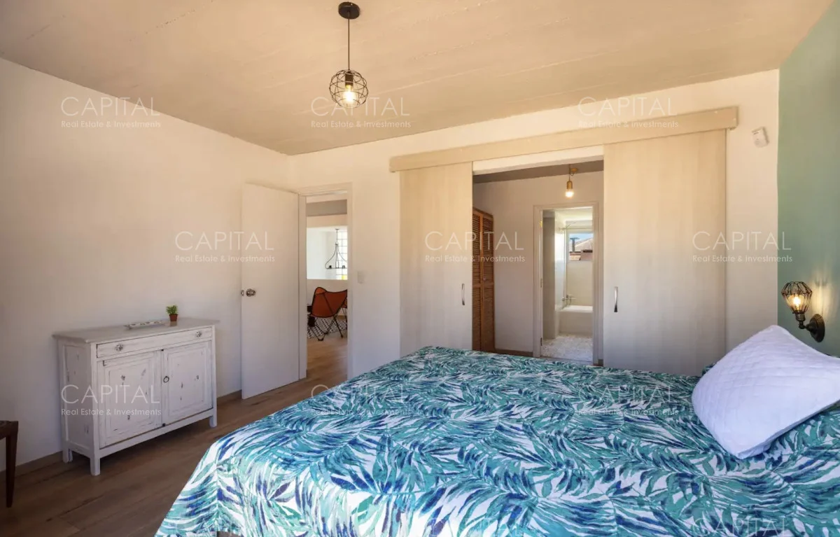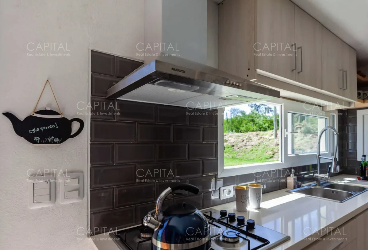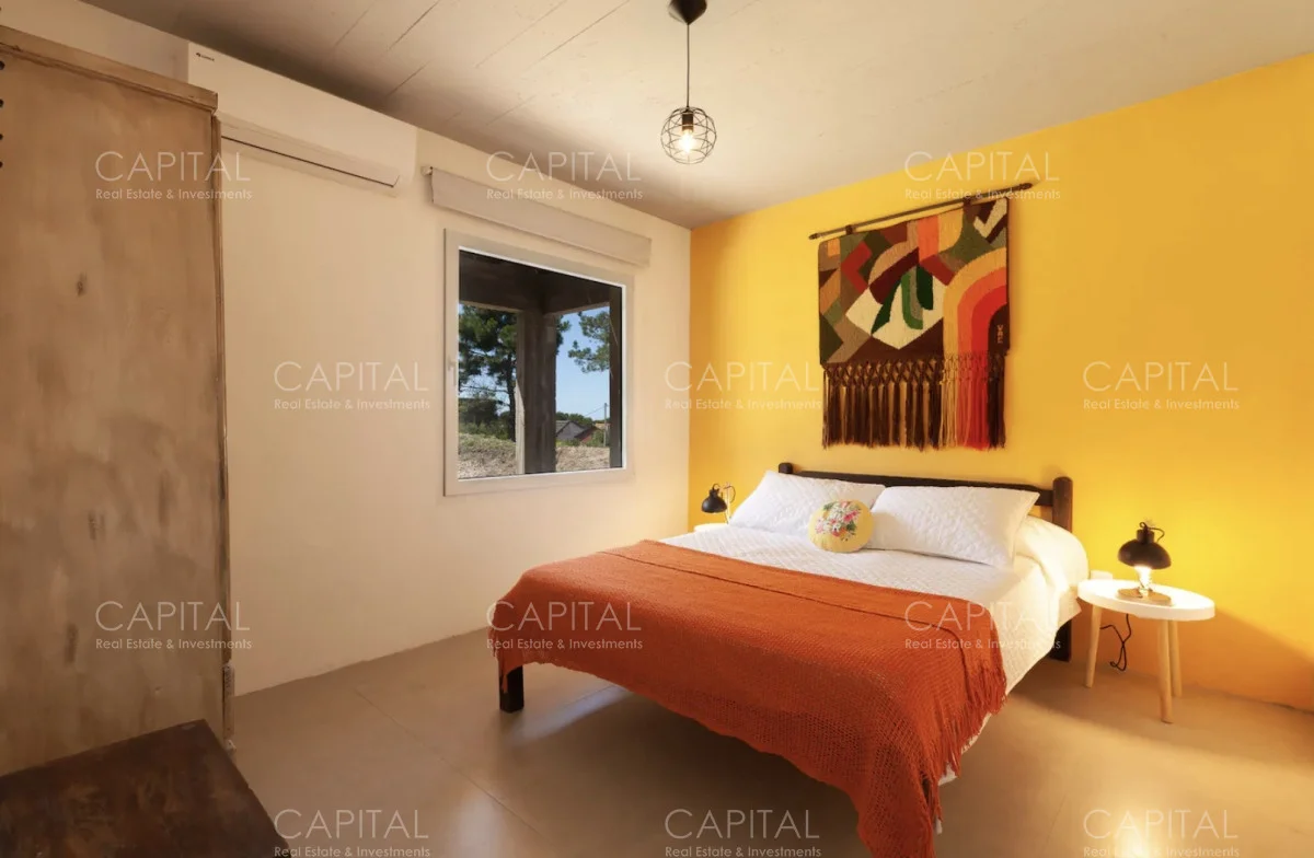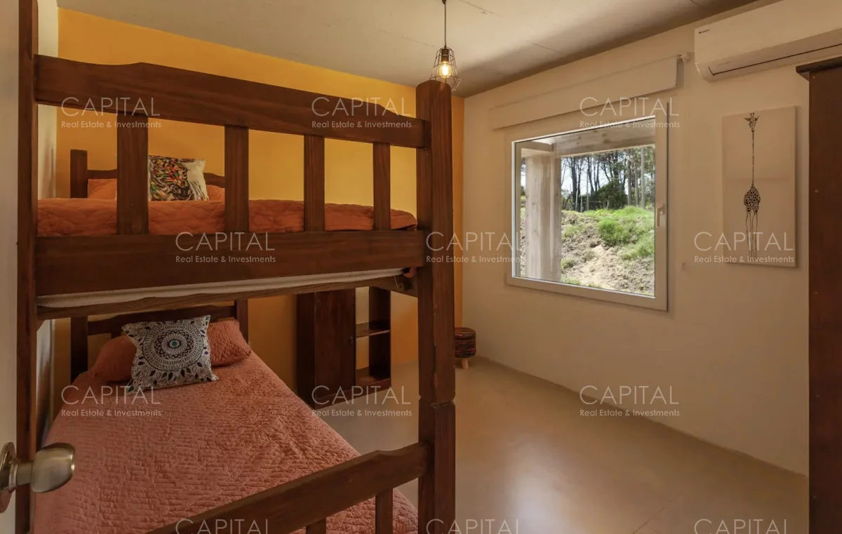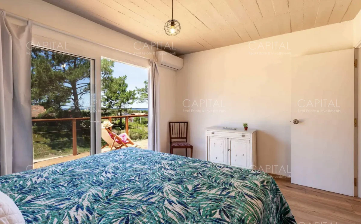 Muy linda casa en Mananatiales, cuenta con amplio jardín 700 mts, parrillero techado, 2 plantas. Planta baja living comedor luminoso, cocina integrada estilo americana muy bien equipada, 2 dormitorios que comparten baño ( uno con cama matrimonial y otro con cucheta) y en planta alta suite ppal con cama matrimonial, estar con salida a terraza con muy linda vista al mar. Lindo entorno arbolado. Ideal para disfrutar de las vacaciones.