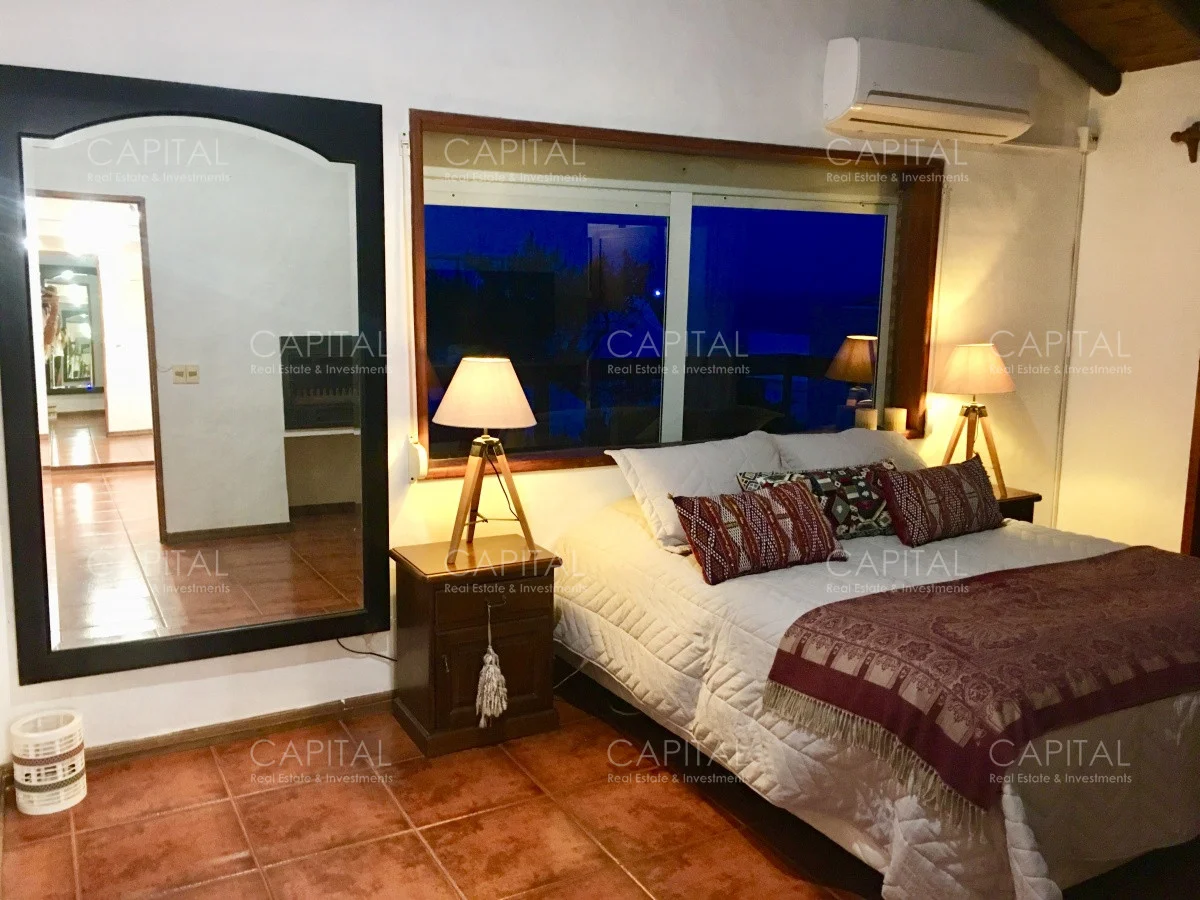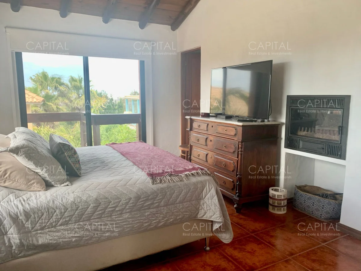 Dormitorio principal en suite, con salida a una gran terraza con vista al mar y piscina. Equipado con Smart tv 50, hogar a leña que tira calor a todos los dormitorios y baños, cómoda y mesas de luz en roble francés, sommier Queen con sábanas de 360 hilos y colchas de algodón egipcio. Espejo italiano estilo puerta.