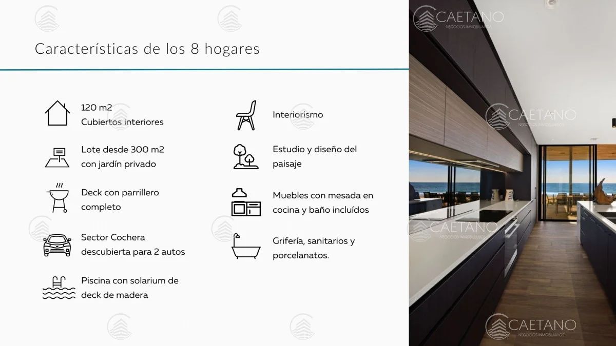 Cada hogar cuenta con 120 m2 cubiertos totales, estar comedor con cocina integrada, toilette, dos dormitorios y baño completo. El sector exterior, presenta un diseño paisajístico en relación con el entorno, se proyecta un deck de madera con parrillero completo que busca generar una conexión