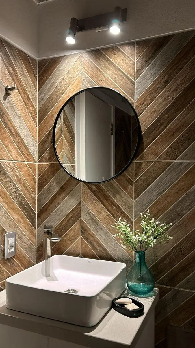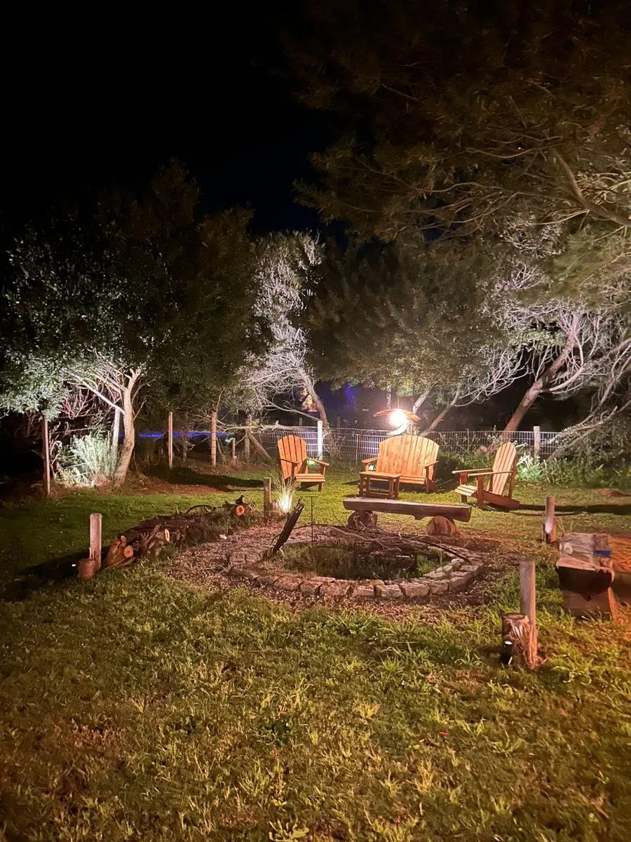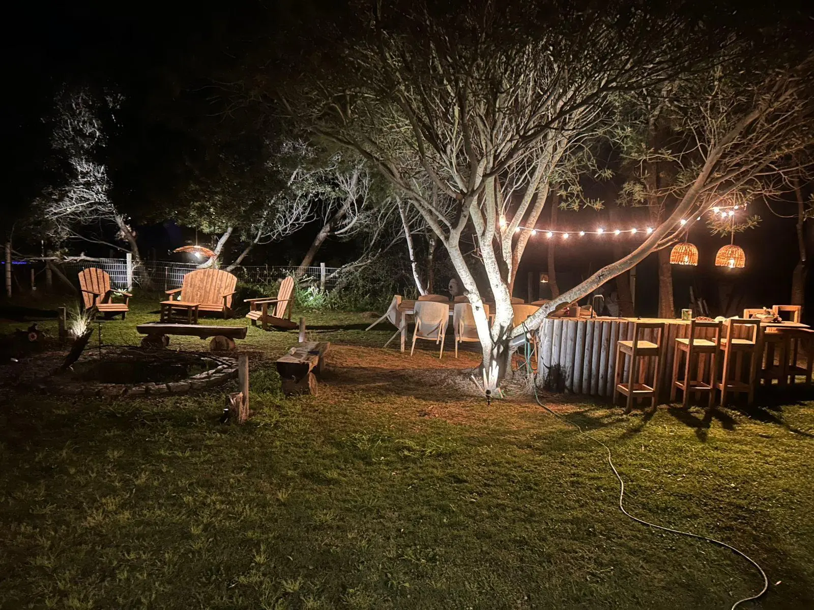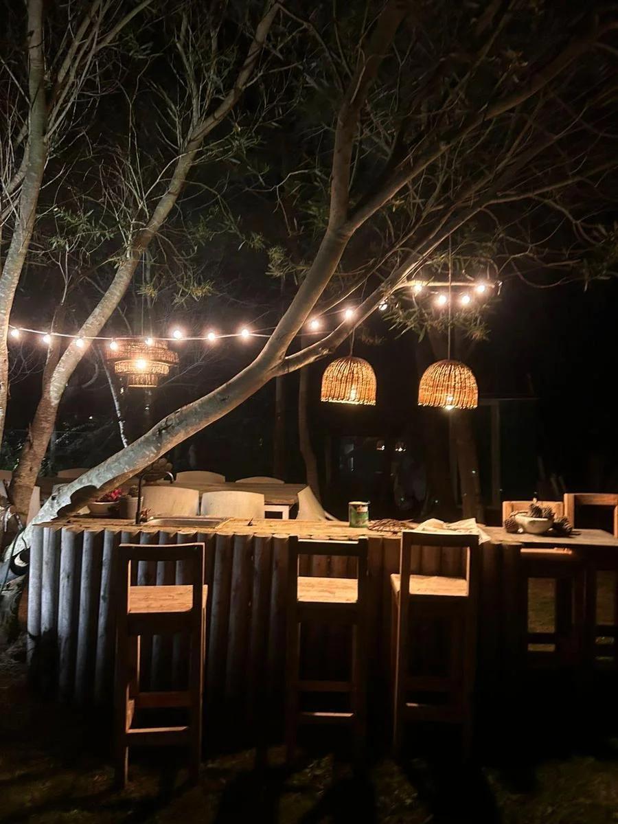 Afuera un jardin divino con fogonero y barra para recibir visitas.