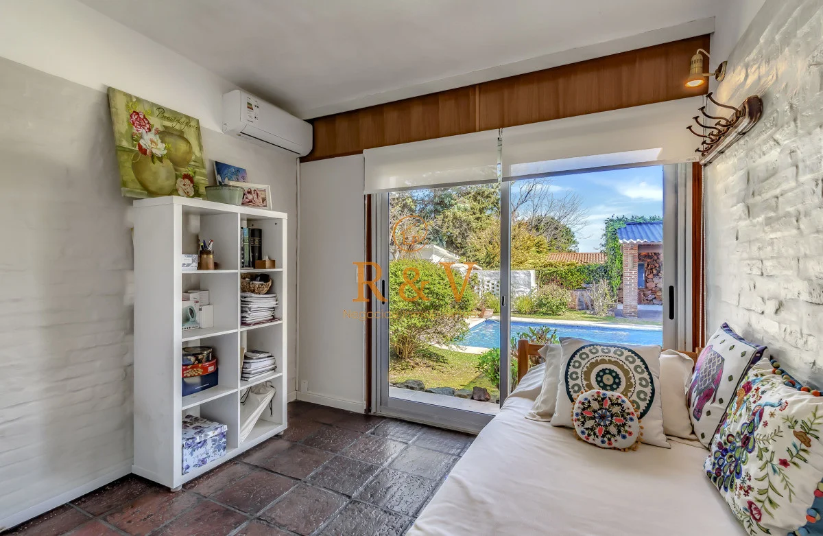 En el exterior, se destaca una piscina privada junto a un parrillero, perfectos para reuniones y momentos de relax.