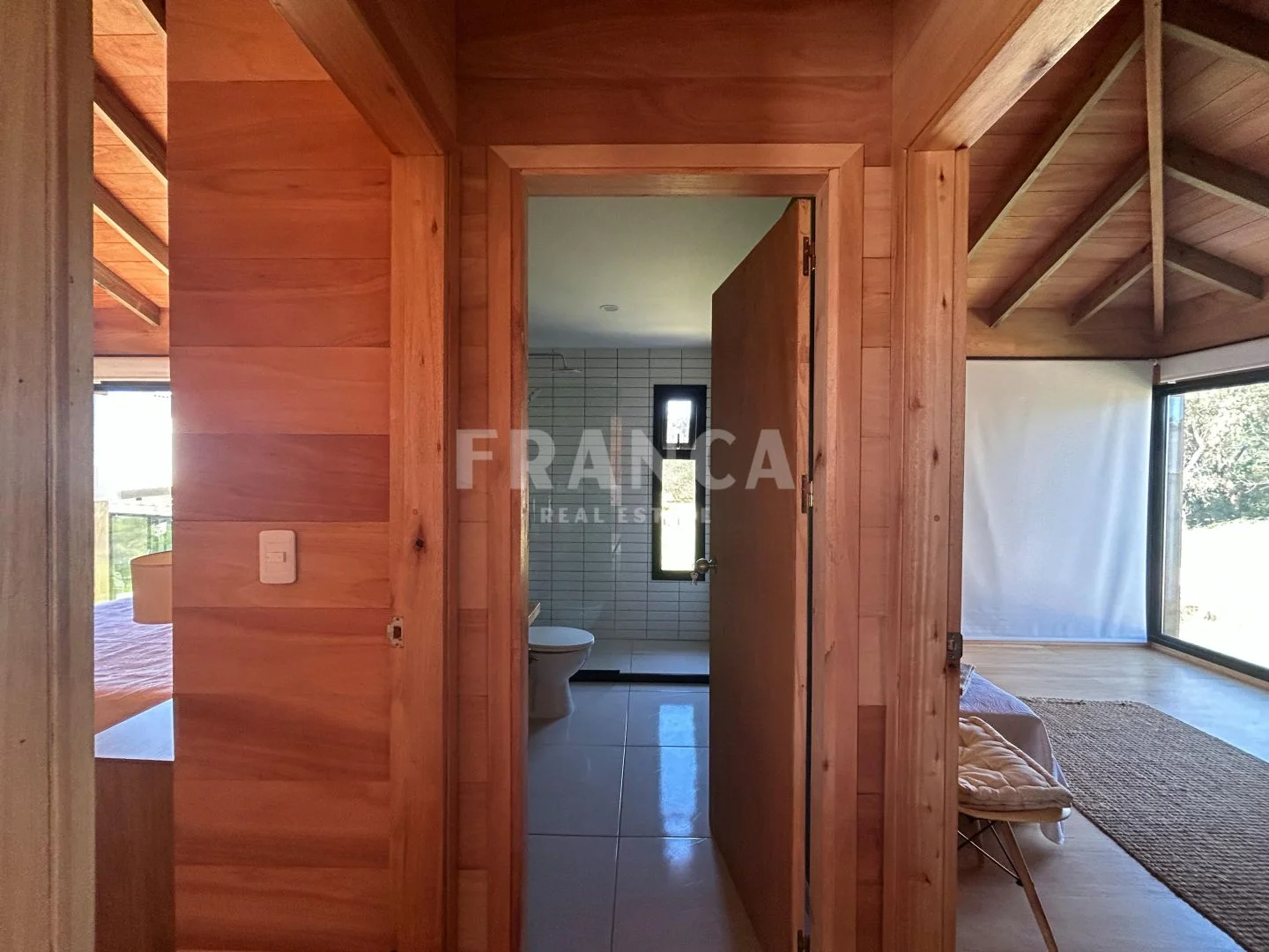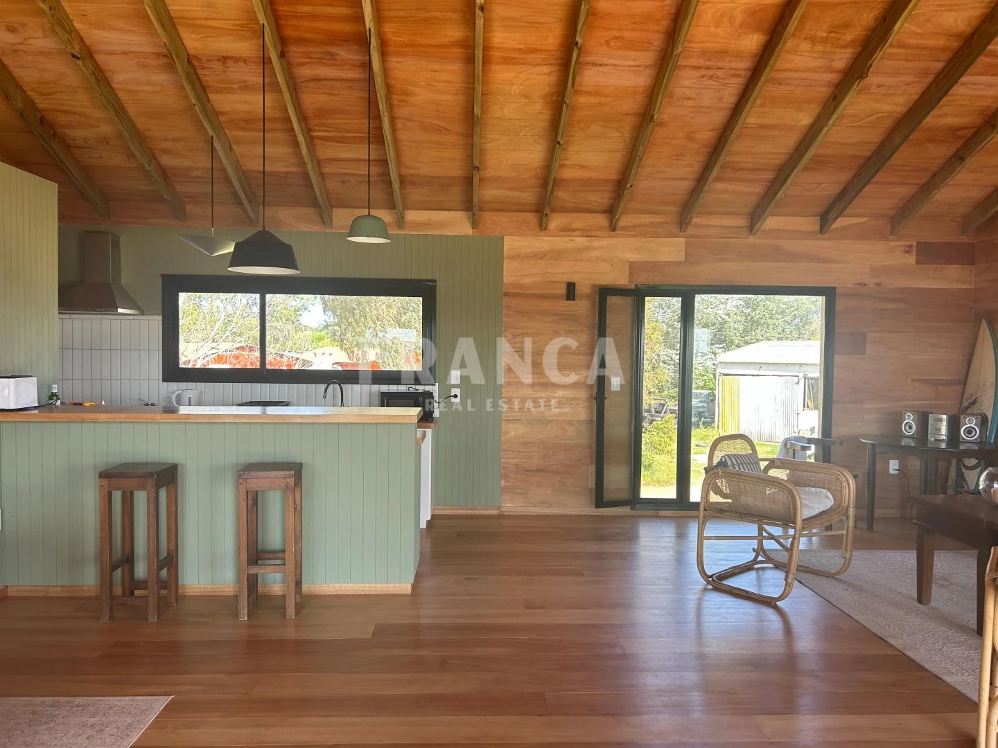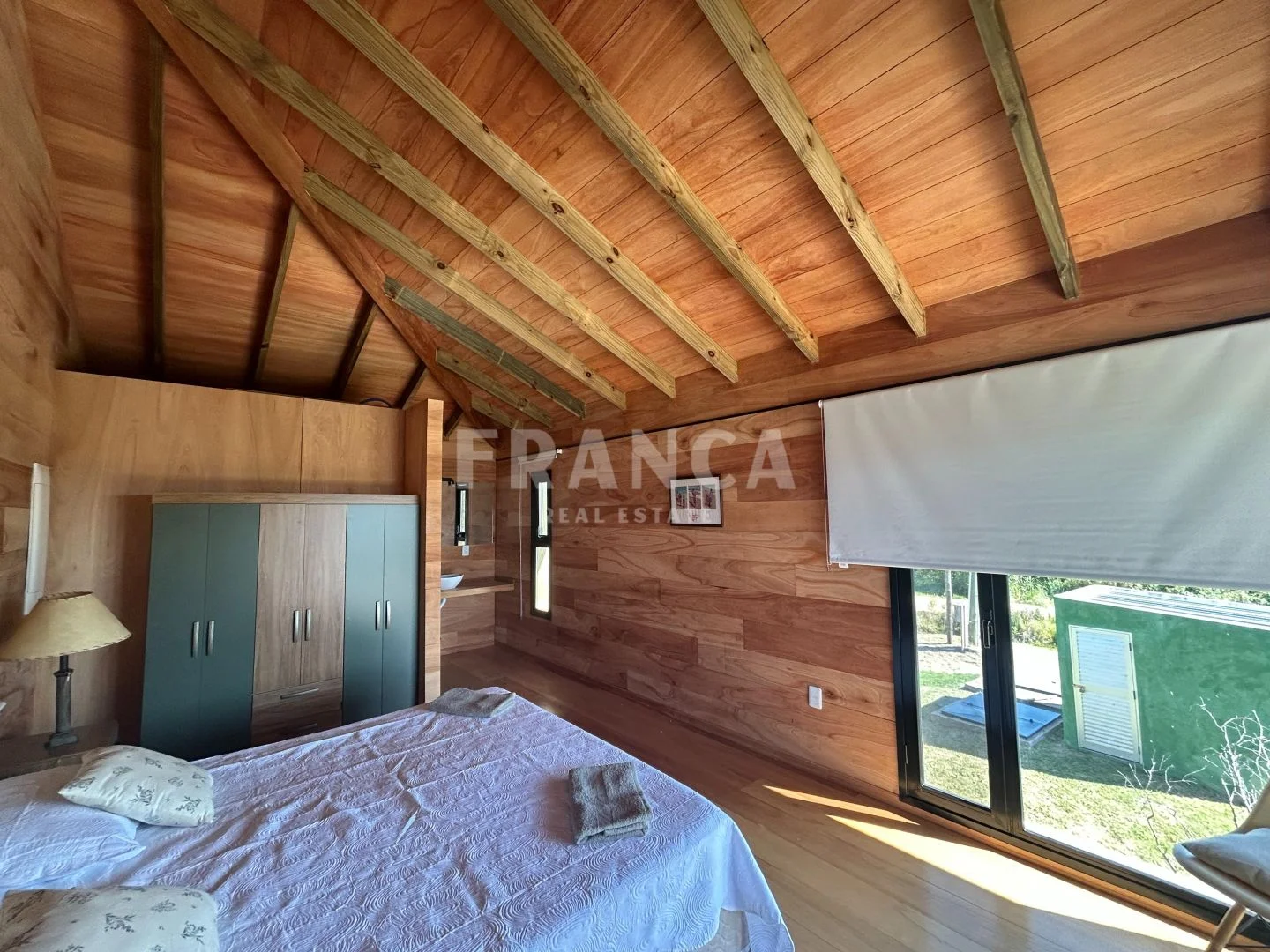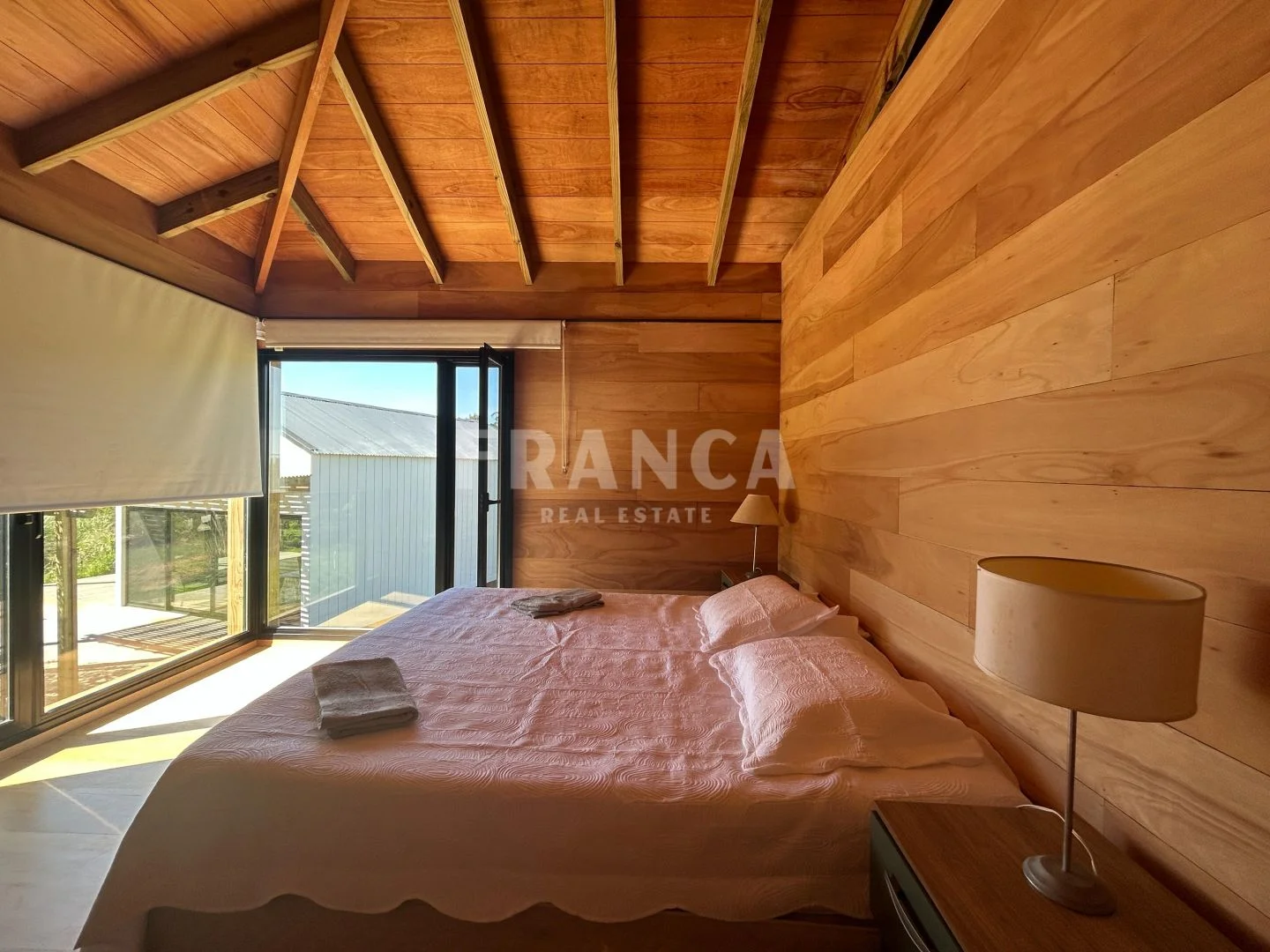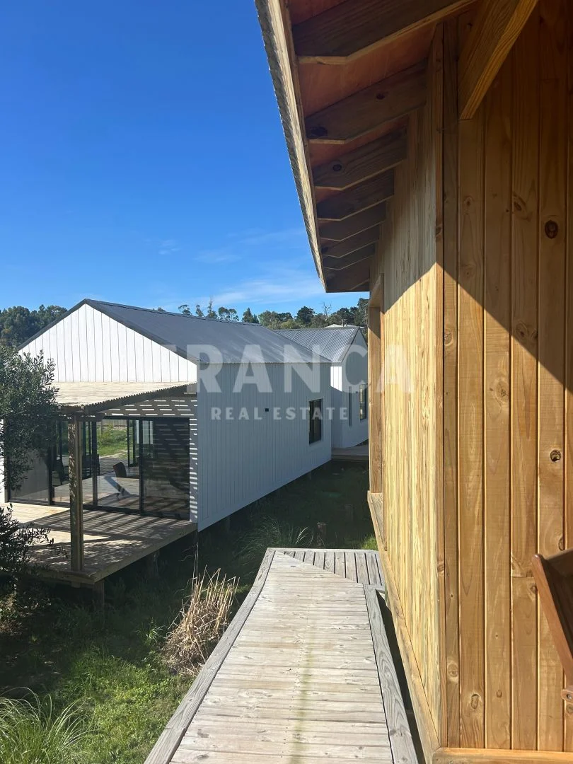 Construida con sistema woodframe y revestimiento exterior en pino tratado, combina eficiencia, calidez y estilo natural.