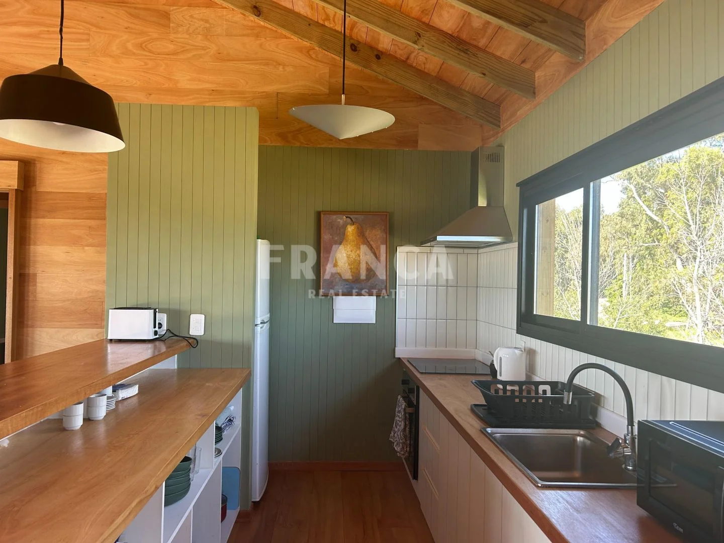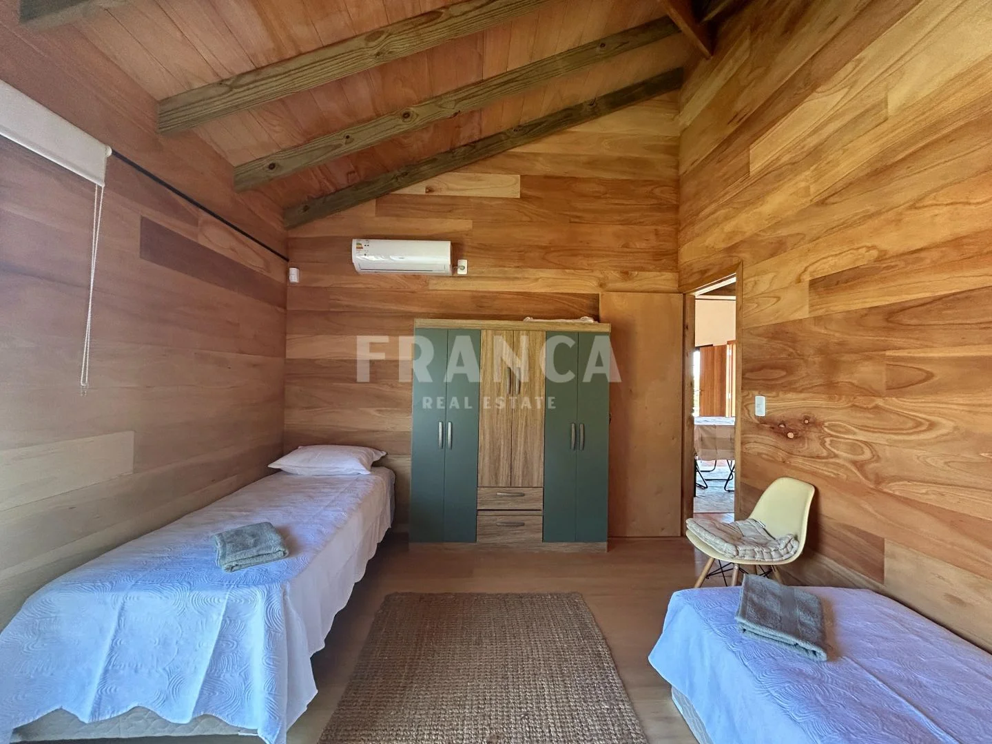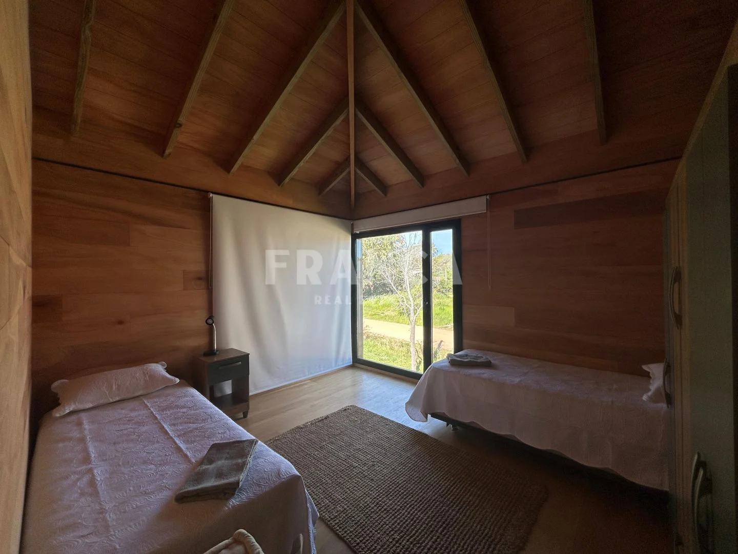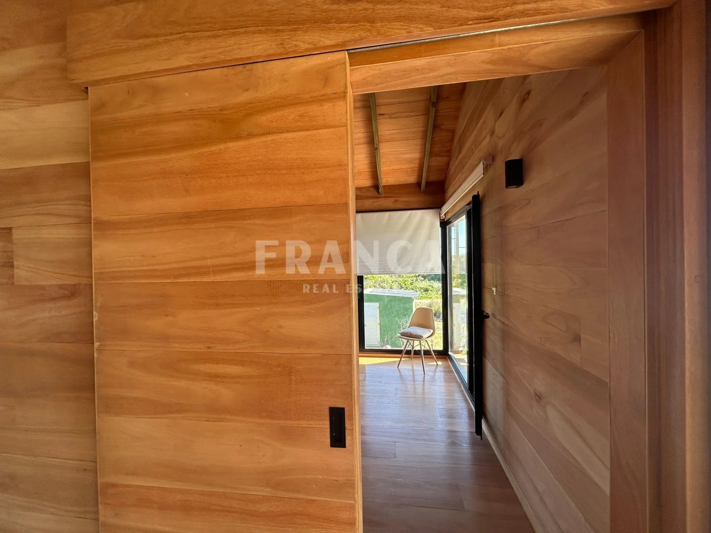 Construida con sistema woodframe y revestimiento exterior en pino tratado, combina eficiencia, calidez y estilo natural.