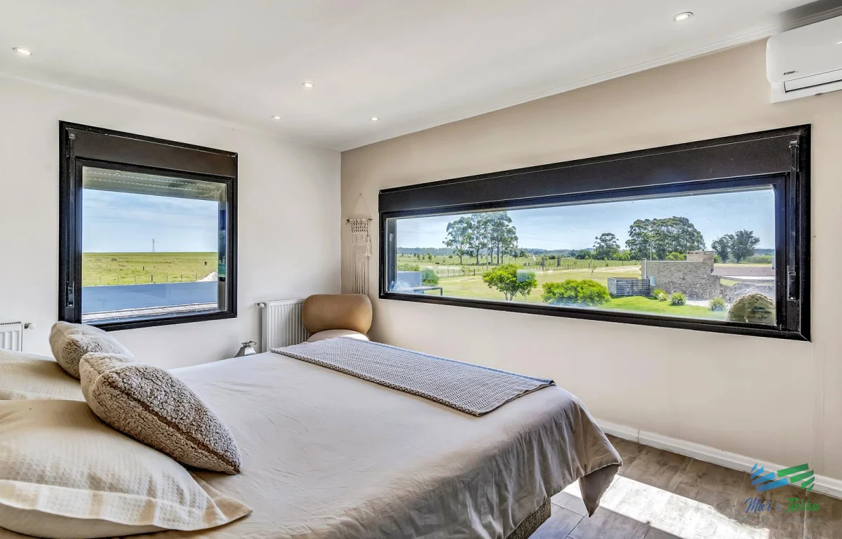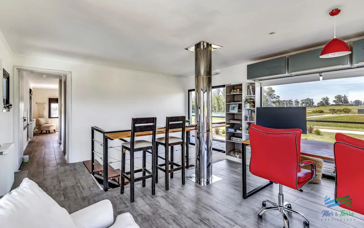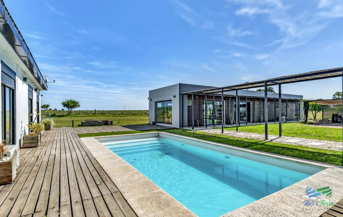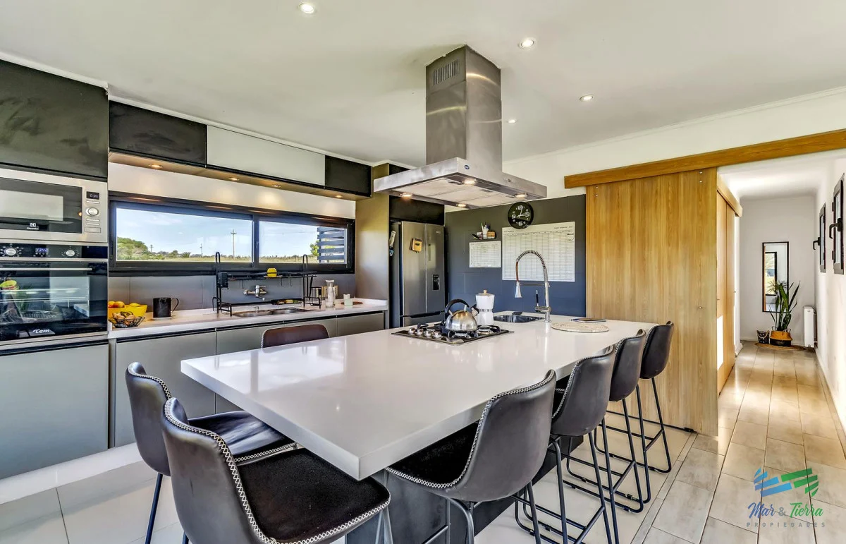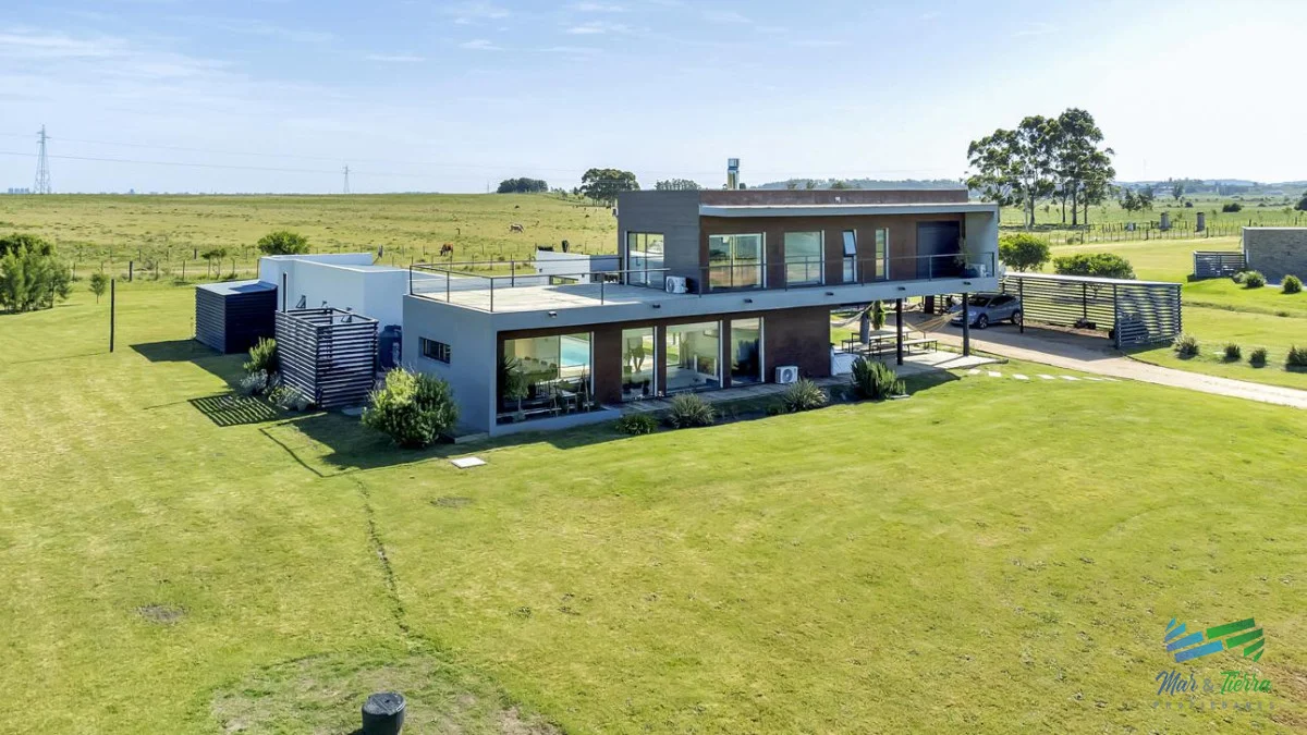 En un predio de 5.000 m y 400 m2 construidos, se distribuye en dos sectores. El principal dispone en planta baja un amplio living integrado a la cocina, 4 dormitorios, uno de ellos en suite, y en planta alta office con terraza.