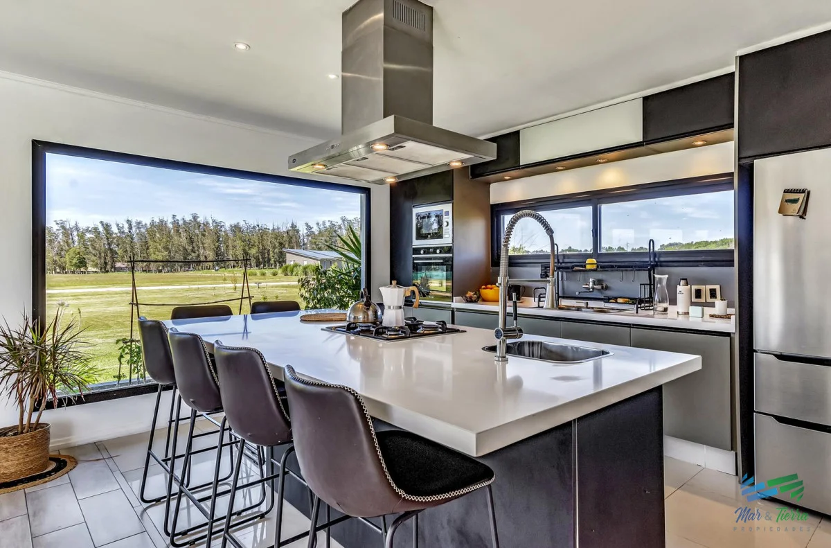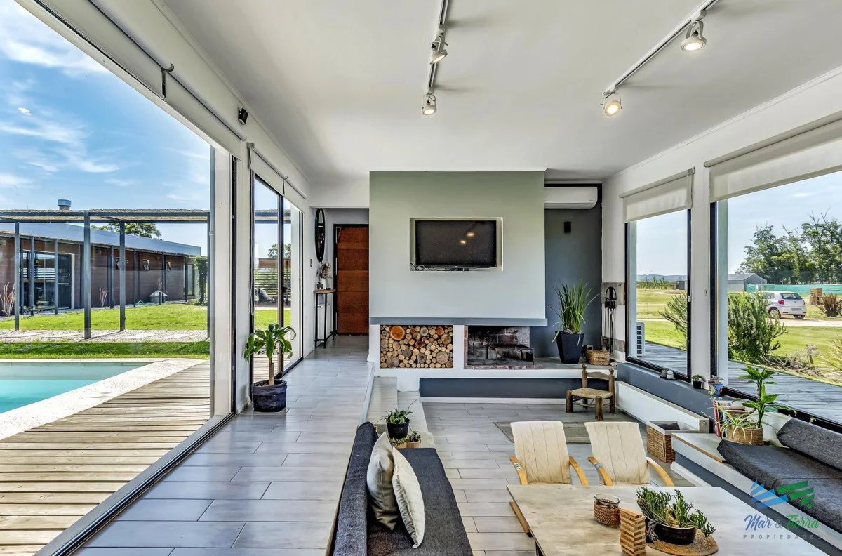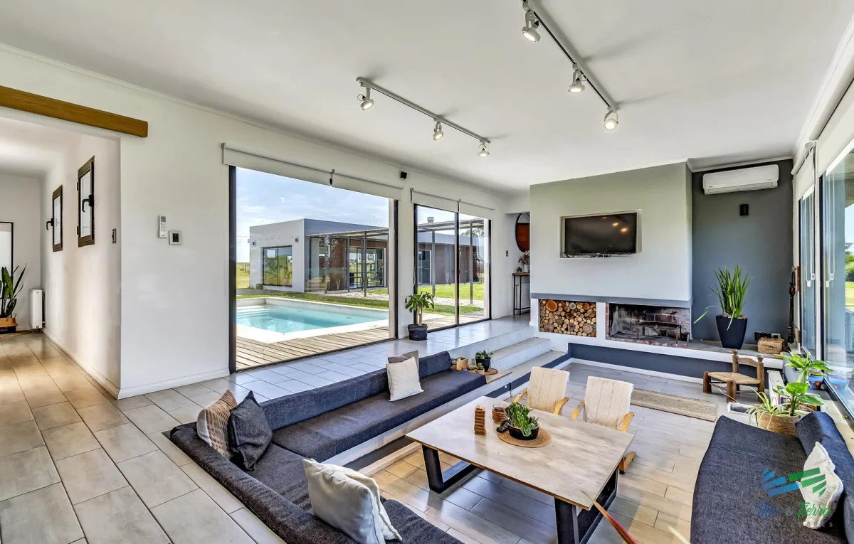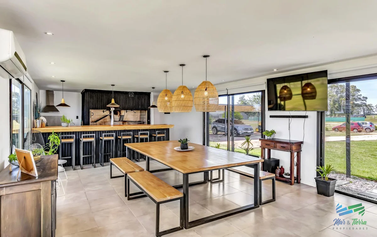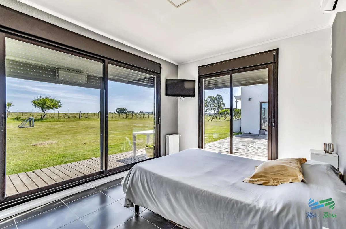 En un predio de 5.000 m y 400 m2 construidos, se distribuye en dos sectores. El principal dispone en planta baja un amplio living integrado a la cocina, 4 dormitorios, uno de ellos en suite, y en planta alta office con terraza.