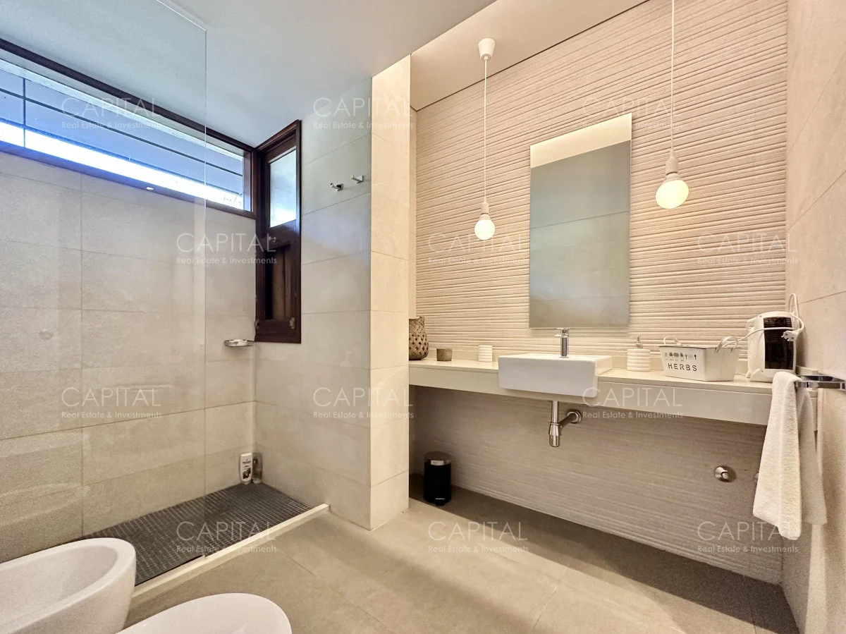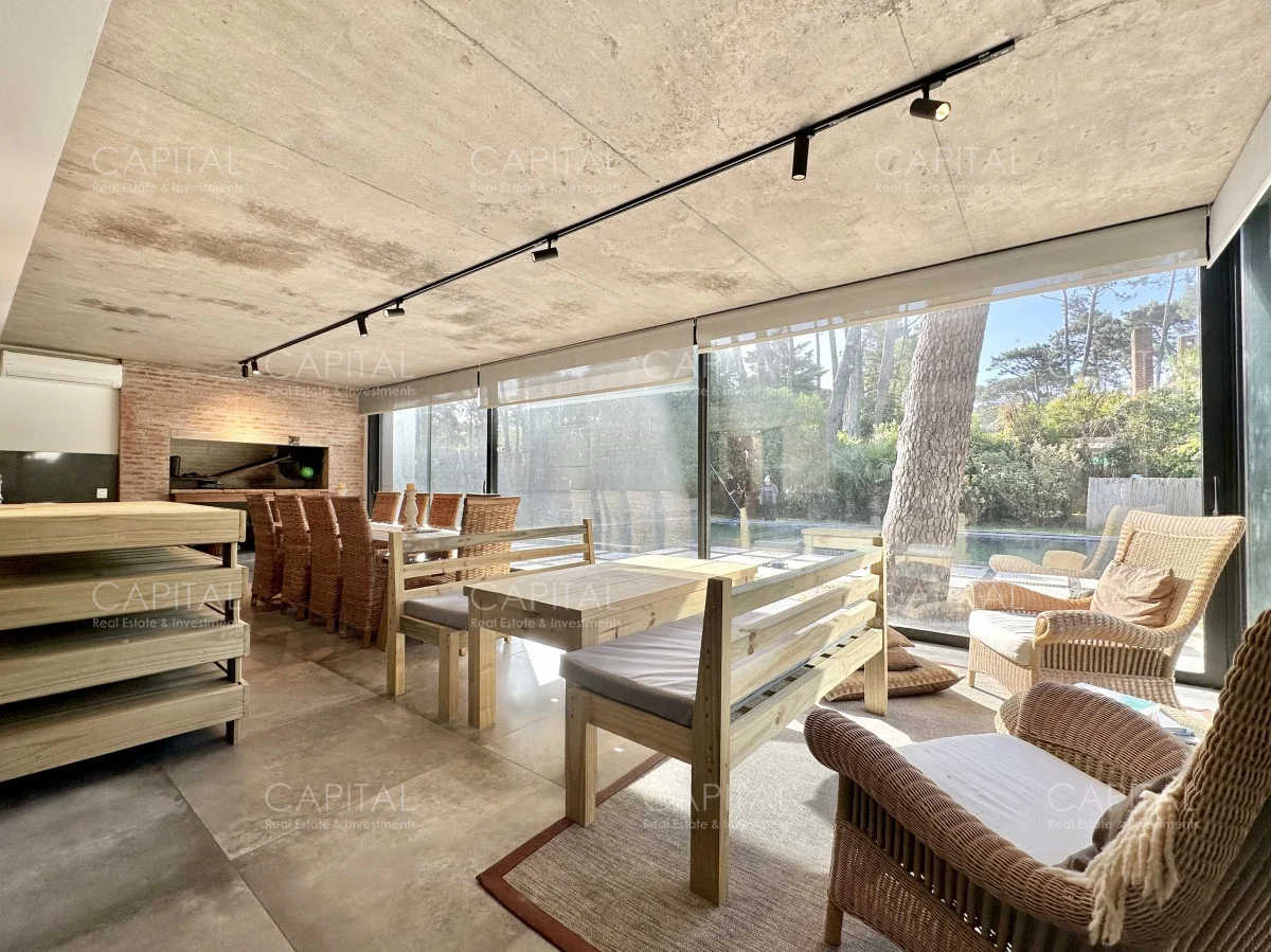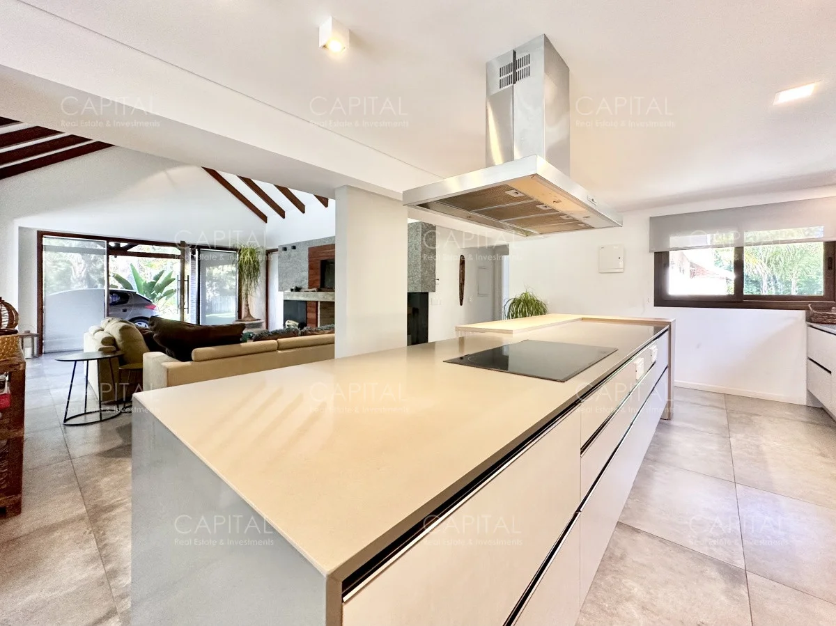 Ambientes amplios y muy luminosos. Living con estufa a leña, Cocina integrada tipo americana muy bien equipada con acceso al comedor donde se encuentra el parrillero integrado con grandes ventanales rebatibles que dan al jardín y la piscina.