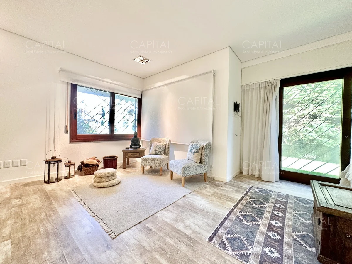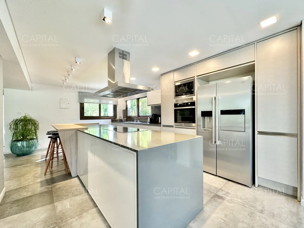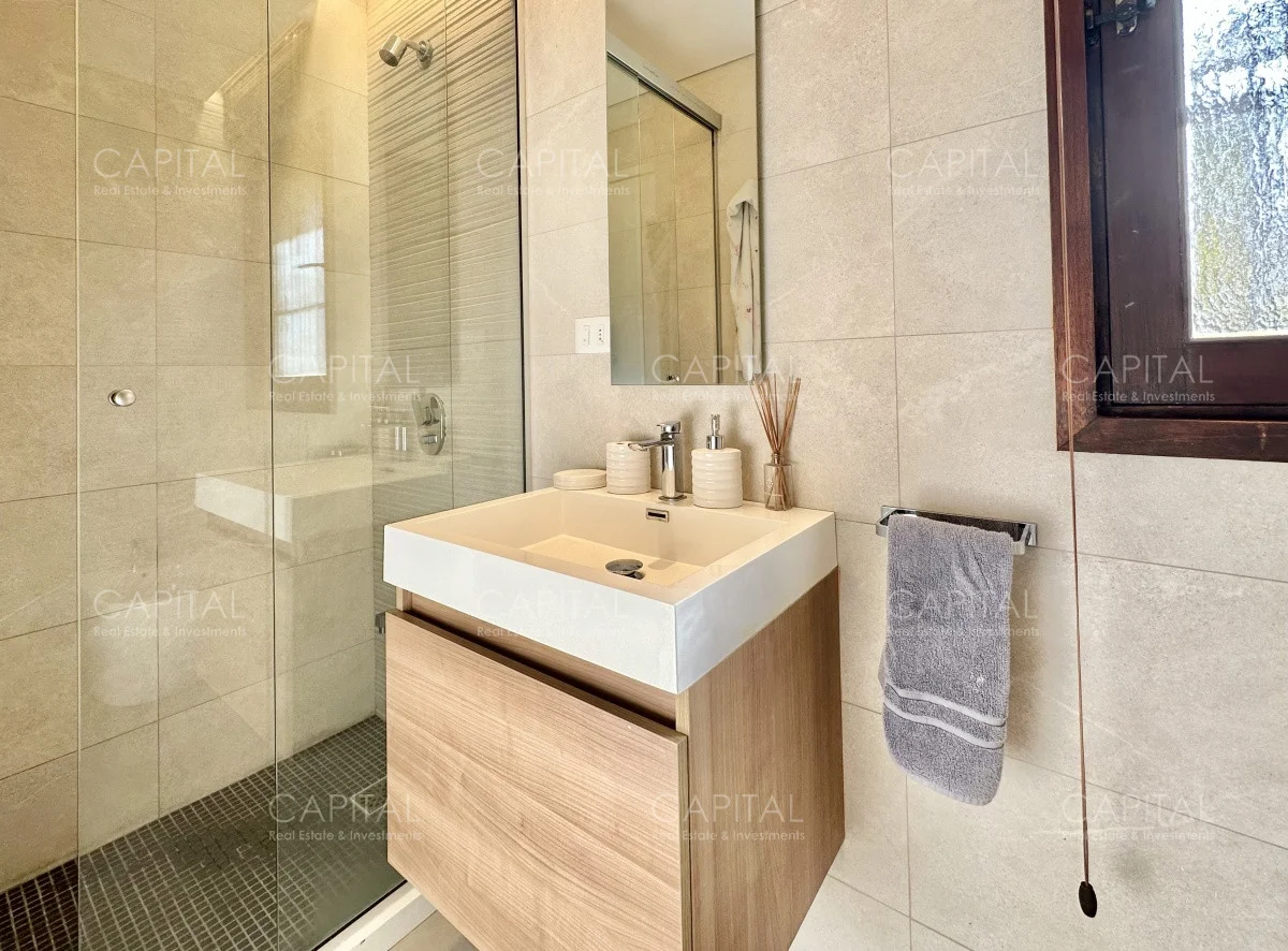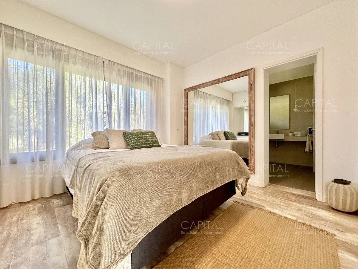 Ambientes amplios y muy luminosos. Living con estufa a leña, Cocina integrada tipo americana muy bien equipada con acceso al comedor donde se encuentra el parrillero integrado con grandes ventanales rebatibles que dan al jardín y la piscina.