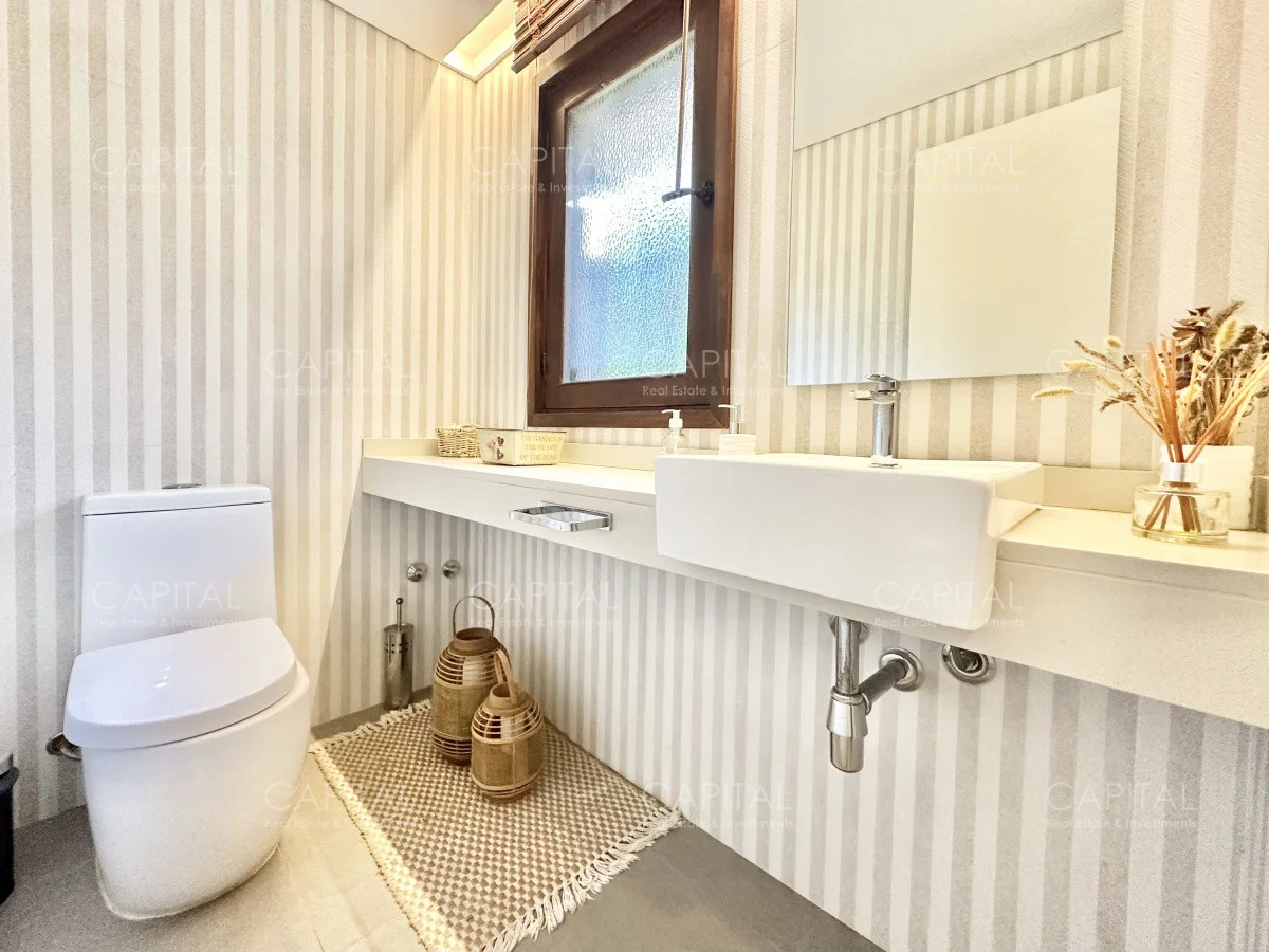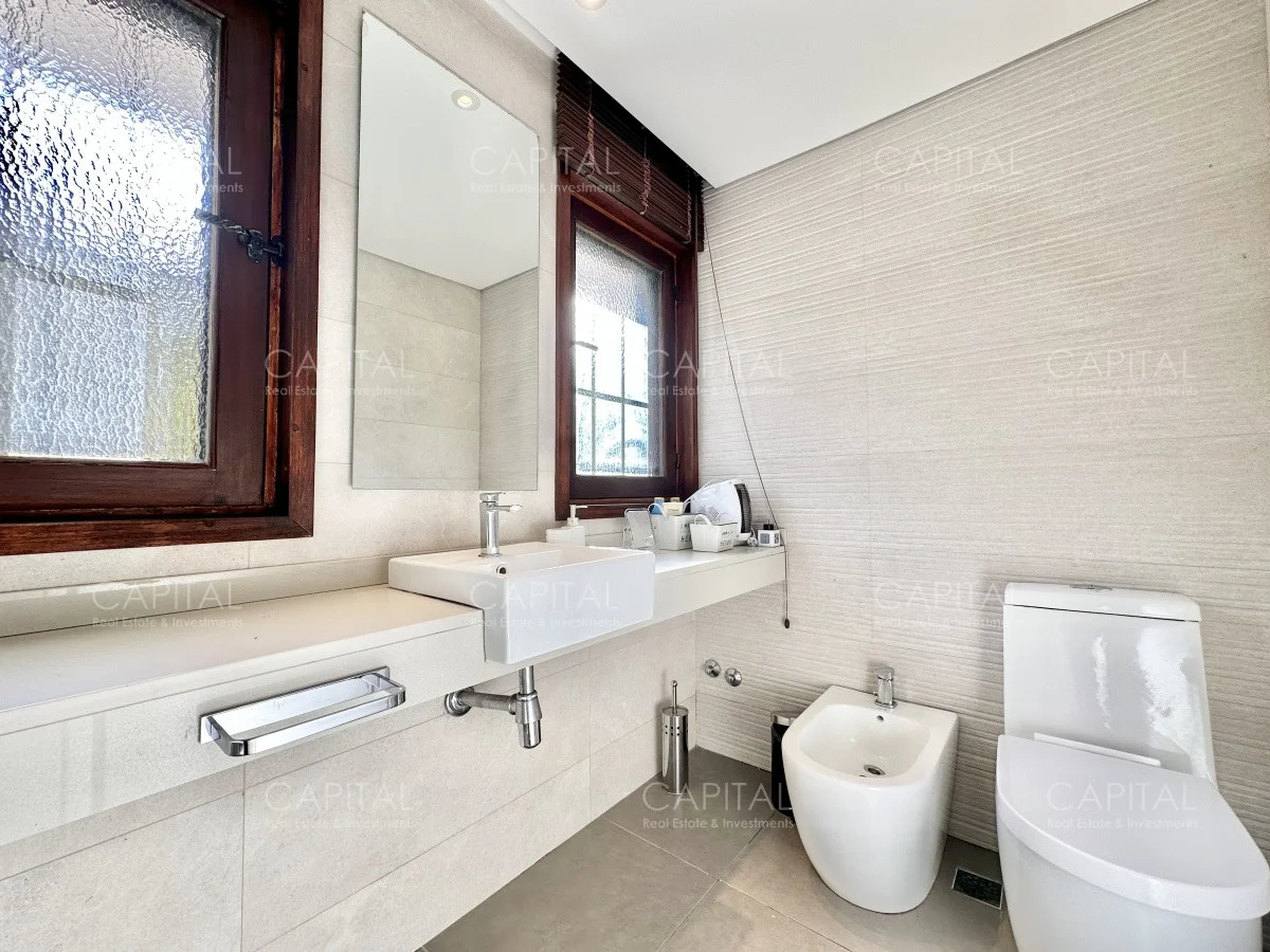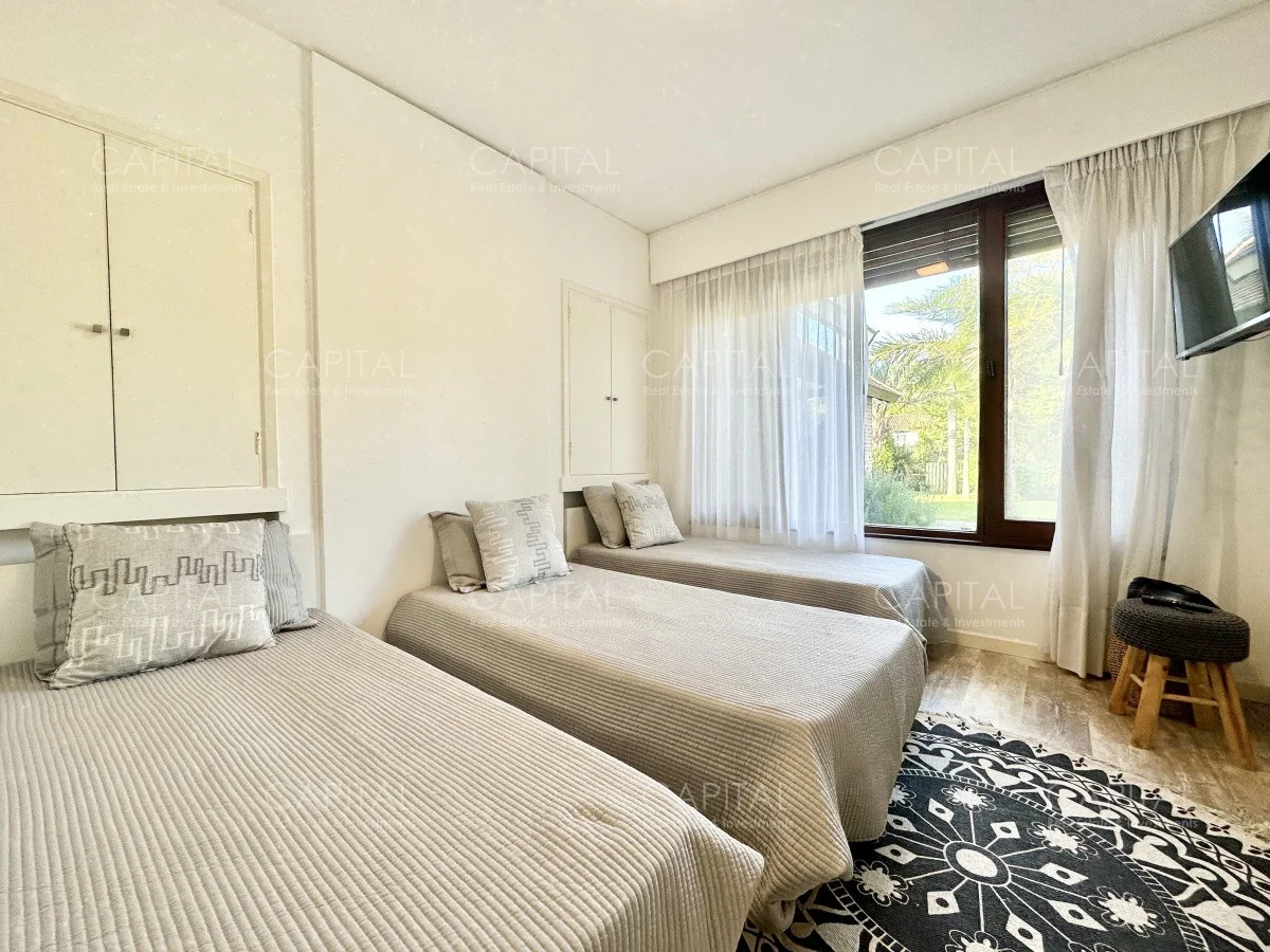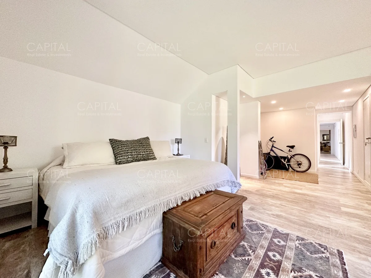 En un lote de 2190 metros cuadrados, con 300 metros cuadrados construidos, la casa se desarrolla en una sola planta de solida construcción, consta de cuatro dormitorios de los cuales dos de ellos son en suite + dependencia de servicio con baño.