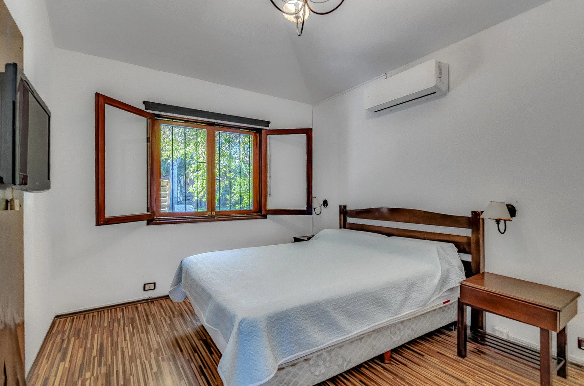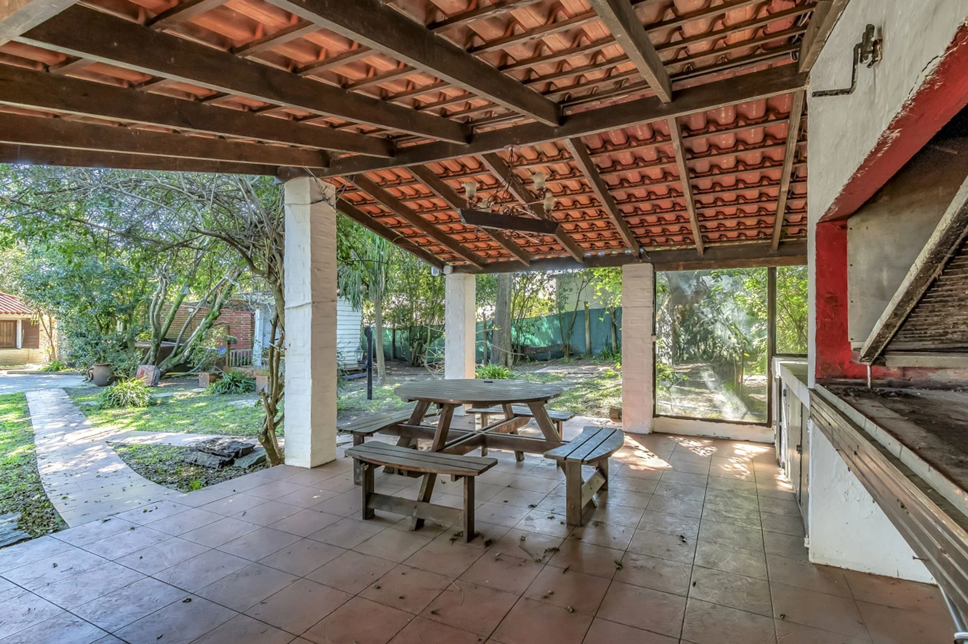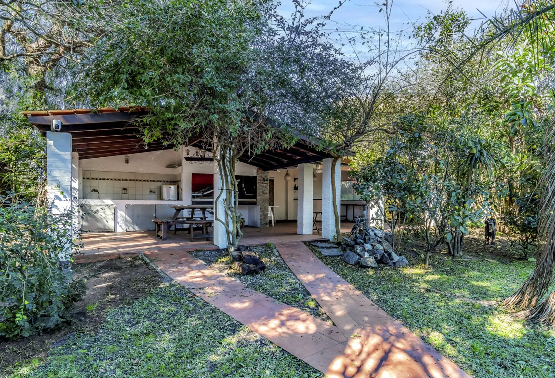 En el exterior posee un jardín verde y espacioso, una piscina y una parrilla techada.