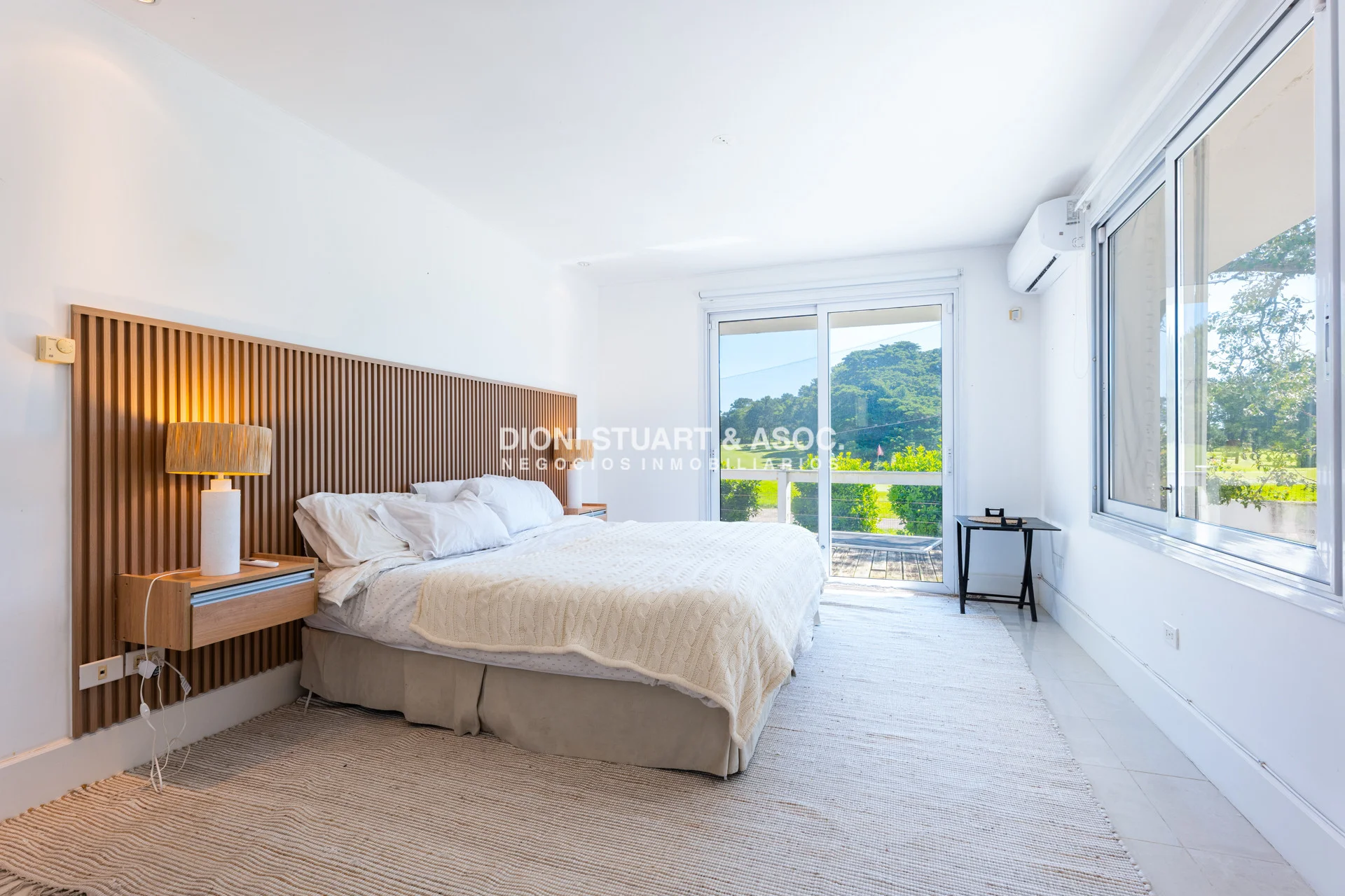 Poder adquirir esta casa es acceder a una ubicación privilegiada con acceso al Golf. Esta casa contempla 450m2 edificados en la mejor construcción sobre un lote esquinero de 1886m2 que comparte medianera con el Hoyo 7 del Golf, lo que permite, desde ciertos lugares de la casa, acceder a una vista muy particular sobre los campos de golf, tal cual como si fuese un espectador. La casa consta de 4 dormitorios y 4 baños (tres en suite), el dormitorio principal cuenta con doble baño y doble vestidor con placares empotrados; gran living-comedor con estar, del cual podremos apreciar la vista al golf y también acceder a una gran terraza con hidromasaje; cocina definida tipo americana con isla y toilette. En el subsuelo, la casa cuenta con un gran play-room con bar con barra, ideal para relajarse; dependencia de servicio con baño y deposito. Como si fuera poco, también ofrece piscina climatizada y una gran barbacoa cerrada. Loza radiante sectorizada, aberturas en DVH, Aire Acondicionado, algunas de sus características. Cuenta con garage para dos autos.