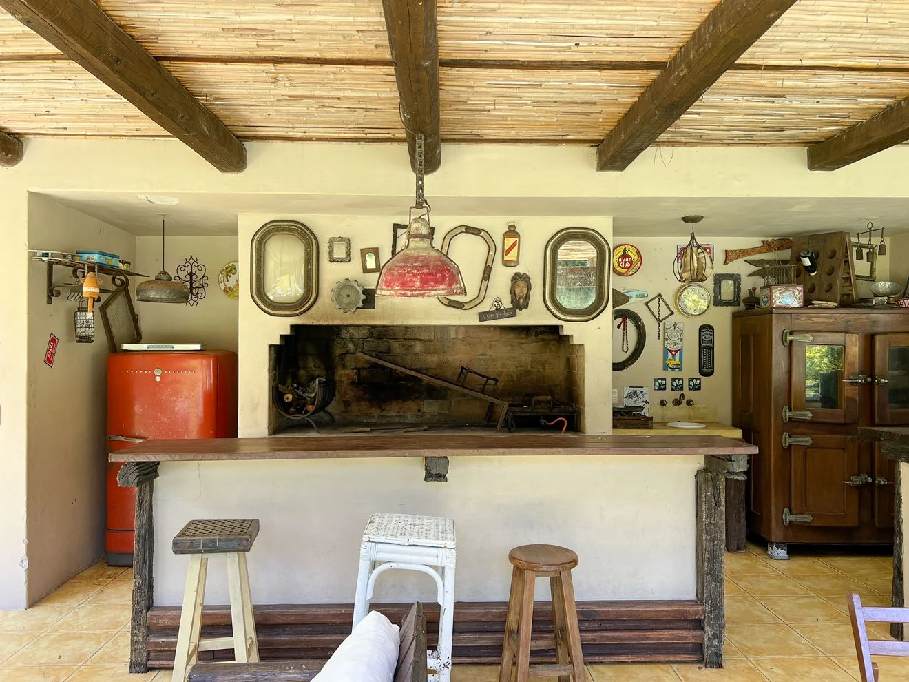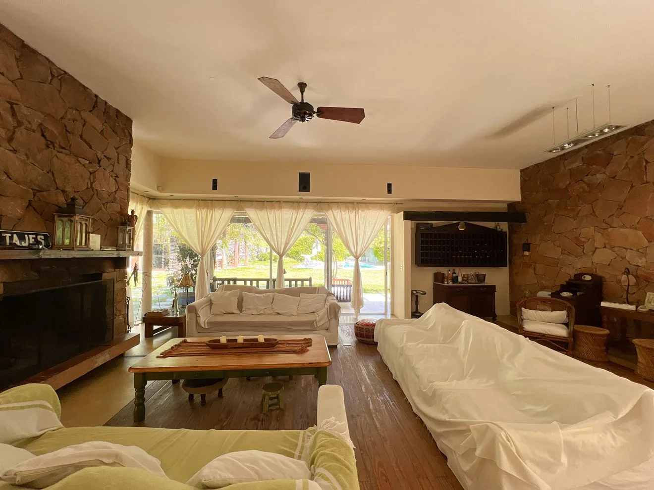 Living con gran chimenea, comedor, cocina definida con comedor diario.