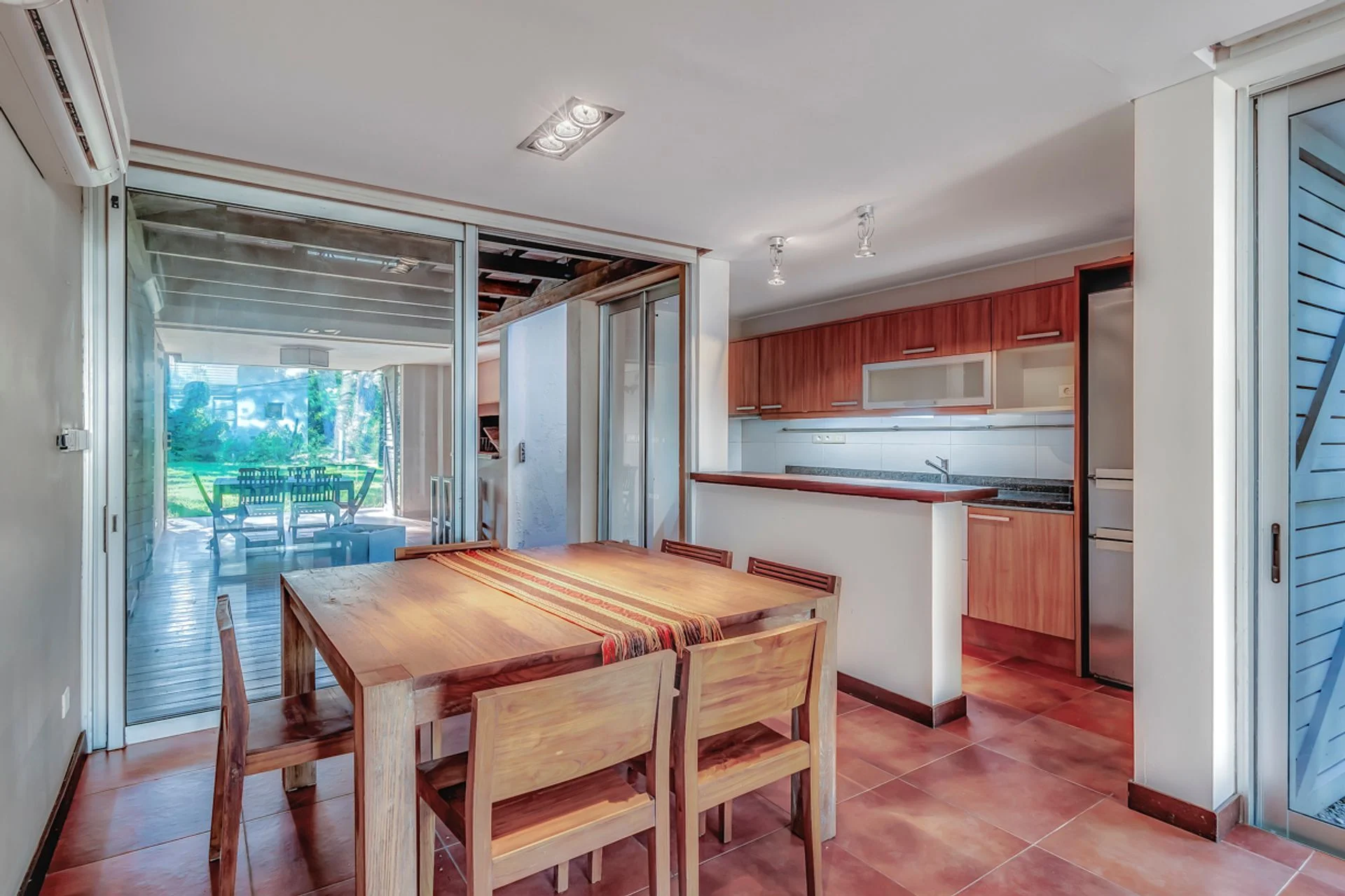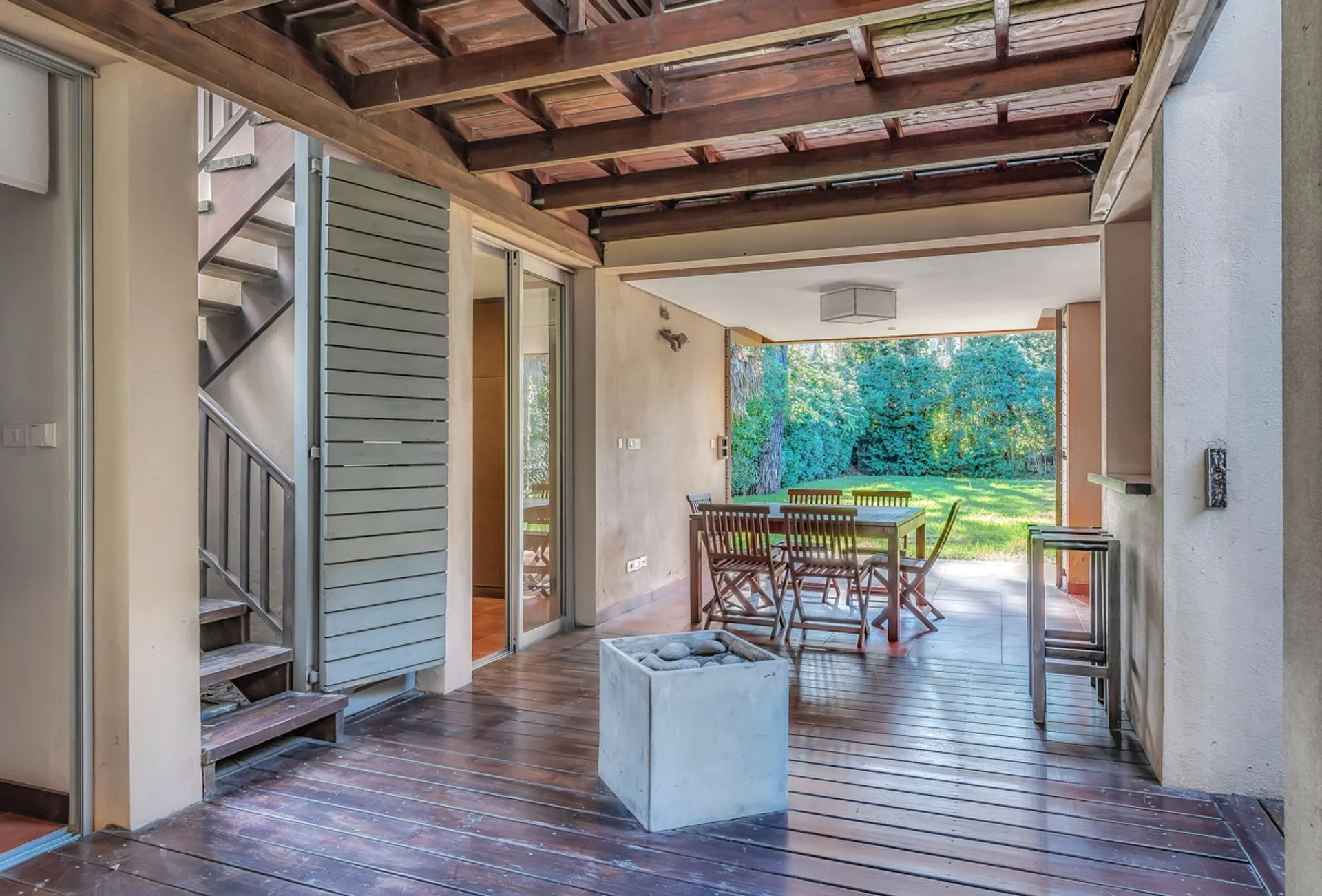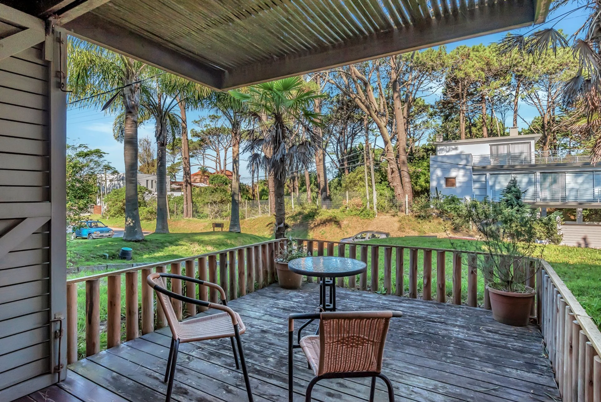 Planta baja: Living comedor con salida a terraza al frente. Cocina integrada con barra desayunadora. Un dormitorio con salida a la terraza. Baño completo. Segundo dormitorio con salida al deck y barbacoa techada. Tercer dormitorio (en suite). La barbacoa conecta con un hermoso jardín.