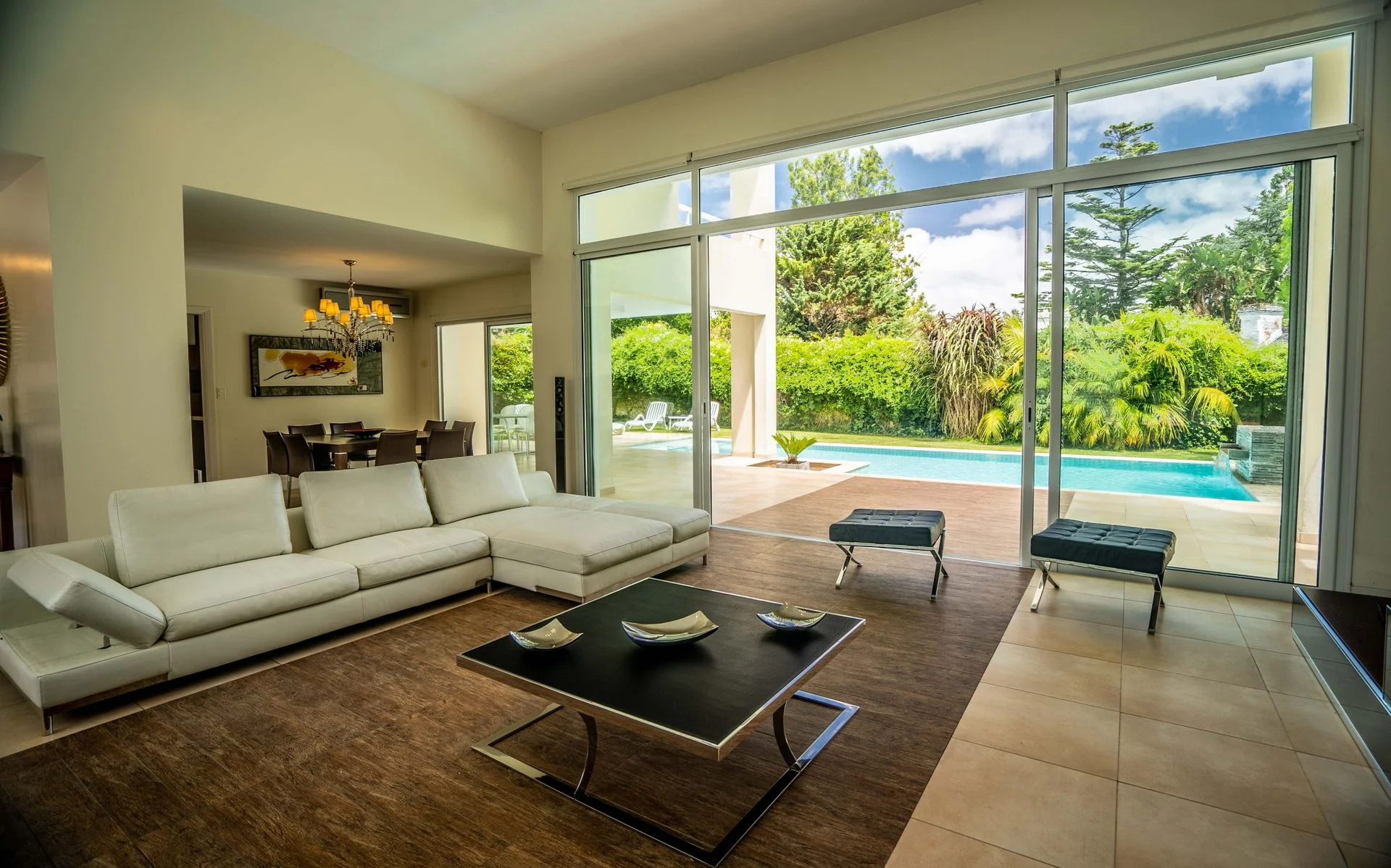 En la planta alta se encuentran tres importantes suites, la principal con vestidor y baños con bañera, y salida a una amplia terraza que comunica con la otra suite sin perder independencia. Completa la planta una suite mas con salida a la terraza , vista al parque y vista al complejo. Total 4 suites + dormitorio de servicio completo. El parque posee una amplia piscina y un parrillero de acero inoxidable de primera calidad. Posee cochera para dos autos con portón eléctrico. Toda la casa posee losa radiante y aires acondicionados de primera, los baños y pisos son de primera calidad, todas las suites poseen Smart TV y finos muebles. Excelentes cerramientos y aberturas.
