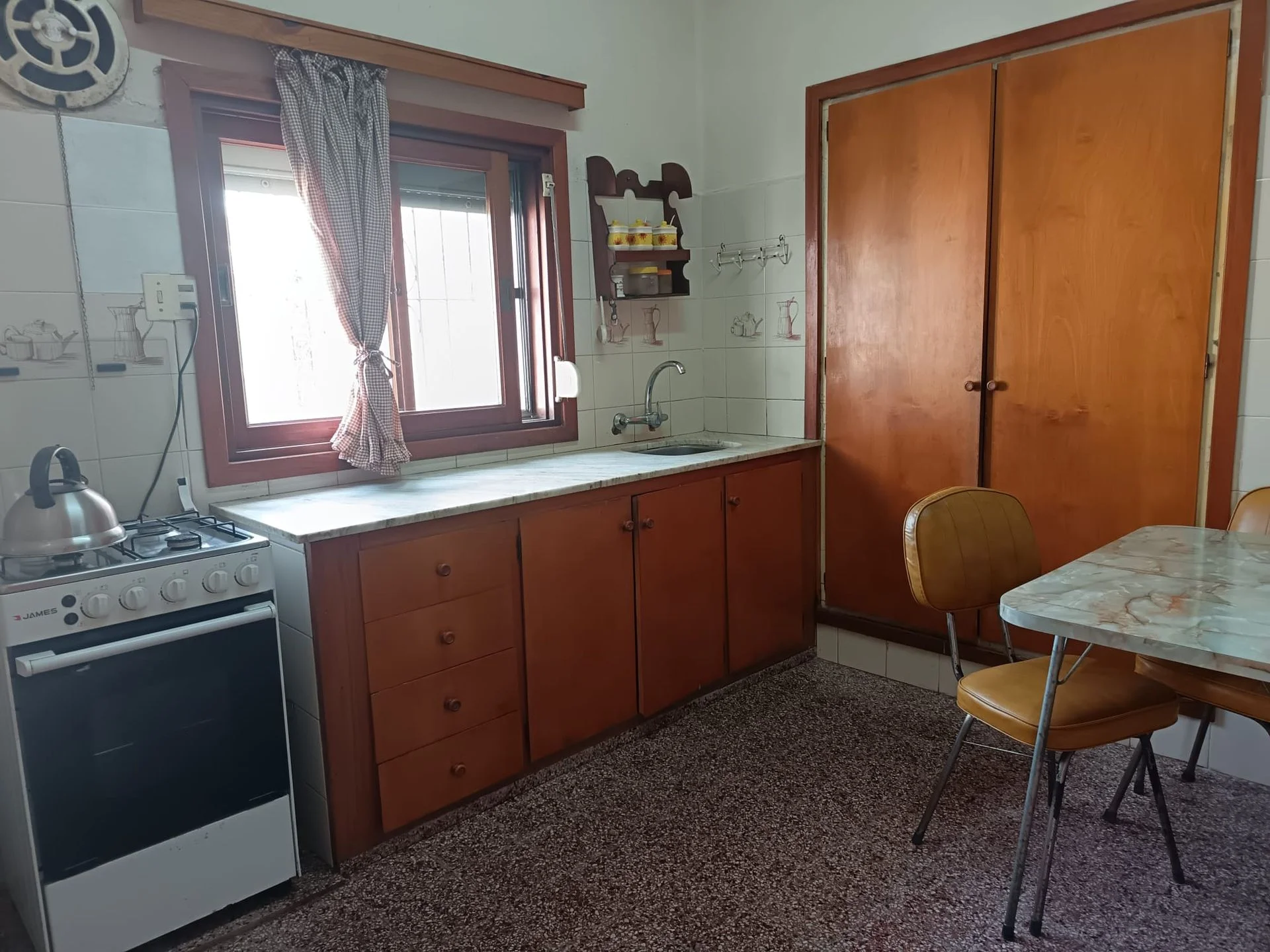 Living amplio y luminoso, estufa a leña y cocina definida con buen espacio de almacenamiento.
