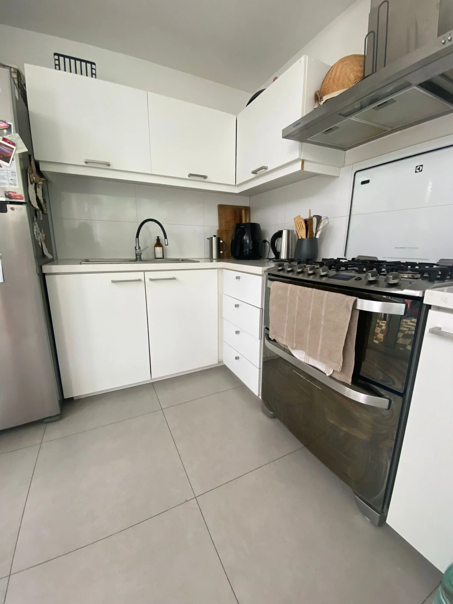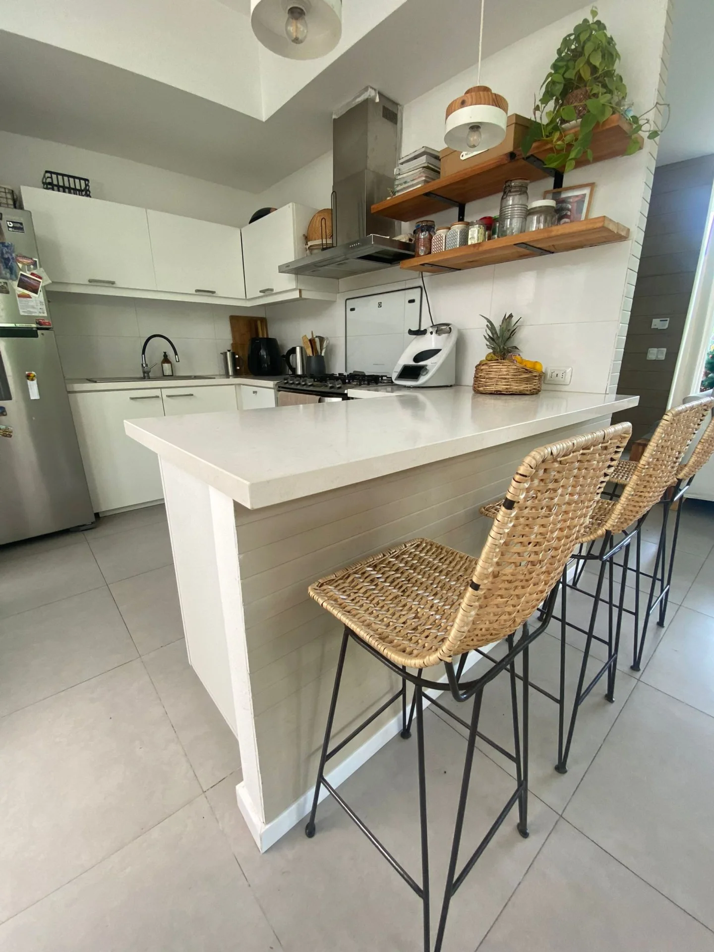 Cocina integrada, con barra ideal para desayunar, horno doble a gas con 5 hornallas y extractor.