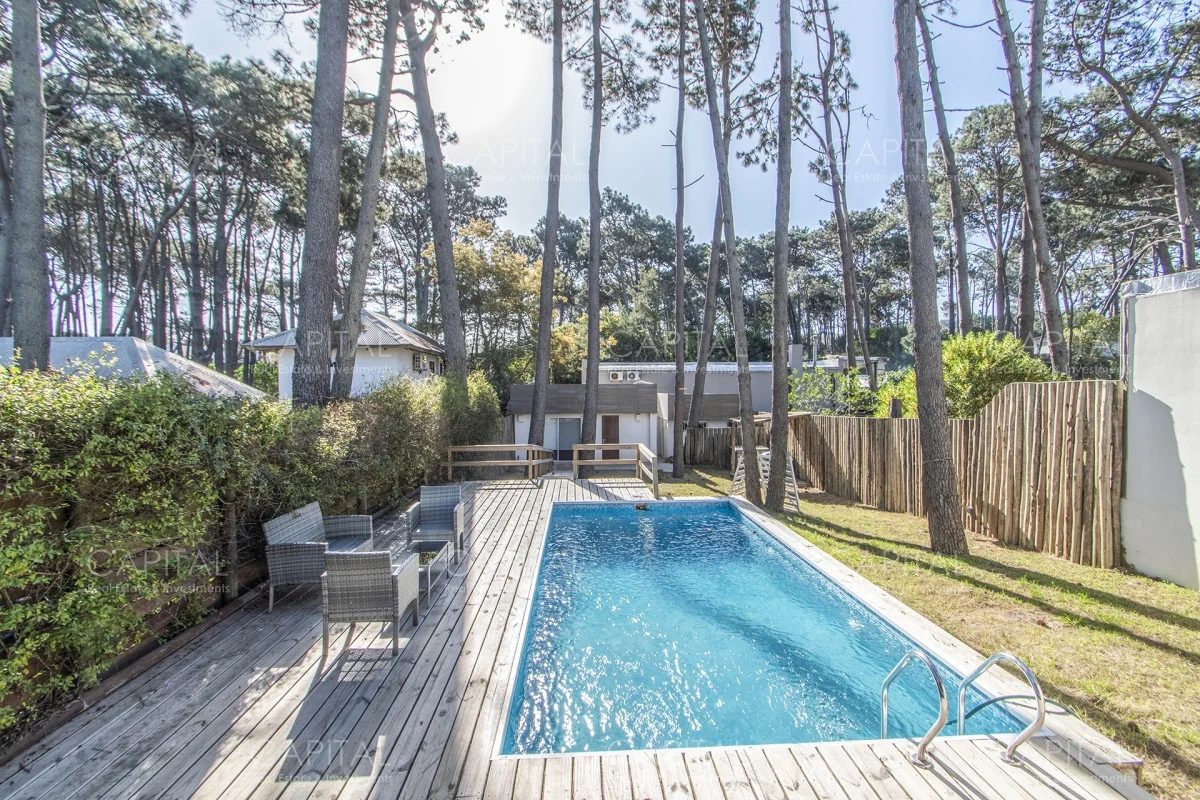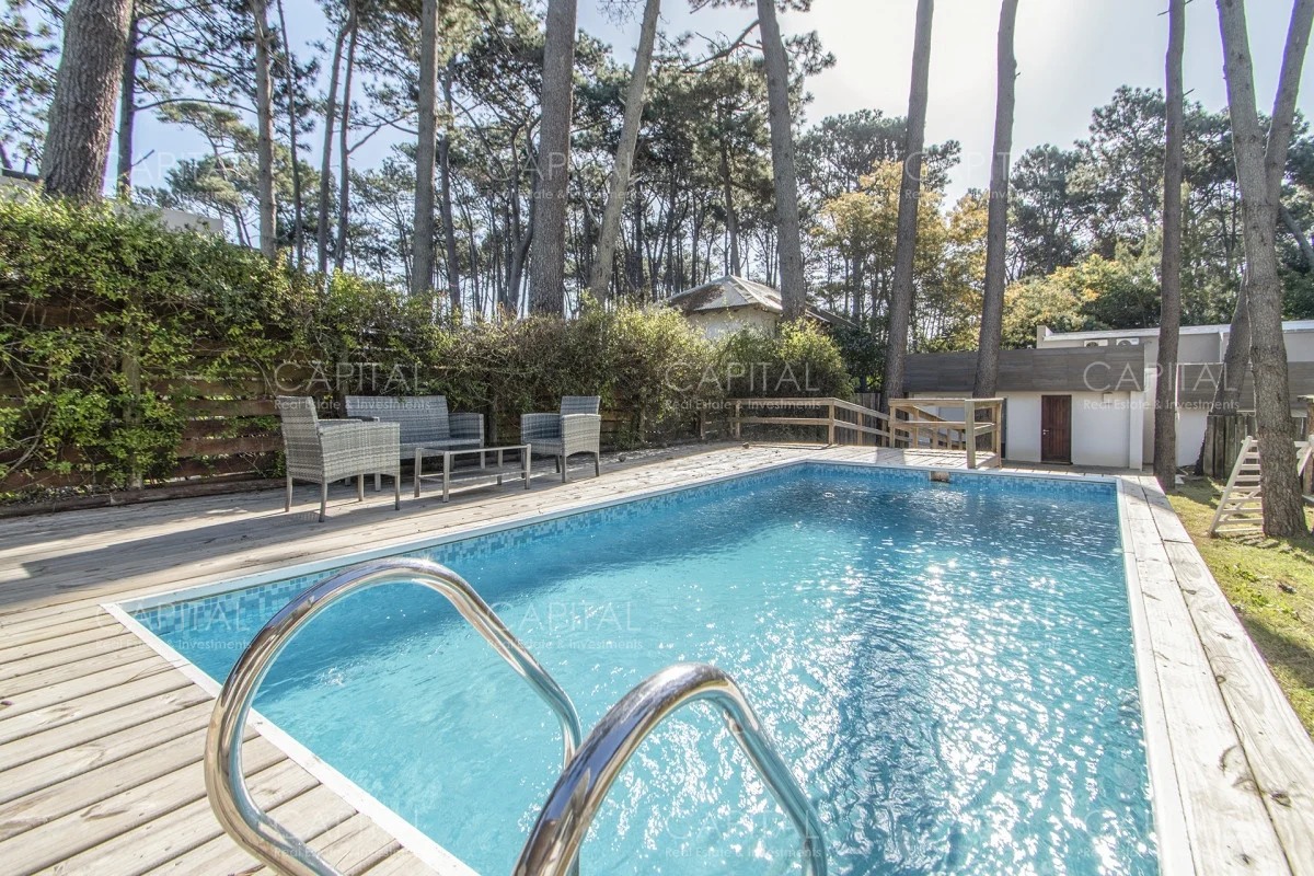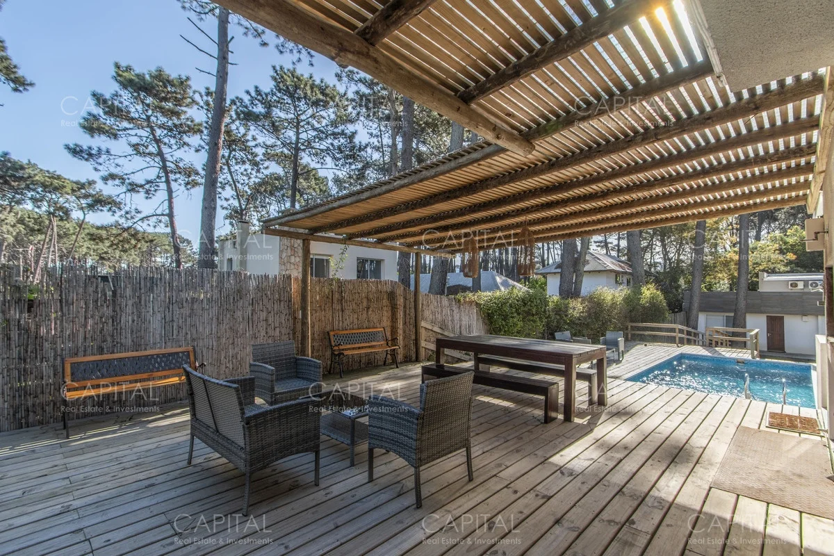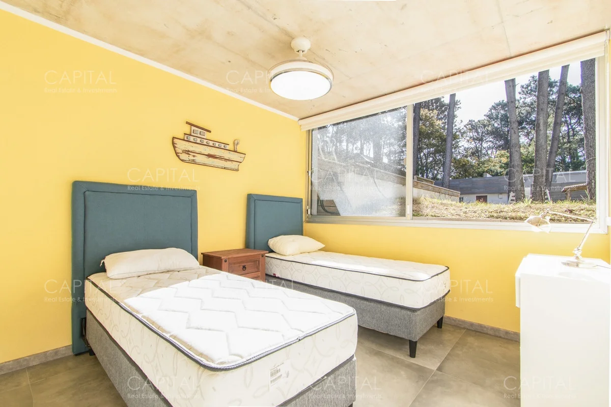 Lindísima casa con cuatro dormitorios (dos en suite) y tres baños, casa con ambientes espaciosos y con mucha iluminación natural. La casa cuenta con tres plantas, la planta de abajo cuenta con dos dormitorios amplios y con mucha iluminación y un baño, la segunda planta se puede disfrutar de un gran living comedor con cocina integrada y salida al jardín con una gran piscina y en la ultima plata se encuentra el dormitorios principal en suite con salida a una terraza al frente. La cuarta habitación se encuentra apartada con entrada independiente y baño propio, además se cuenta con Dependencia de servicio con baño