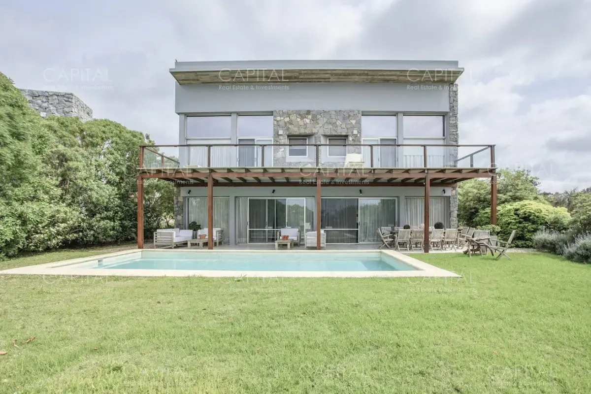 Exclusiva casa de lujo, de dos plantas en barrio privado con vista al mar, 4 dormitorios en suite, living comedor, sala de tv, toilette, dormitorio de servicio, amplia cocina con parilla, jardines con muebles y deck con reposeras. Lavadero completo. Piscina propia climatizada y piscina y canchas de tenis y fútbol en el complejo. Servicio de playa. Seguridad las 24hs y servicios diarios de limpieza, jardinero y piletero incluidos. Excelente vajilla y ropa de cama. Wi Fi y TV con cable. Lavadero. Capacidad para 8 personas + habitación de servicio para 2 personas con baño.