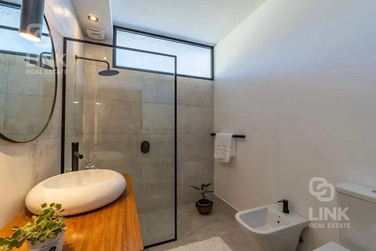 Desarrollada en dos plantas sobre 1.184 m² de terreno, cuenta con amplio living con ventanales, comedor integrado, cocina definida, cuatro dormitorios (uno en suite con vestidor y terraza privada), y tres baños completos.