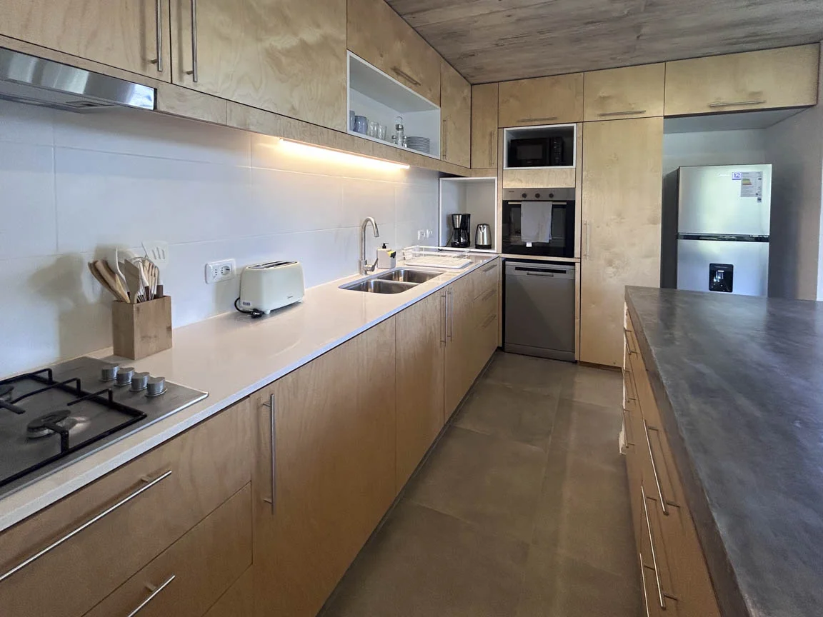 Se distribuye en varios niveles, en el superior se encuentra el acceso principal que da hacia un espacioso ambiente que combina living-comedor con estufa a leña y cocina integrada, baño social y el dormitorio principal con baño en suite.