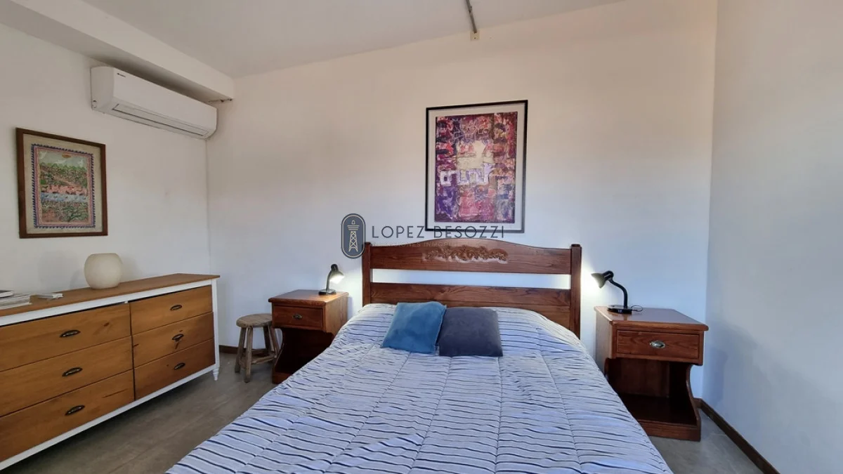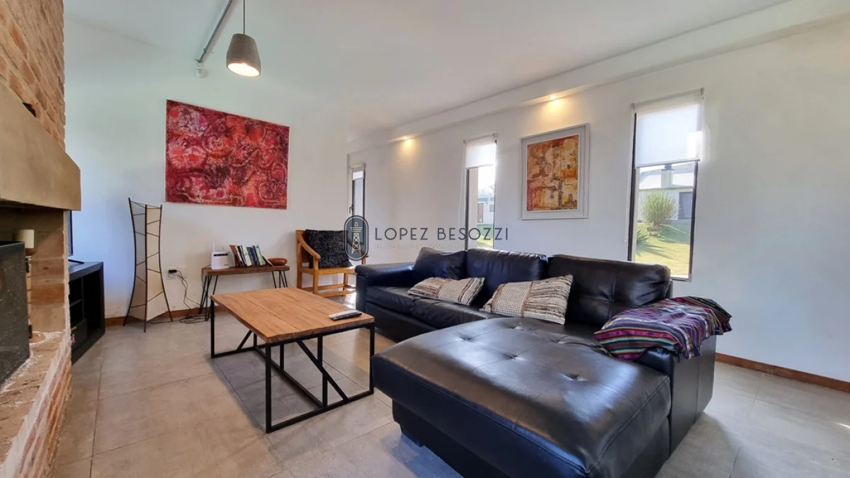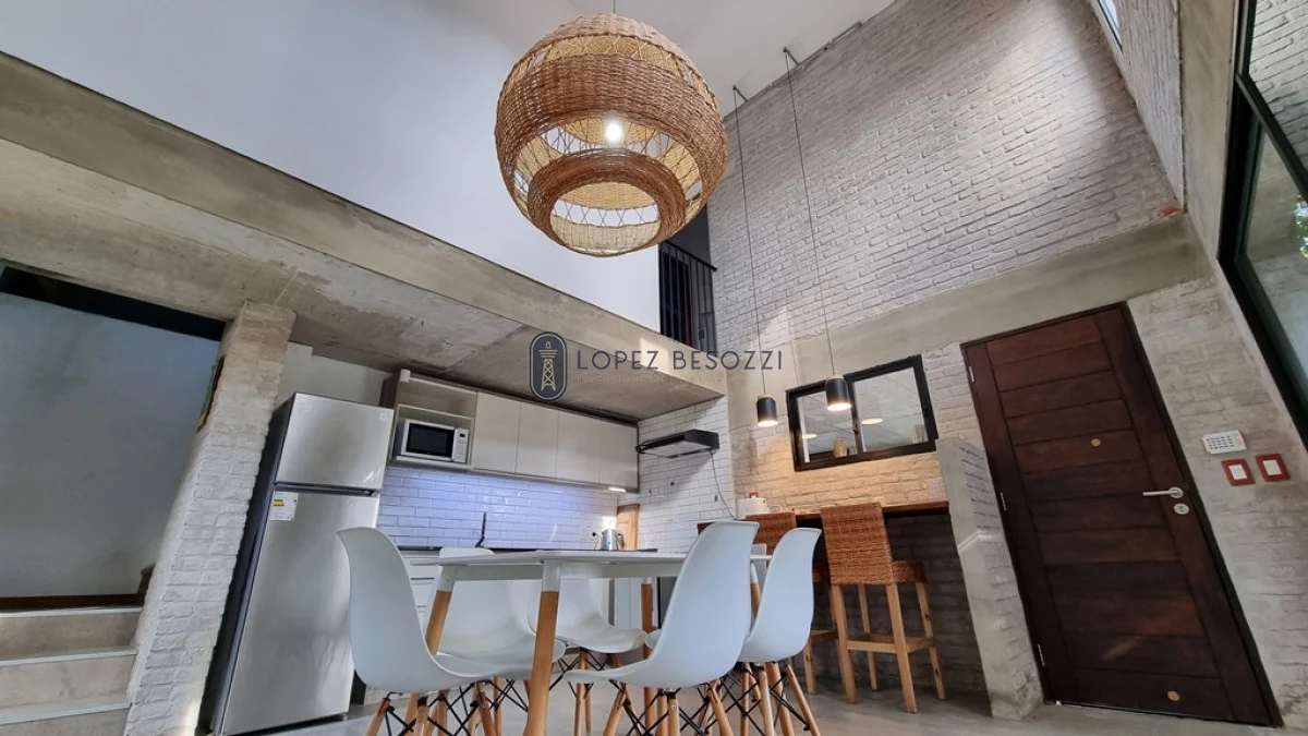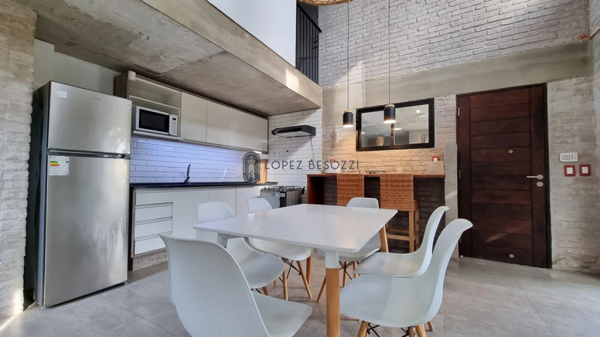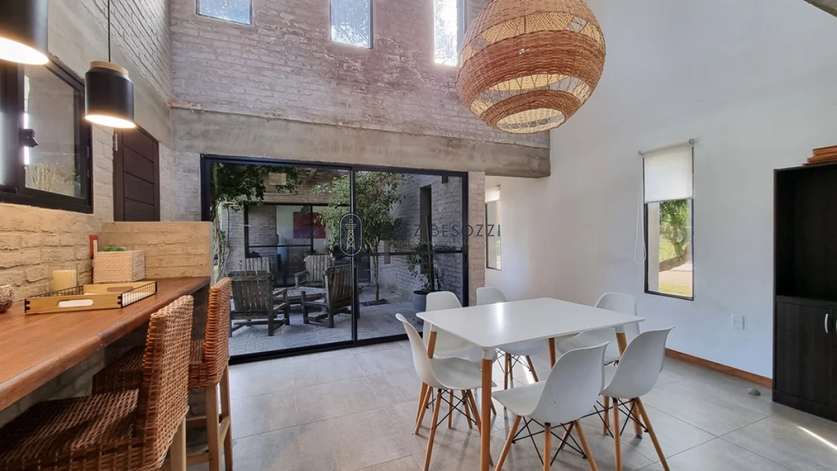 En planta baja posee living con estufa a leña tradicional con ventanales hacia el jardín de invierno y enfrentado al mismo se encuentra la cocina-comedor con gabinetes aéreos y bajo mesada con la particularidad de contar techo a doble altura para mayor luminosidad en el ambiente; pasillo de distribución hacia un dormitorio y baño completo.