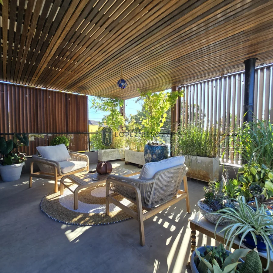 En el exterior y de muy buena privacidad se encuentra el parrillero con horno, deposito y lavadero; deck y pérgola en madera dura; piscina climatizada con bomba de calor inverter y cochera cubierta para vehículos con portón en madera basculante.