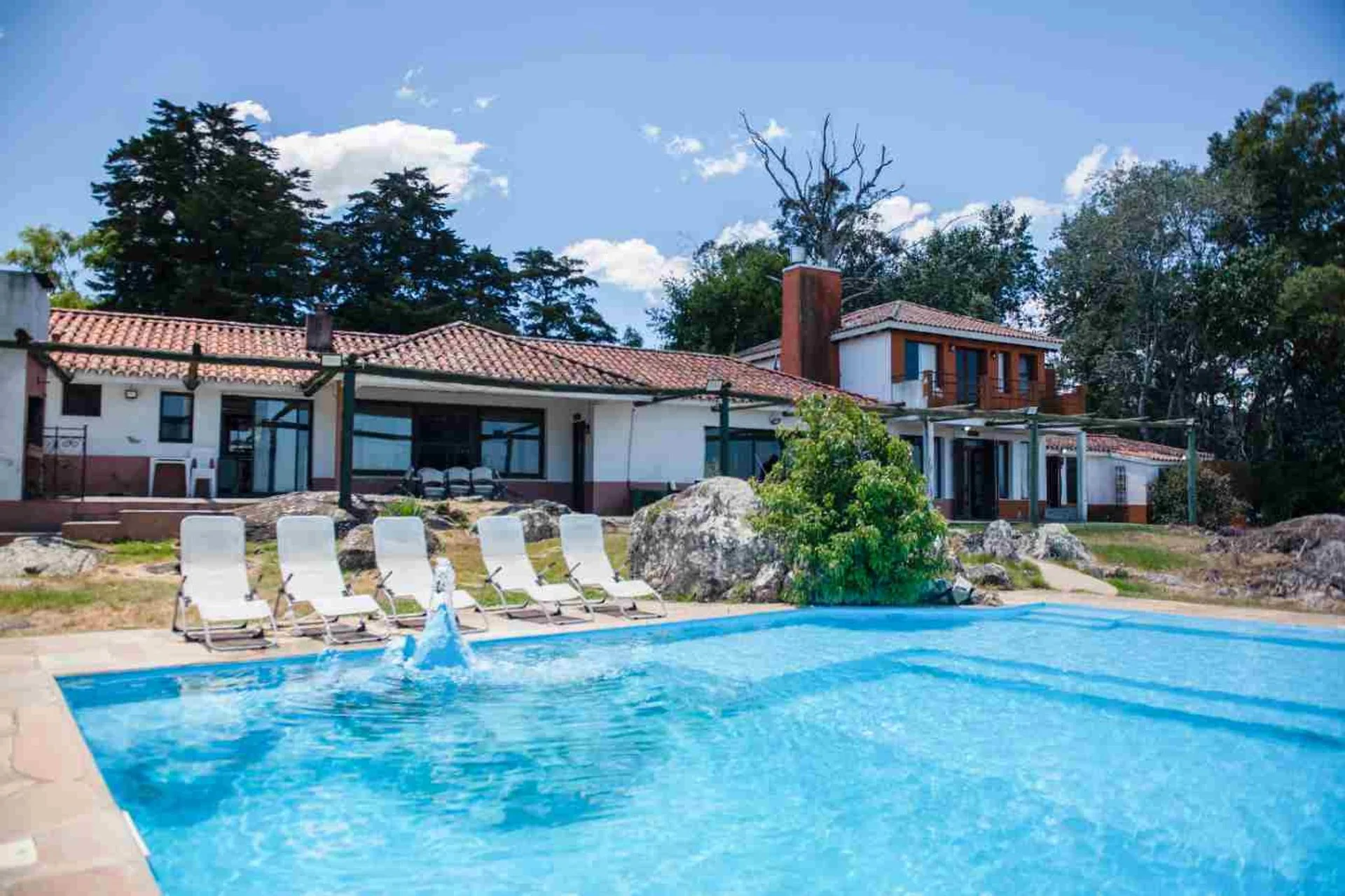 El entorno se destaca por un parquizado con afloramientos de rocas naturales, piscina y grandes áreas verdes de esparcimiento.