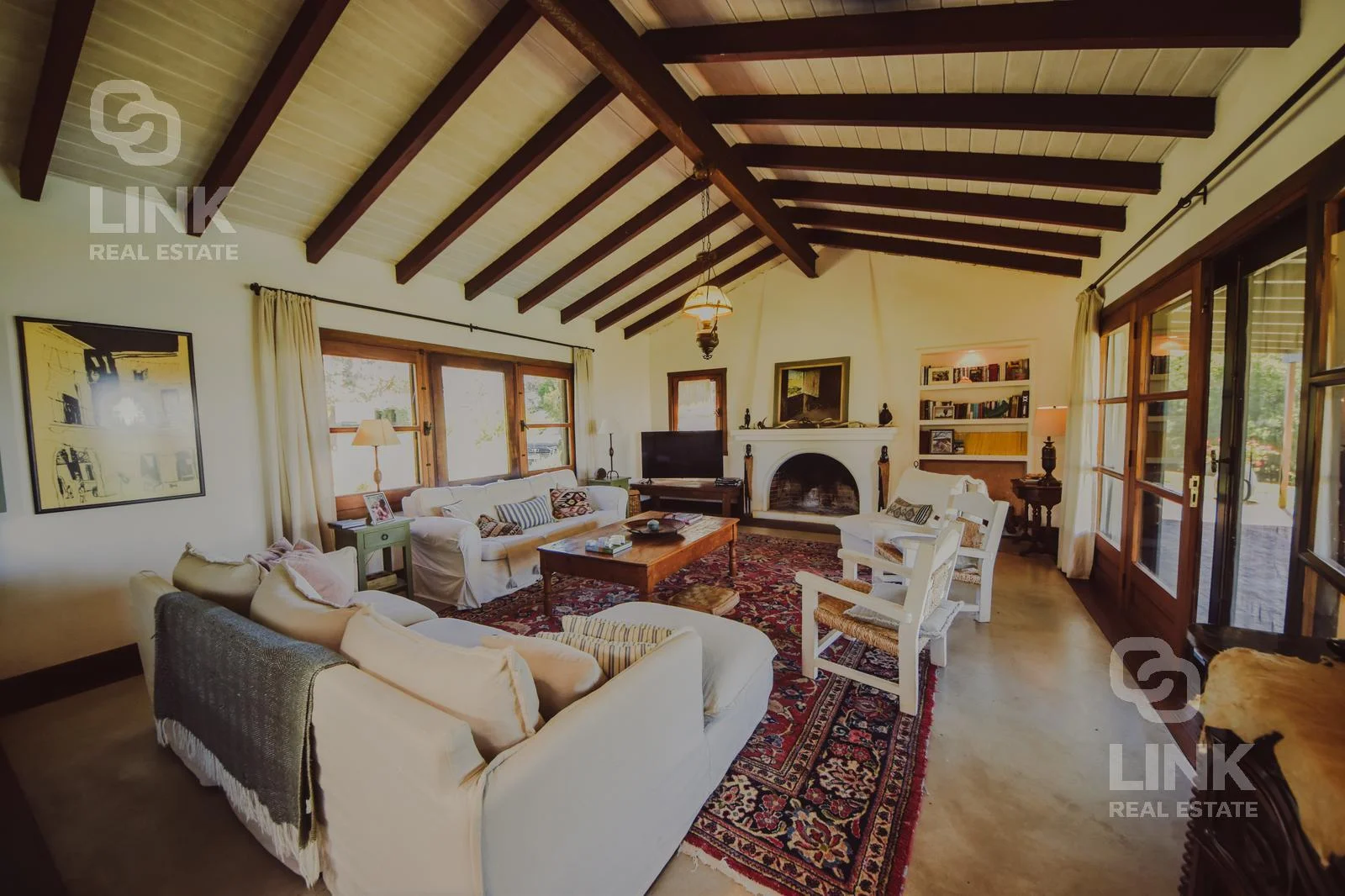 Una gran galería conecta los espacios interiores con el exterior, invitando a disfrutar de las vistas, el aire puro y la serenidad del paisaje. El parque, con árboles de diversas especies y una gran piscina, completa este entorno único, donde la naturaleza y la tranquilidad son protagonistas.