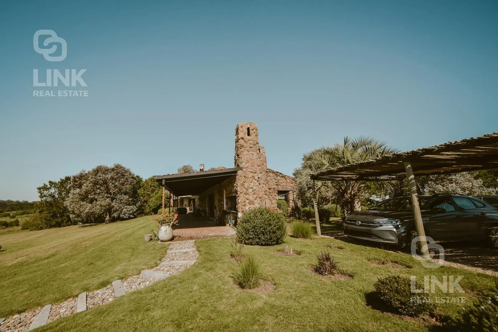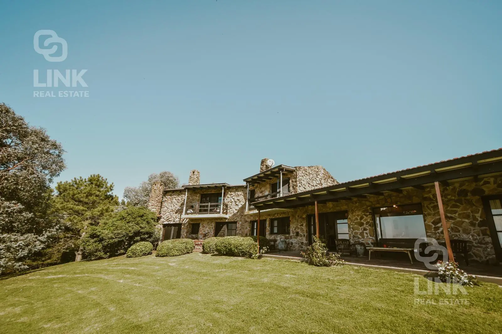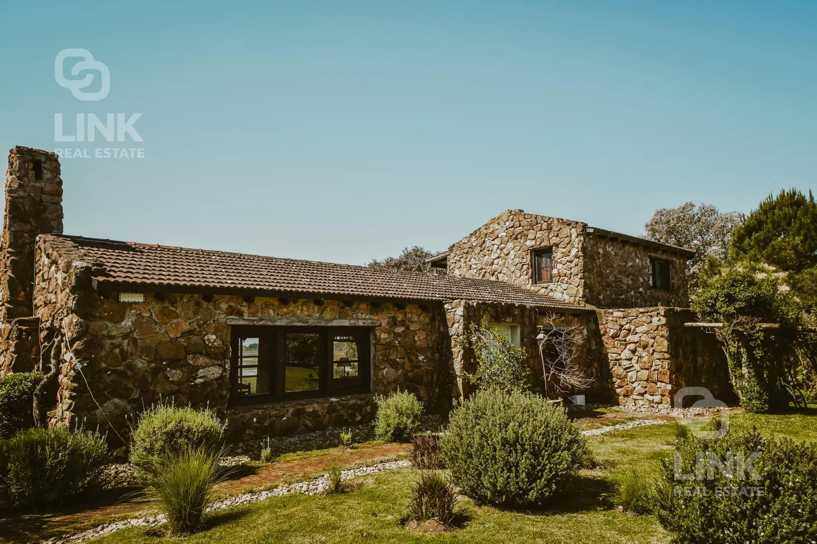 El paisajismo, cuidadosamente integrado al entorno, enmarca una casa de piedra estilo casco de estancia que combina el encanto rural con el confort moderno.