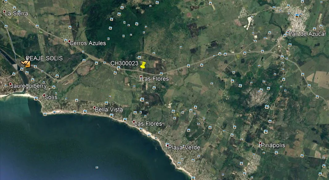 CHACRA ESTACION LAS FLORES MALDONADO APTA COMERCIO O ESTACION DE SERVICIO ZONA SOLIS CH300023 3 hectáreas con casi 300 mts de frente sobre lado norte de ruta interbalnearia. En esquina con camino vecinal y enlace de acceso a parada de ómnibus, frente al cruce con la ruta 71 que conduce a playa Las Flores, todas variables que hacen una zona de baja velocidad sobre la ruta y la hacen ideal para emprendimiento industrial y comercial de cualquier tipo incluyendo Estación de Servicio.
