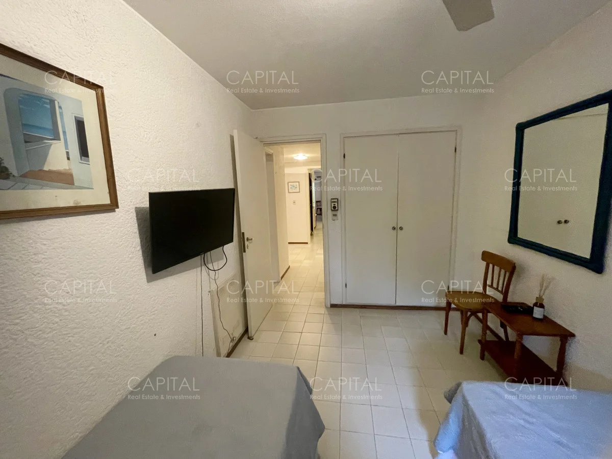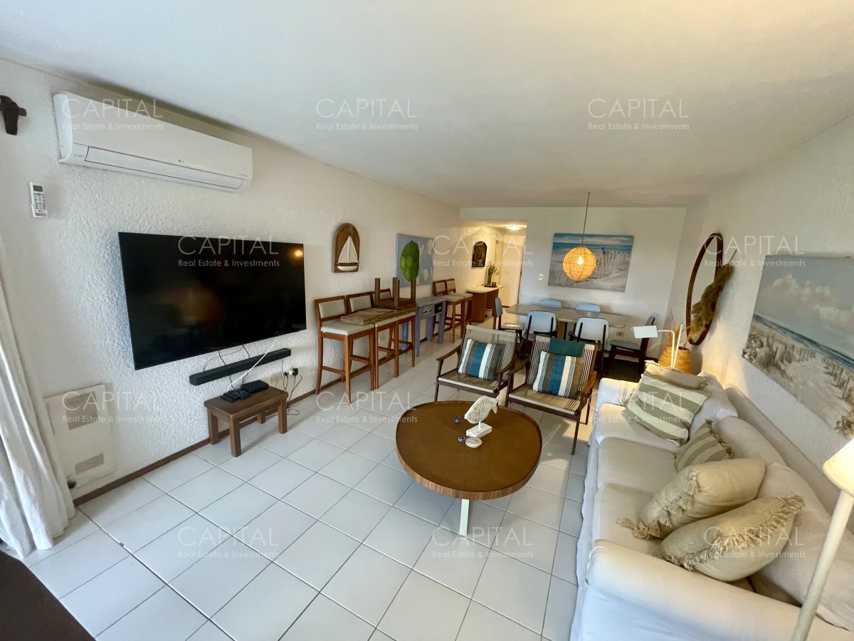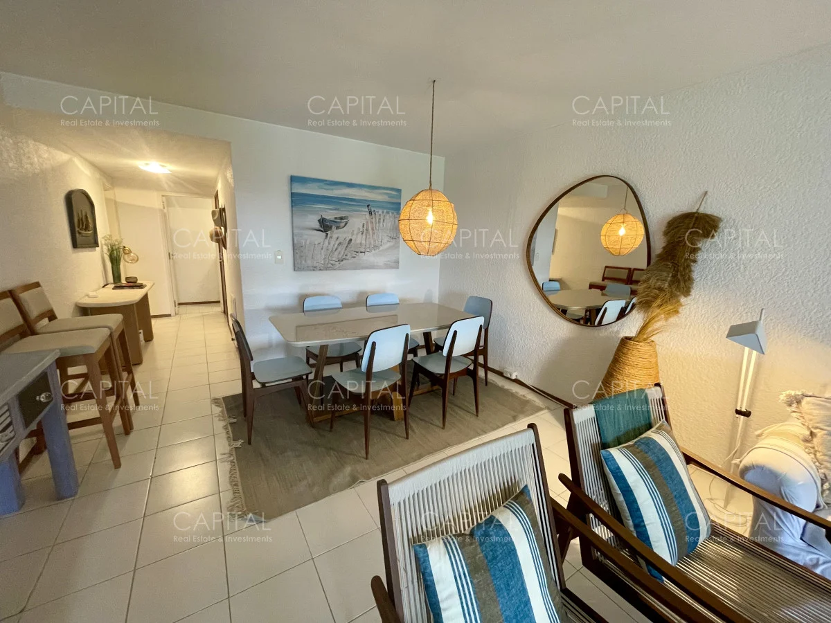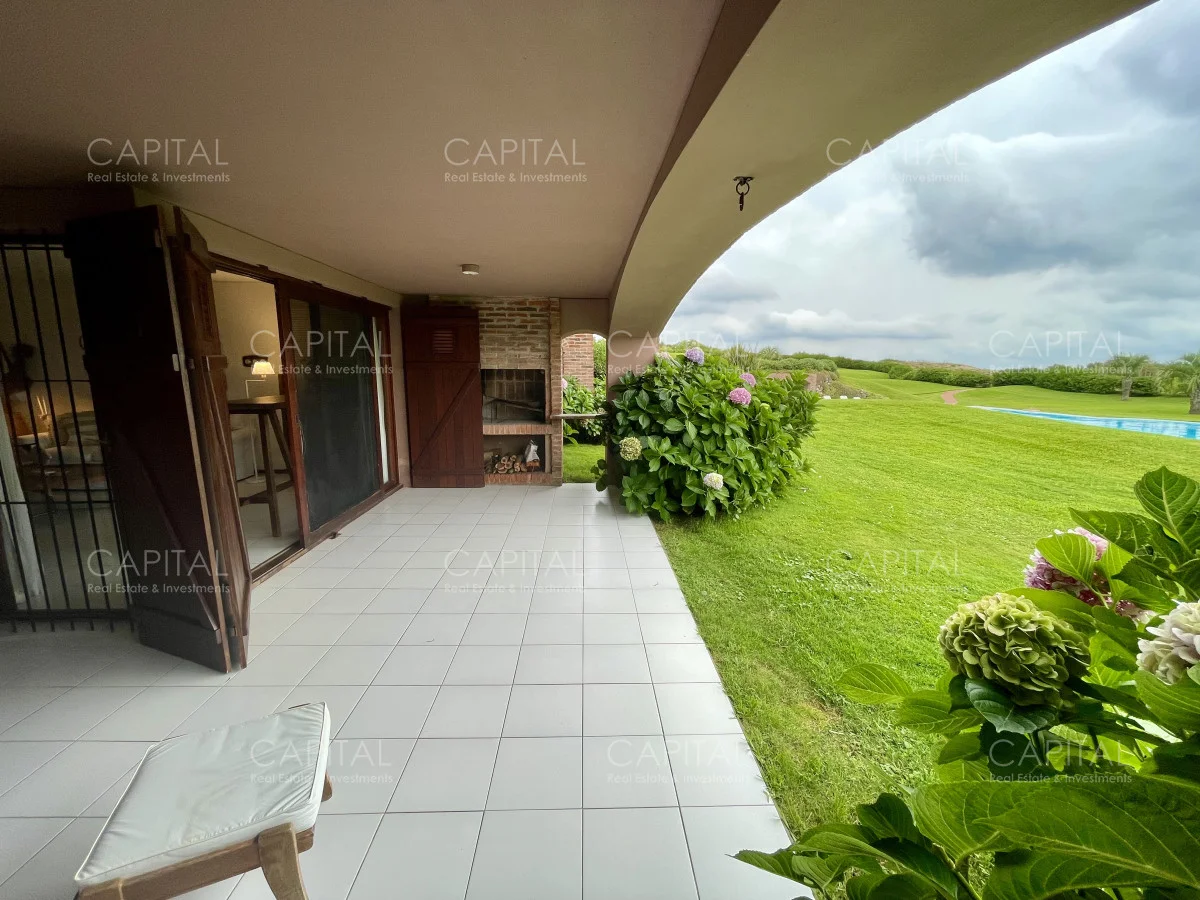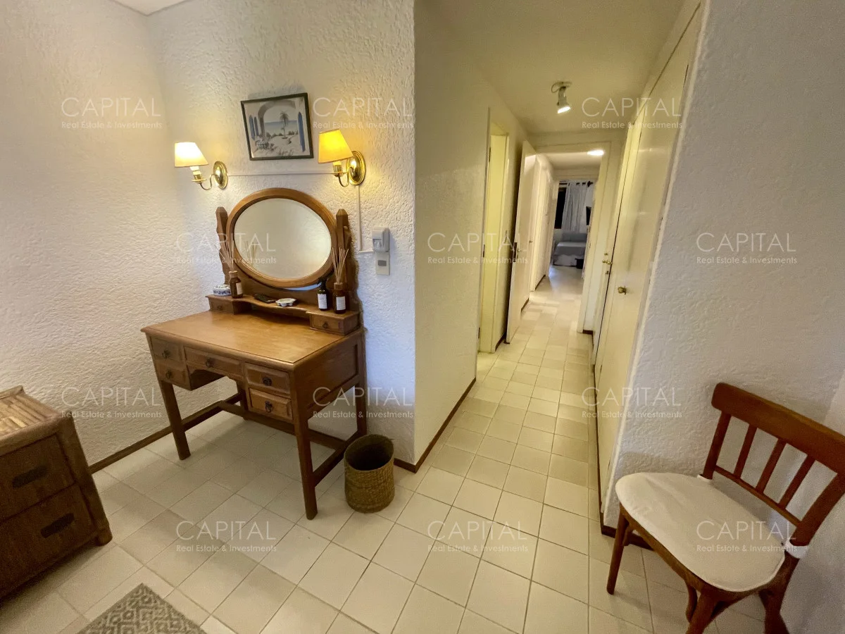 En edificio bajo, clásico y sólido con ubicación privilegiada frente al mar en la exclusiva zona de Manantiales. Departamento planta baja estilo casa de cómodas dimensiones, cuenta con living comedor con salida directa al jardín, terraza con parrillero techado, cocina definida con terraza lavadero, 2 dormitorios, 2 baños y dependencia de servicio con baño ( modificada para transformarse en 3er dormitorio). Cochera techada fija, edificio con servicio de mucamas y playa, seguridad 24 hs.