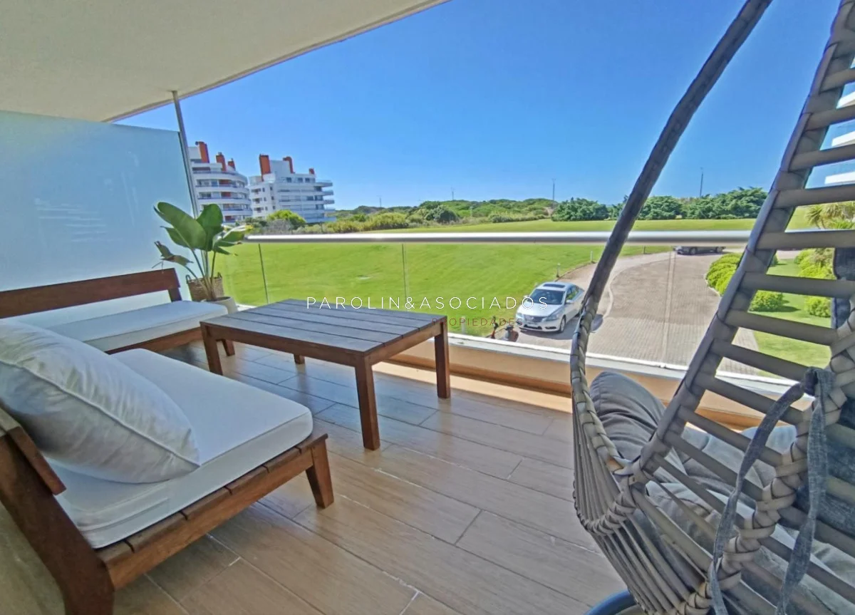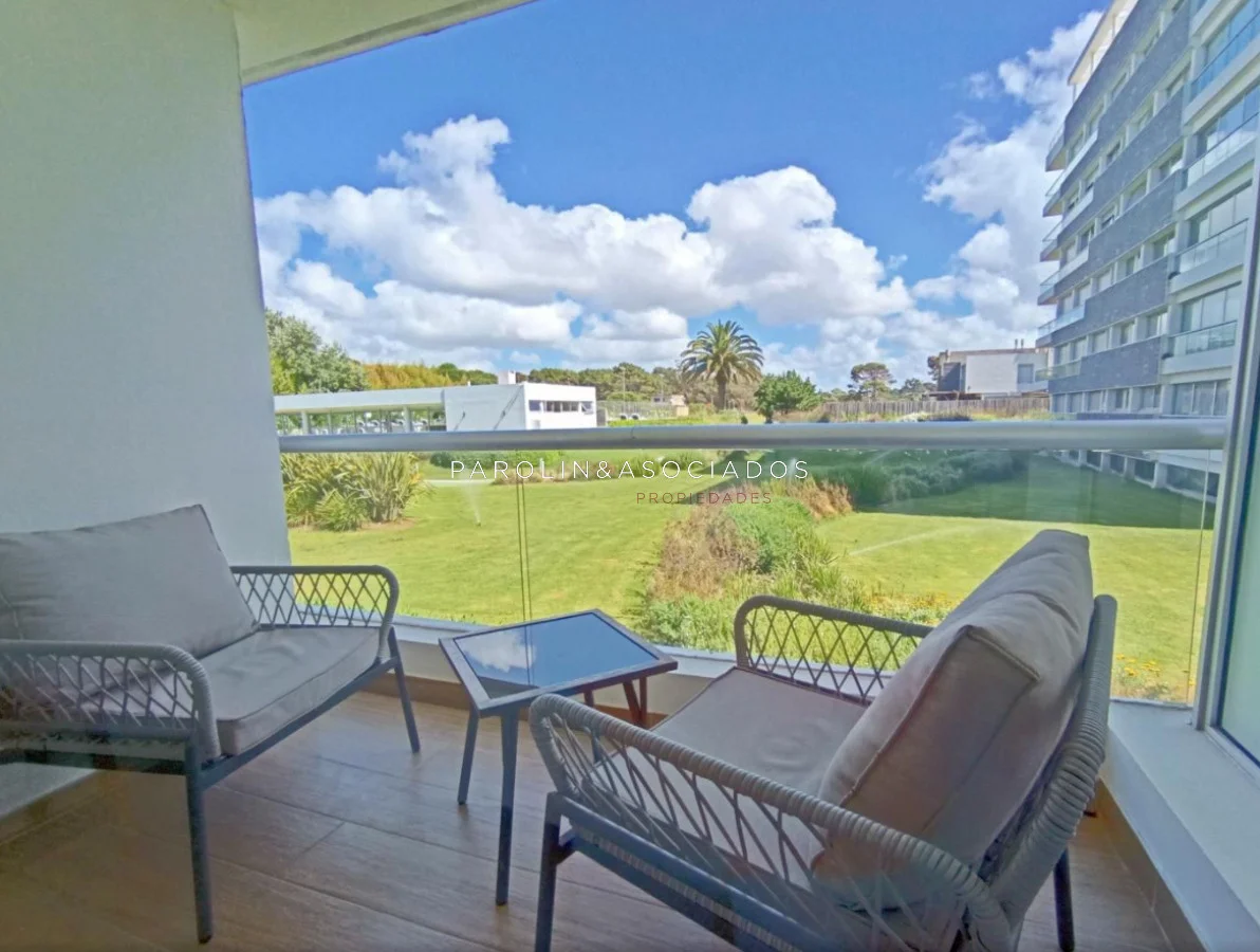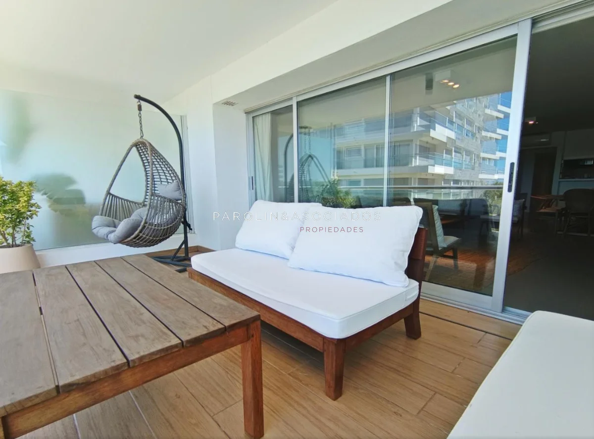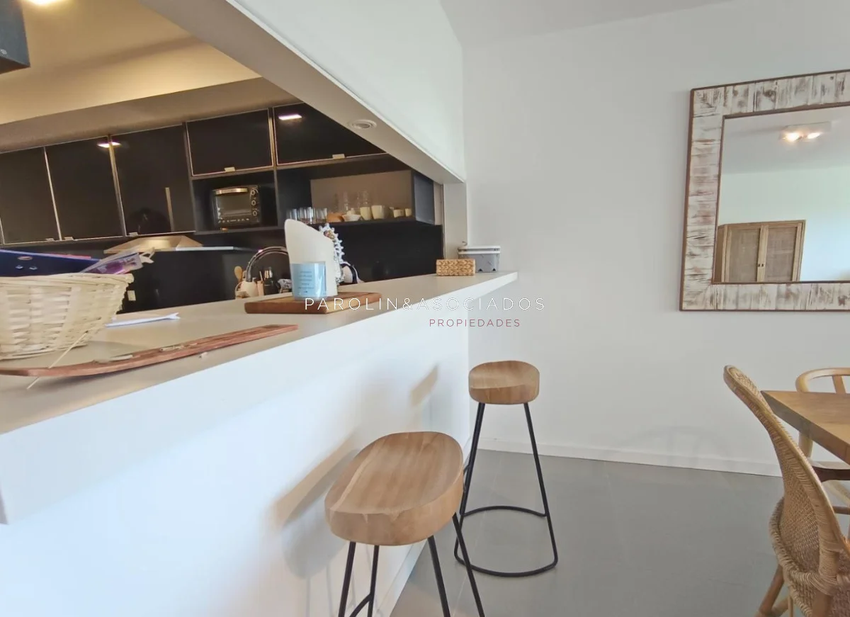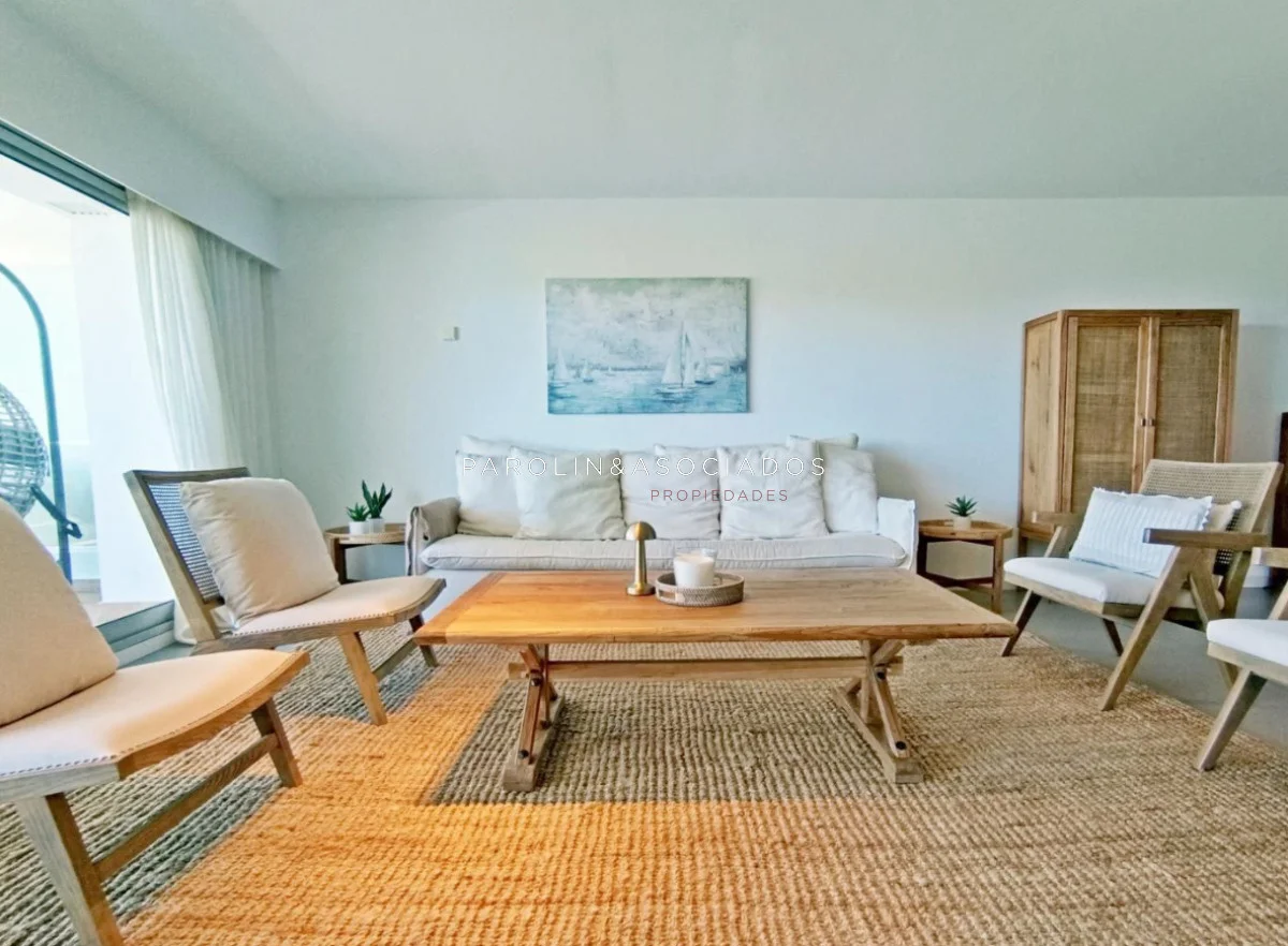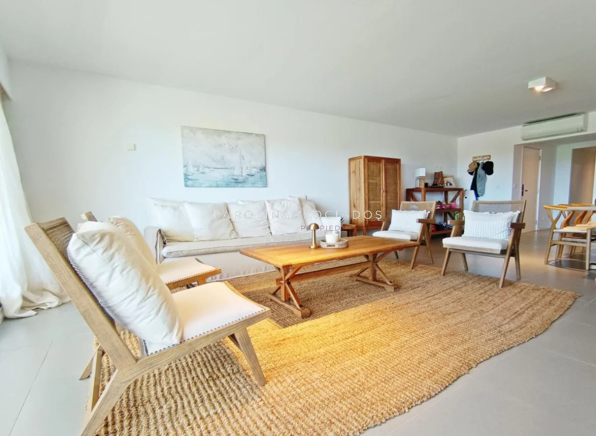 Amplio living-comedor con salida a la terraza, vista al mar, cocina con pasa platos, toilette, 2 cómodas suites con vestidor, dormitorio ppal con teraza vista al parque. Losa radiante sectorizada, aire acondicionado. Garaje doble. Complejo frente al mar con completos amenities de categoría.