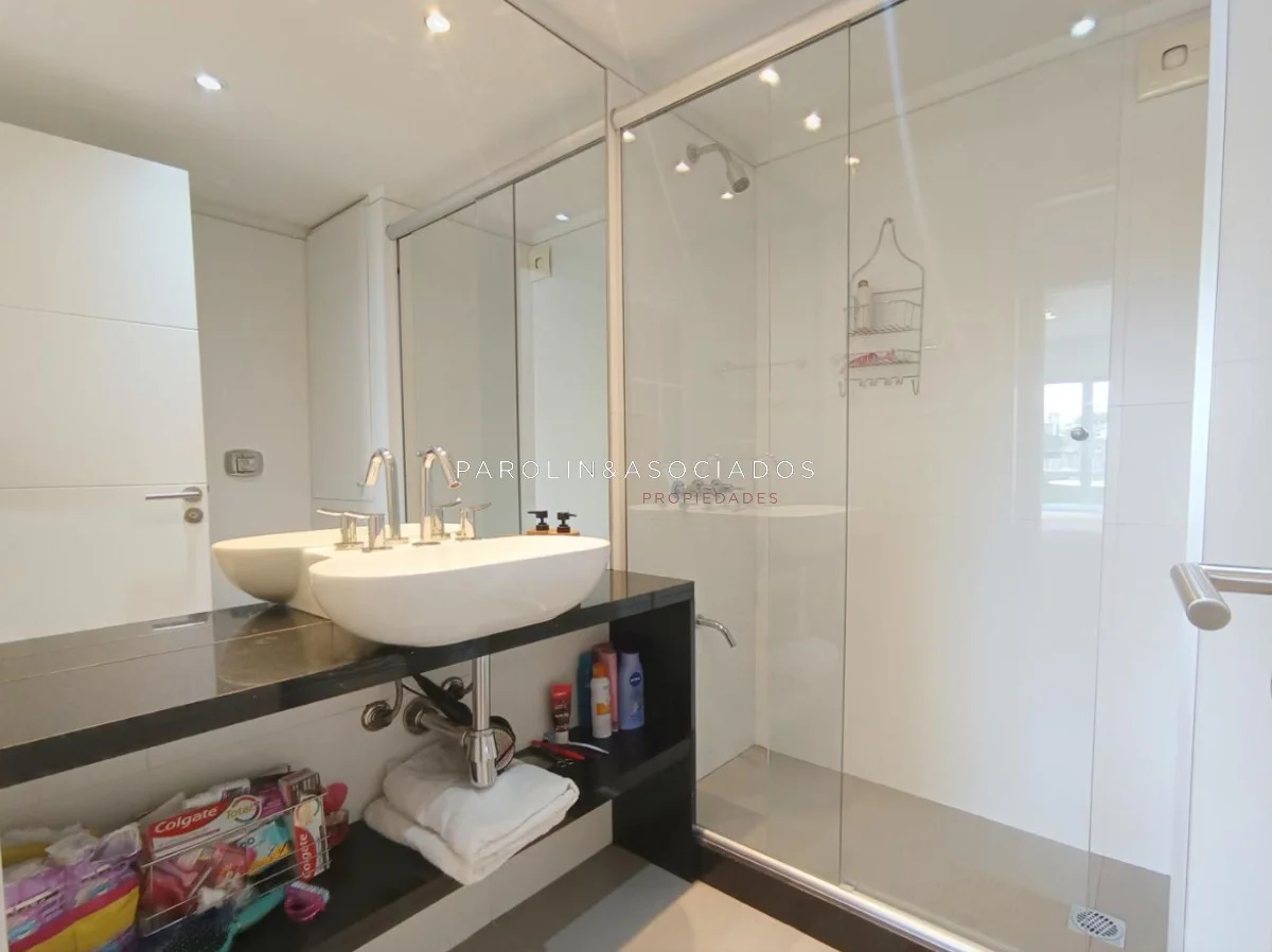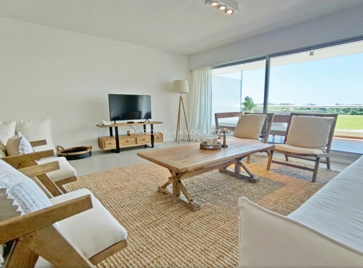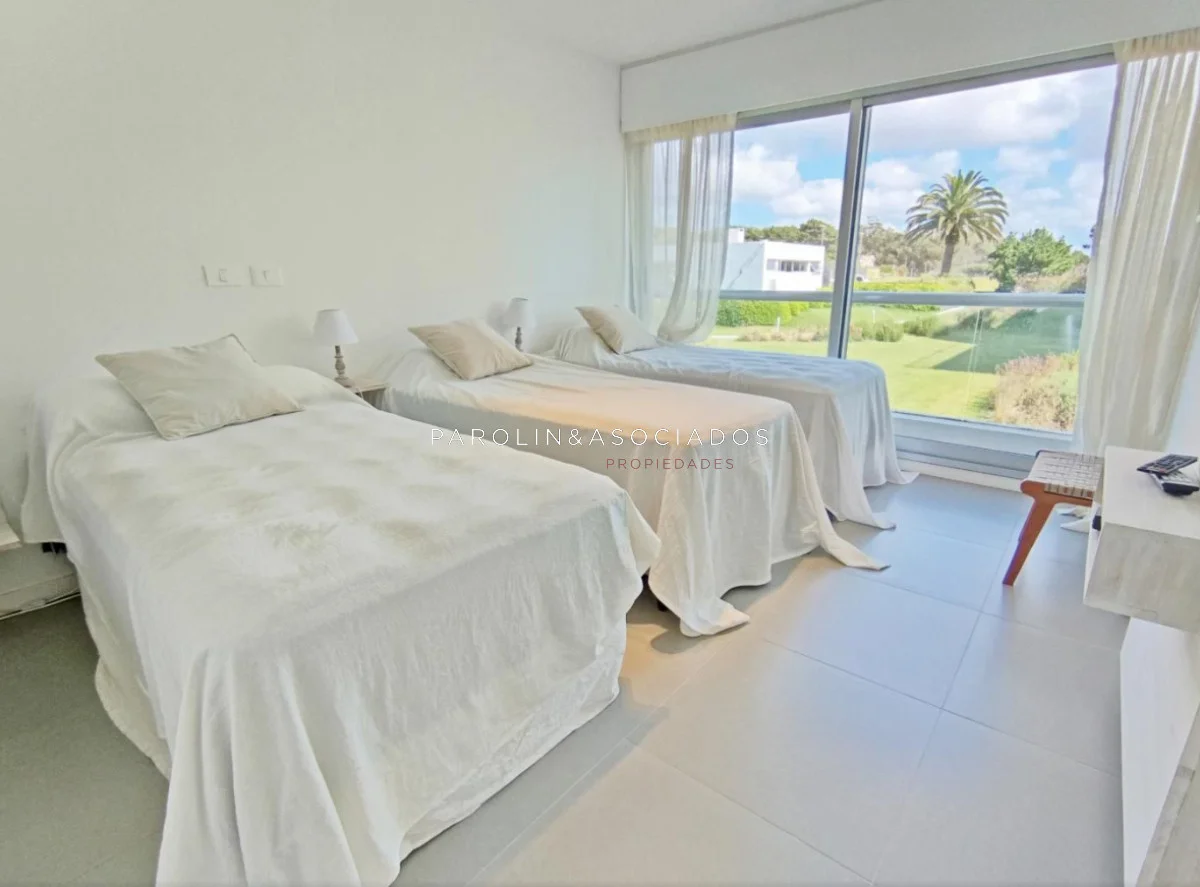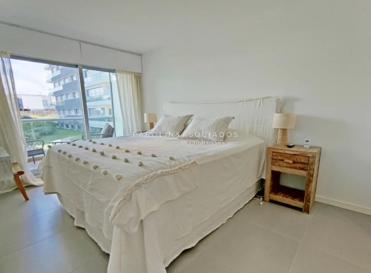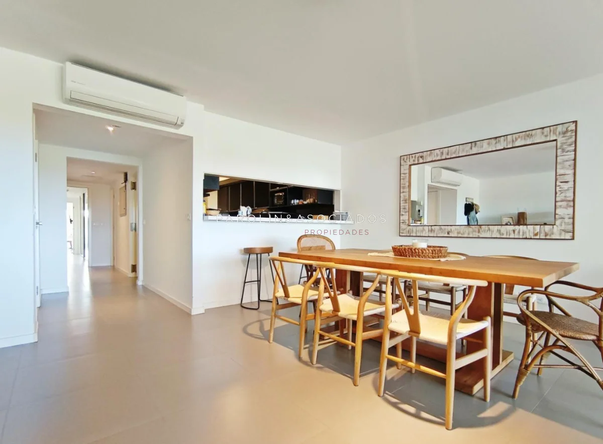 Amplio living-comedor con salida a la terraza, vista al mar, cocina con pasa platos, toilette, 2 cómodas suites con vestidor, dormitorio ppal con teraza vista al parque. Losa radiante sectorizada, aire acondicionado. Garaje doble. Complejo frente al mar con completos amenities de categoría.