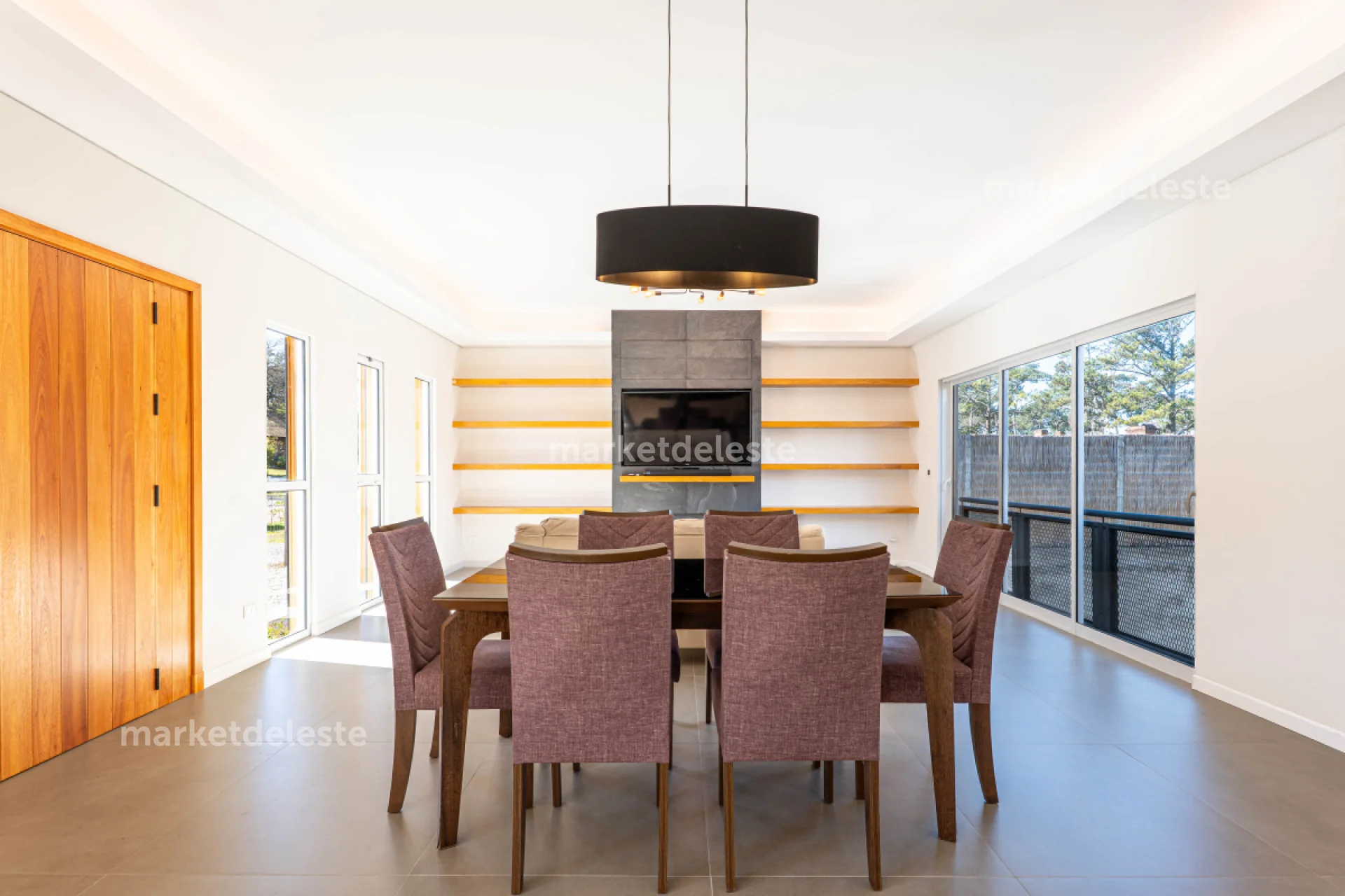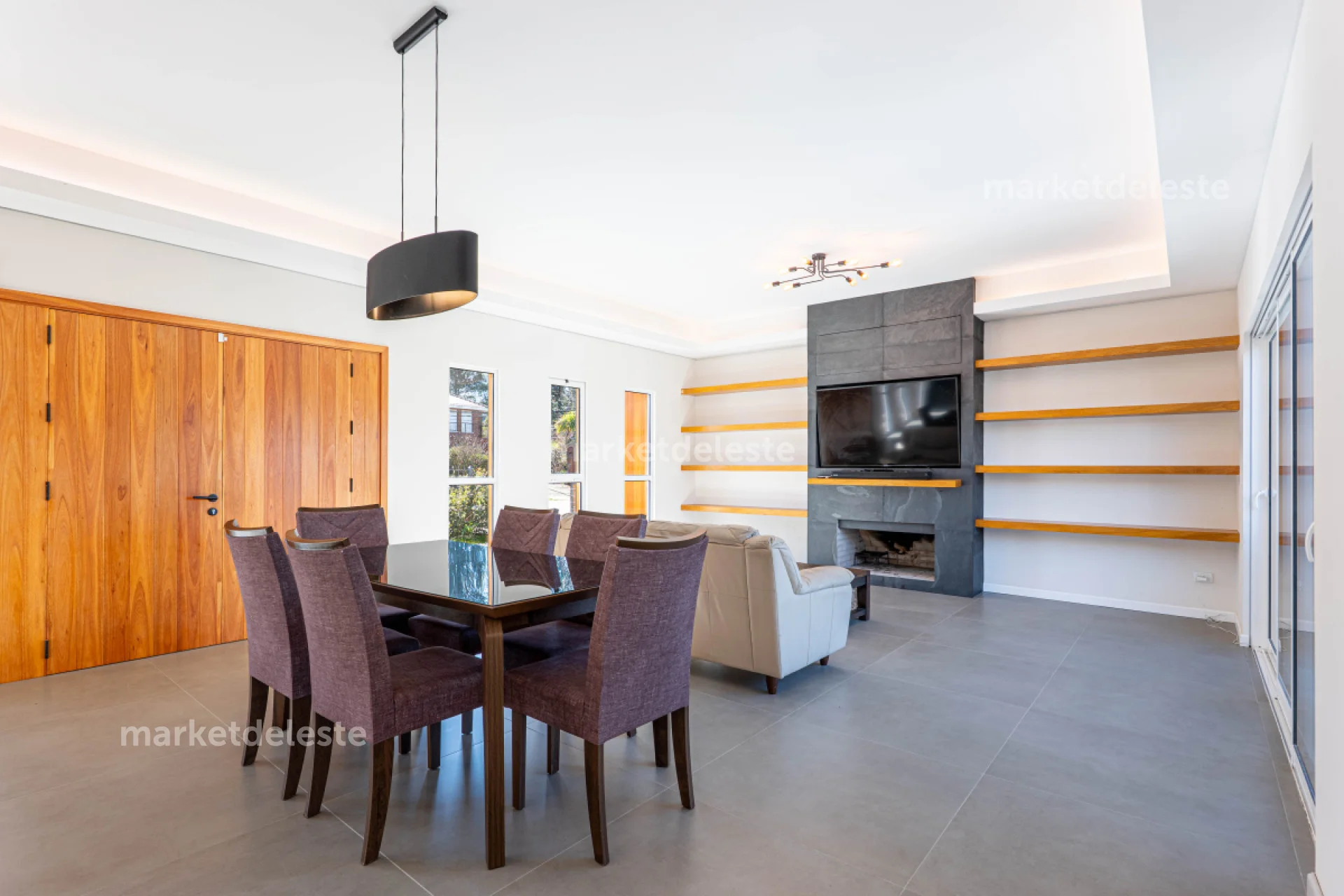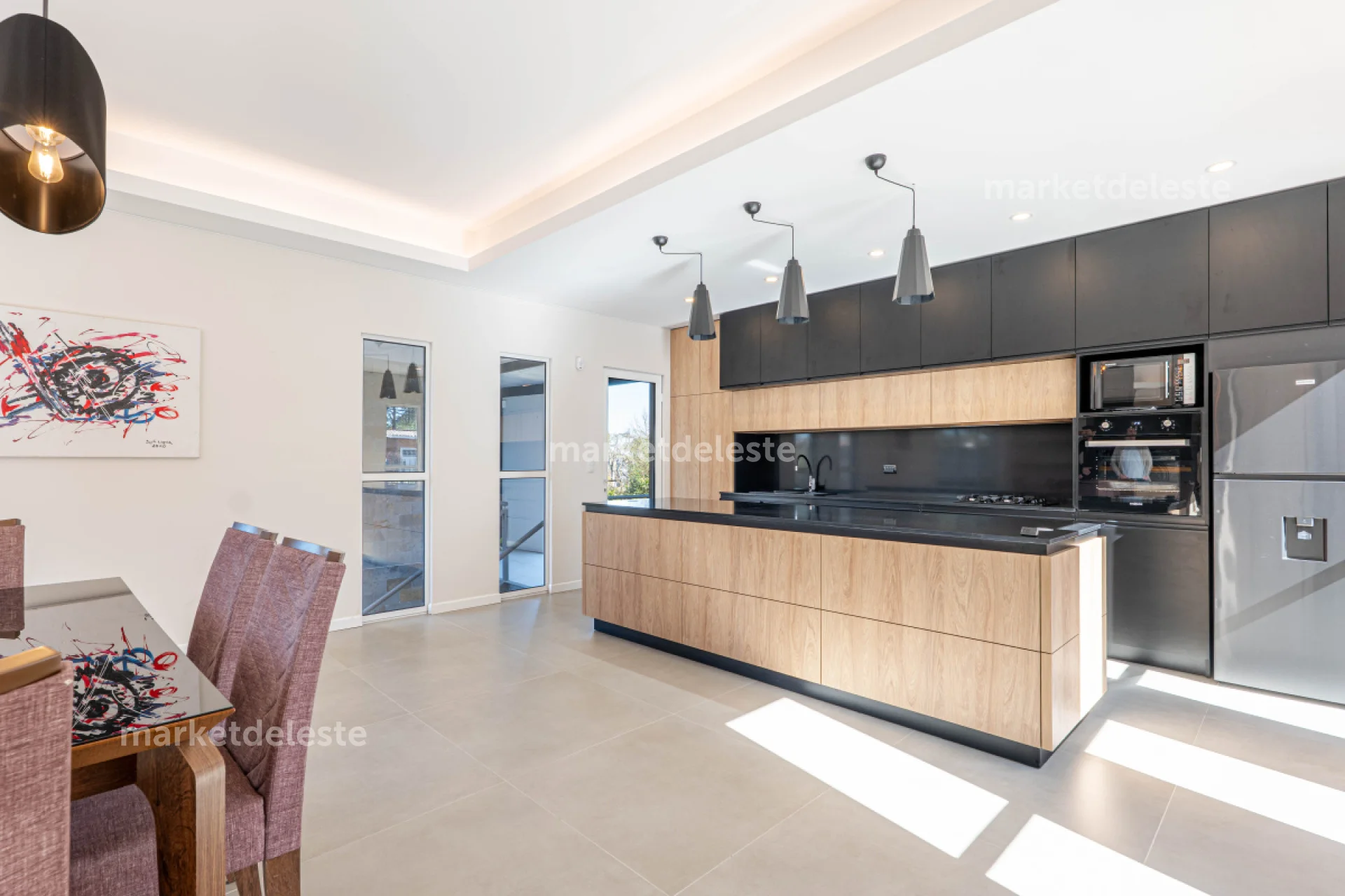 En planta alta (nivel calle) cuenta con el living-comedor, con estufa a leña y aire acondicionado, cocina integrada (toda en negro) con isla de 3 metros de largo, lavadero, un estudio-estar TV, la suite principal con su walk-in closet, lavadero y baño social.