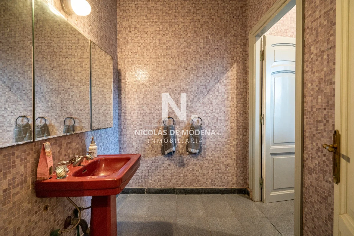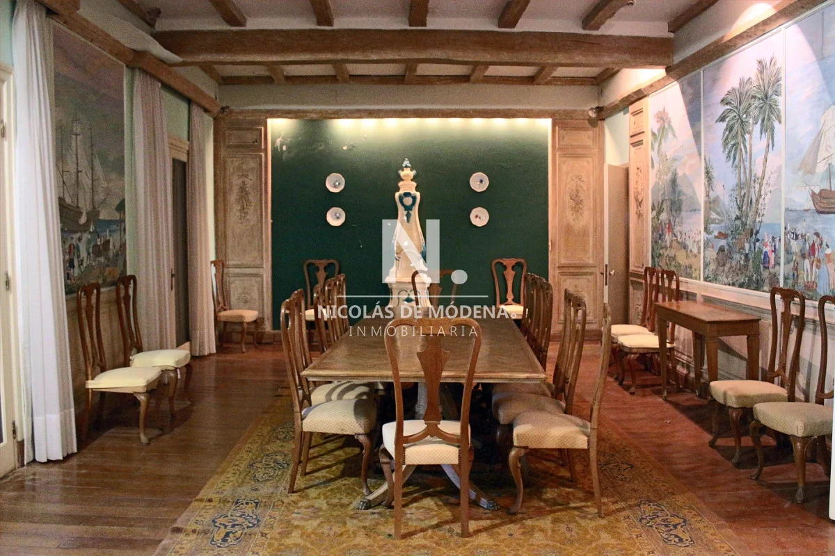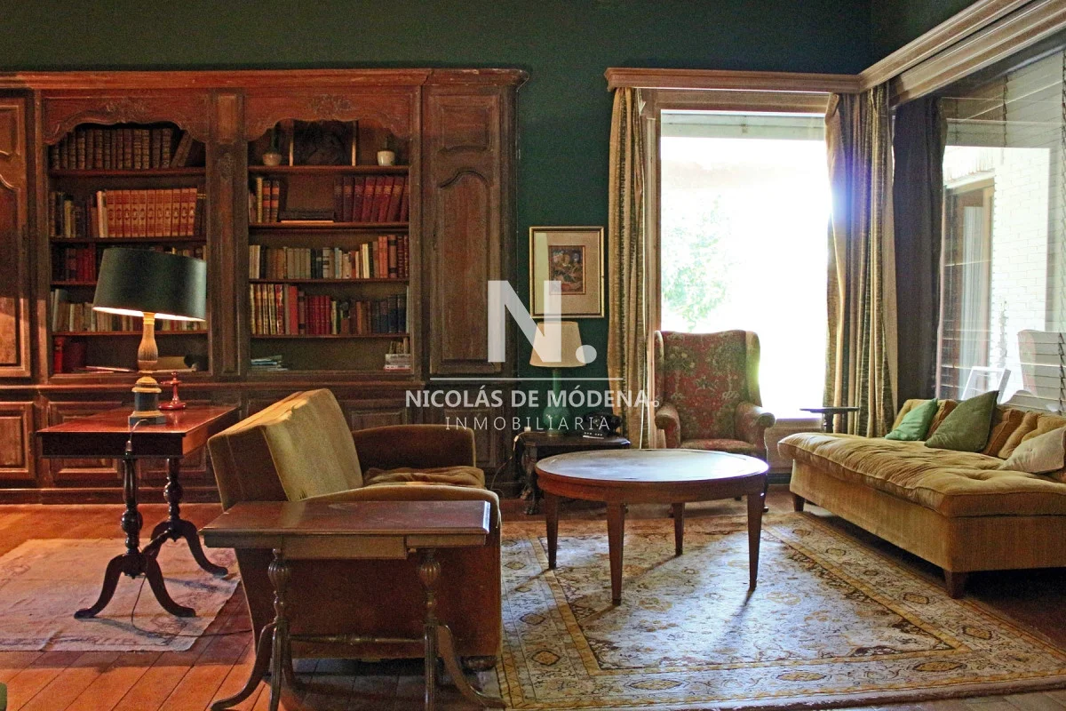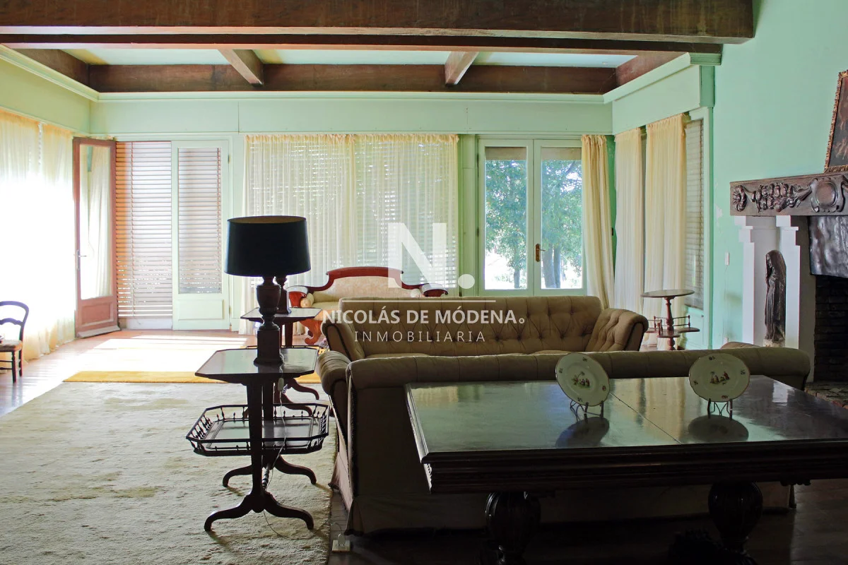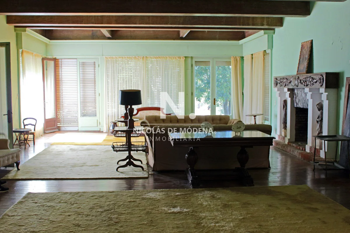 En la planta baja, la distribución incluye 5 dormitorios, 3 baños, 2 dependencias de servicio y un departamento de caseros, junto con una cocina pequeña, un toilette, un despojador y un comedor diario. El área de living destaca con una estufa a leña, equipado con una estufa noruega de cerámica, aportan un sentido de sofisticación y calidez. La cocina principal, espaciosa y funcional, se divide en tres áreas, incluyendo una alacena para almacenamiento adicional.