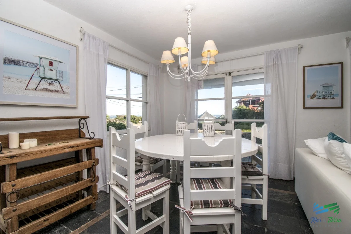 Distribuida en dos cómodas plantas. Ubicándose en la primera: living comedor amplio y luminoso al frente con salida al porche de entrada y vista al mar, toilette de visitas, cocina definida con acceso al jardín y dormitorio de servicio con baño. En planta alta se encuentran tres cómodos dormitorios, dos baños completos, el principal en suite con salida al balcón y vista a la playa.