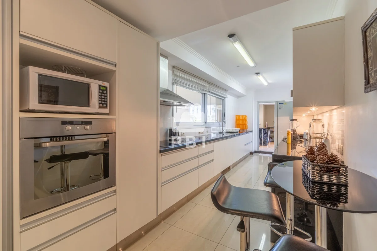El comedor integrado tiene capacidad para 8 personas y se une a una cocina definida, equipada con electrodomésticos de alta gama y un desayunador diario. La cocina también cuenta con una práctica dependencia de servicio con área de lavado.